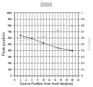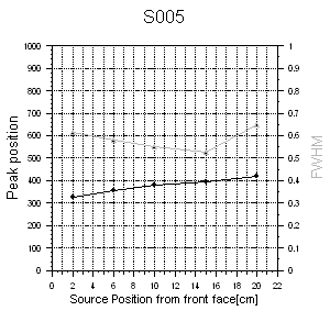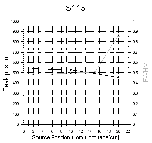 Following pictures show the peak centers and relative FWHM along the center axis for three CsI crystals with the serial numbers S003, S005 and S113, repectively. The result of the 137Cs measurement (left side) is compared with the corresponding data from the tomography (right side).