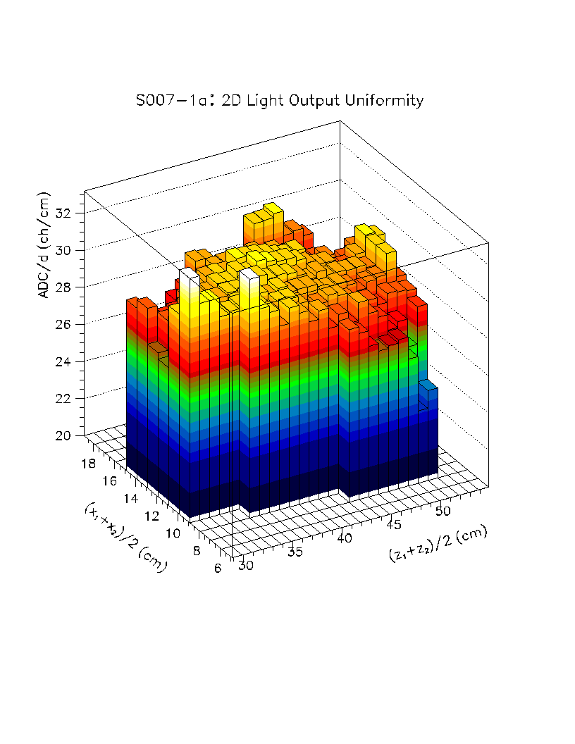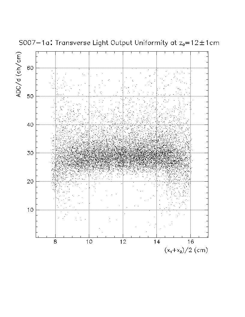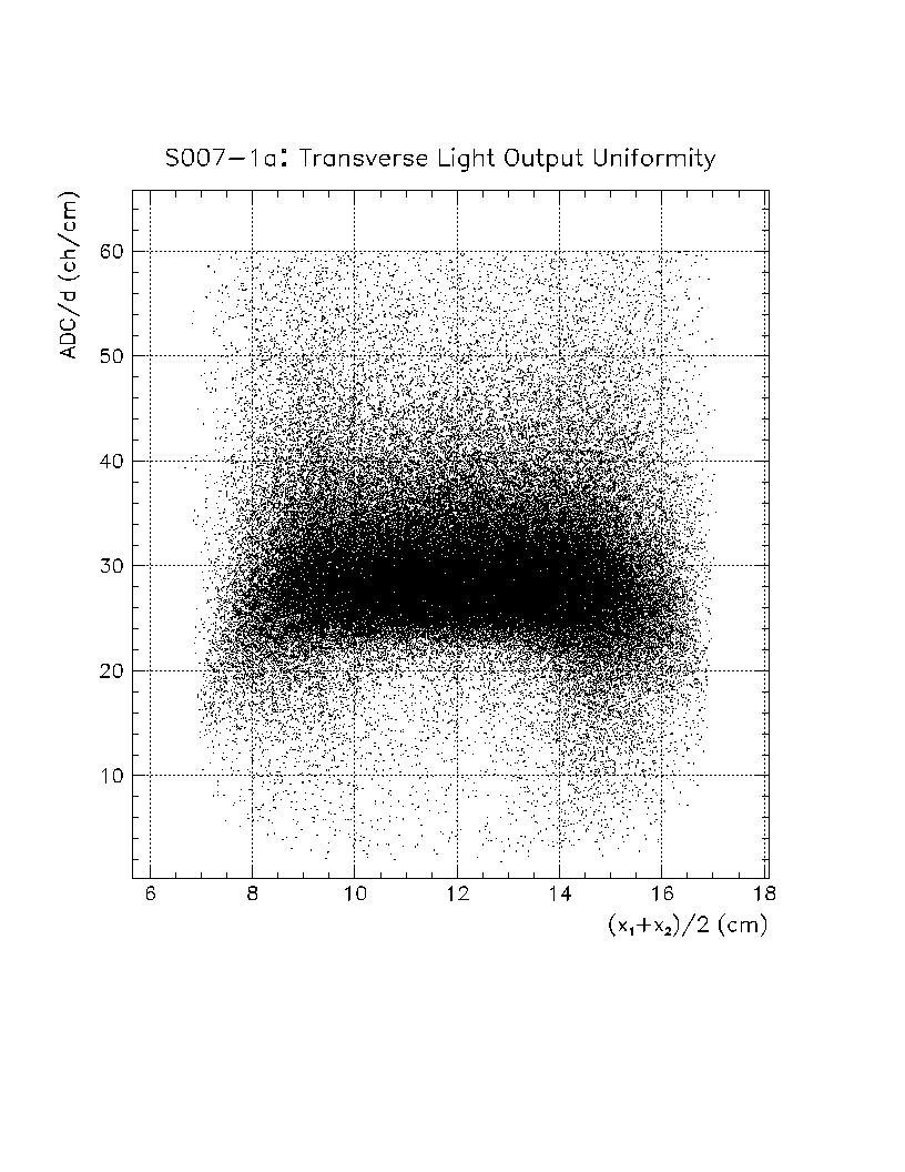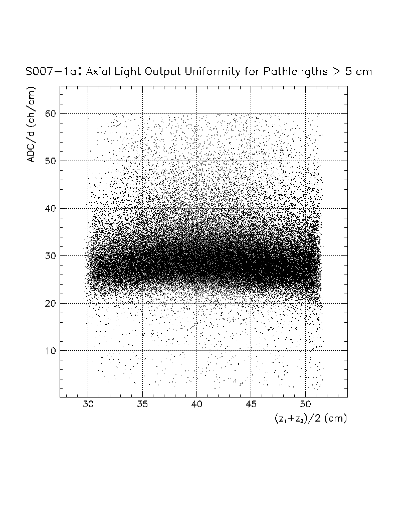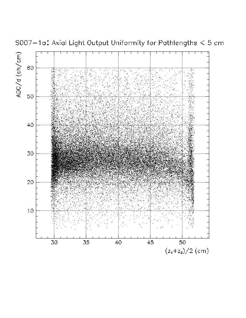 Light output per unit pathlength in the crystal (s/d) is plotted as a function of z-position in the crystal. The front face of the crystal corresponds to z=0 cm, while the back of the crystal is z=22 cm. The nonuniformity constant is equal to the slope of this scatter plot, divided by the average value of s/d in the region of interest. Using this definition, a negative axial nonuniformity corresponds to a decreasing value of s/d from z=0 to s=22 cm.