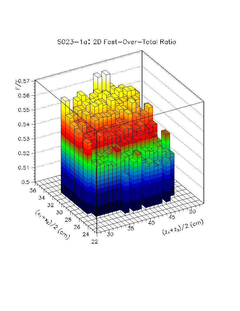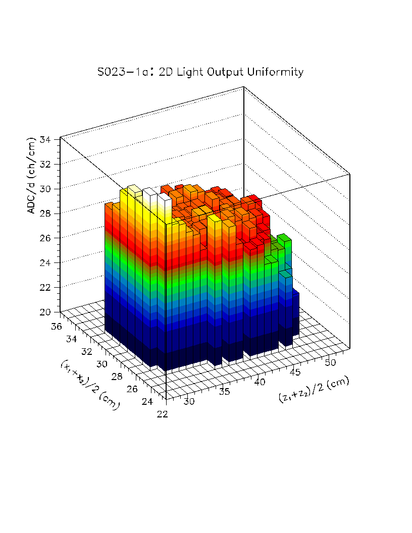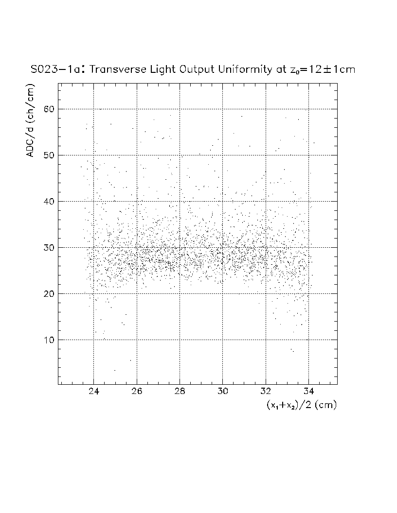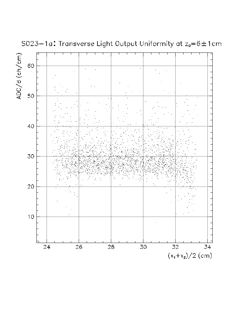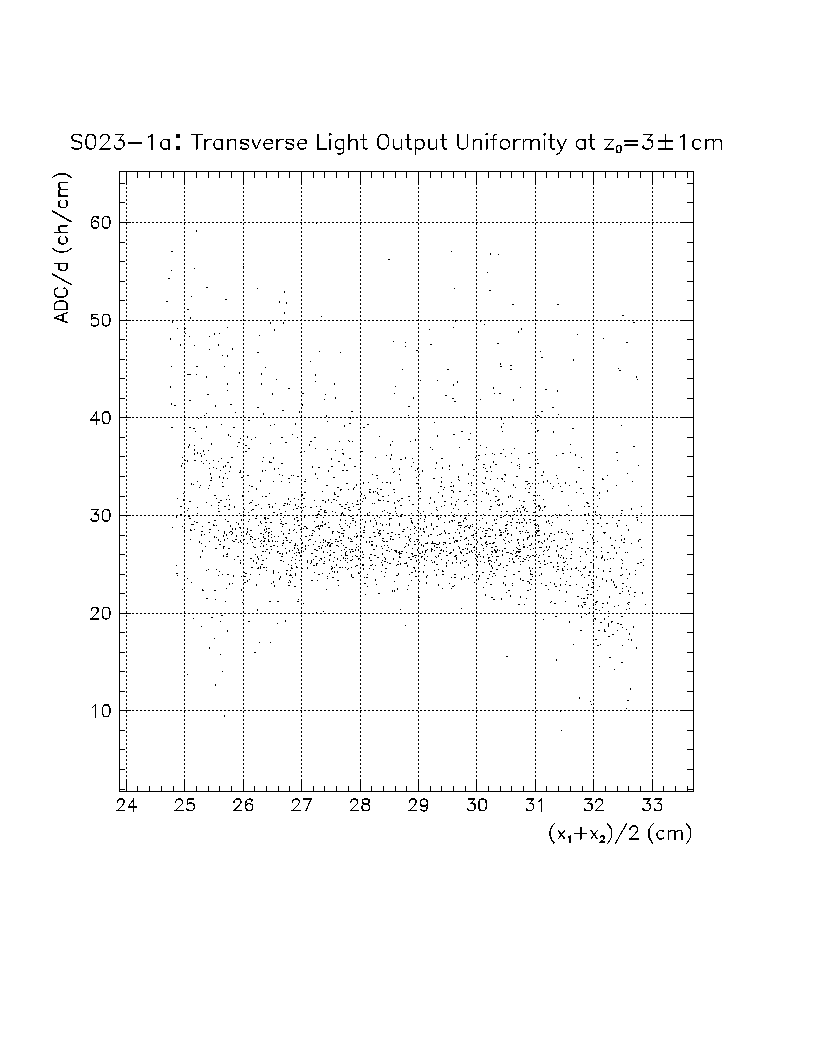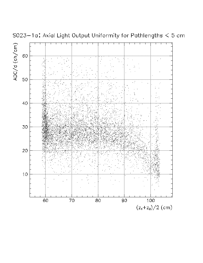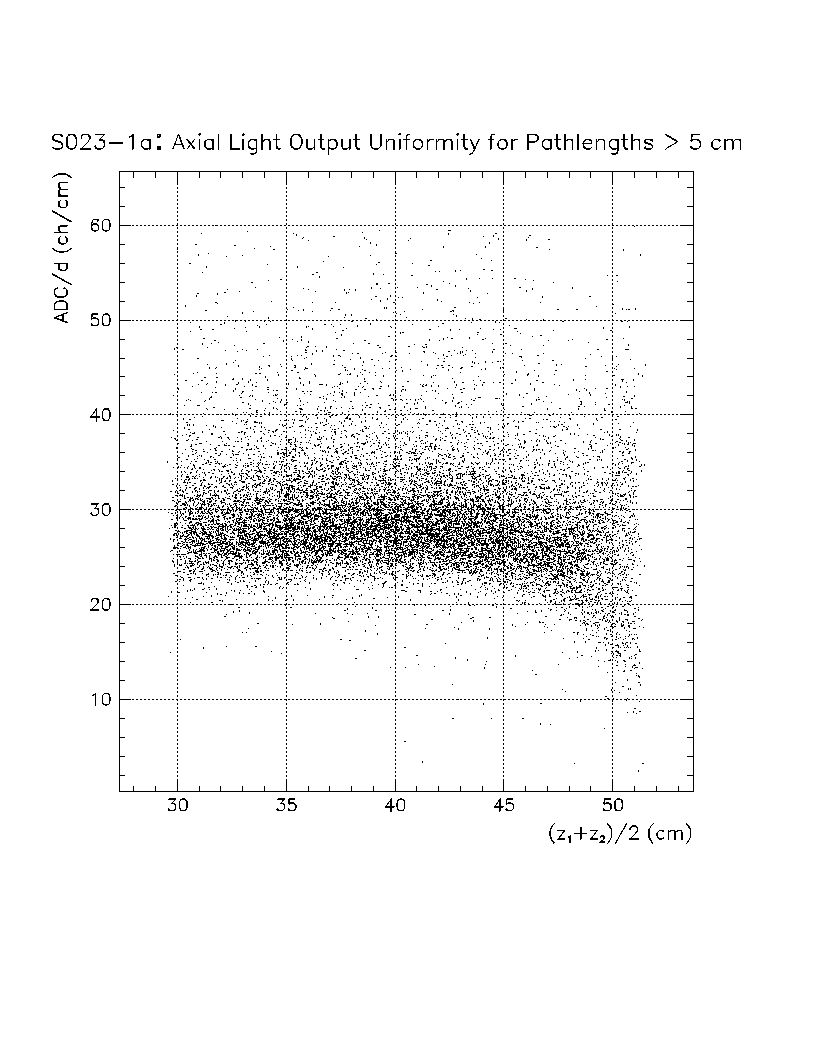 Light output per unit pathlength in the crystal (s/d) is plotted as a function of z-position in the crystal. The front face of the crystal corresponds to z=0 cm, while the back of the crystal is z=22 cm. The nonuniformity constant is equal to the slope of this scatter plot, divided by the average value of s/d in the region of interest. Using this definition, a negative axial nonuniformity corresponds to a decreasing value of s/d from z=0 to s=22 cm.