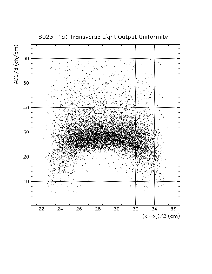 "s/d" is plotted as a function of x-position in the crystal. Looking at the back face of the crystal, the positive x-axis points to the right. The nonuniformity constant is equal to the slope of the scatter plot, divided by the average value of s/d in the region of interest. A negative transverse nonuniformity on the right side of the crystal corresponds to a decreasing value of s/d from the center to the edge of the crystal, while a positive transverse nonuniformity on the left side of the crystal means that s/d increases toward the center.