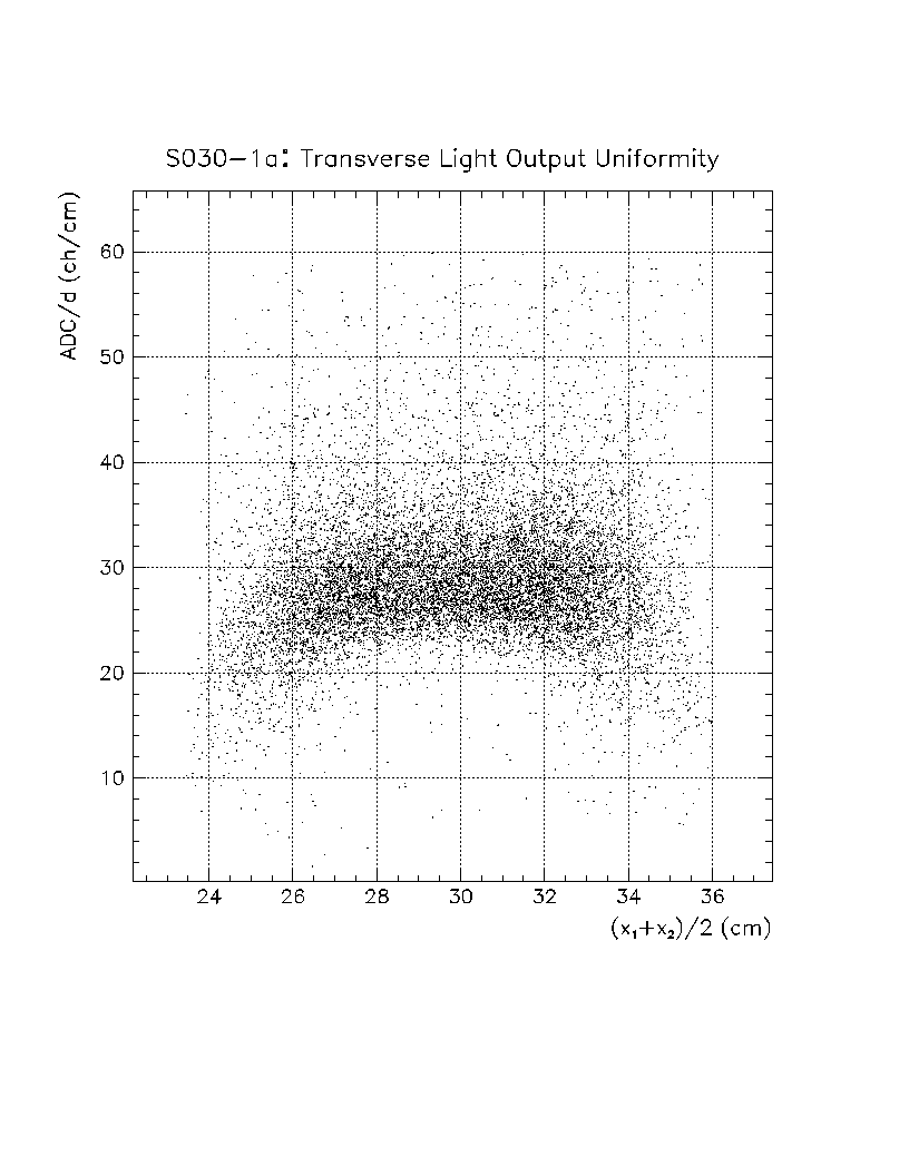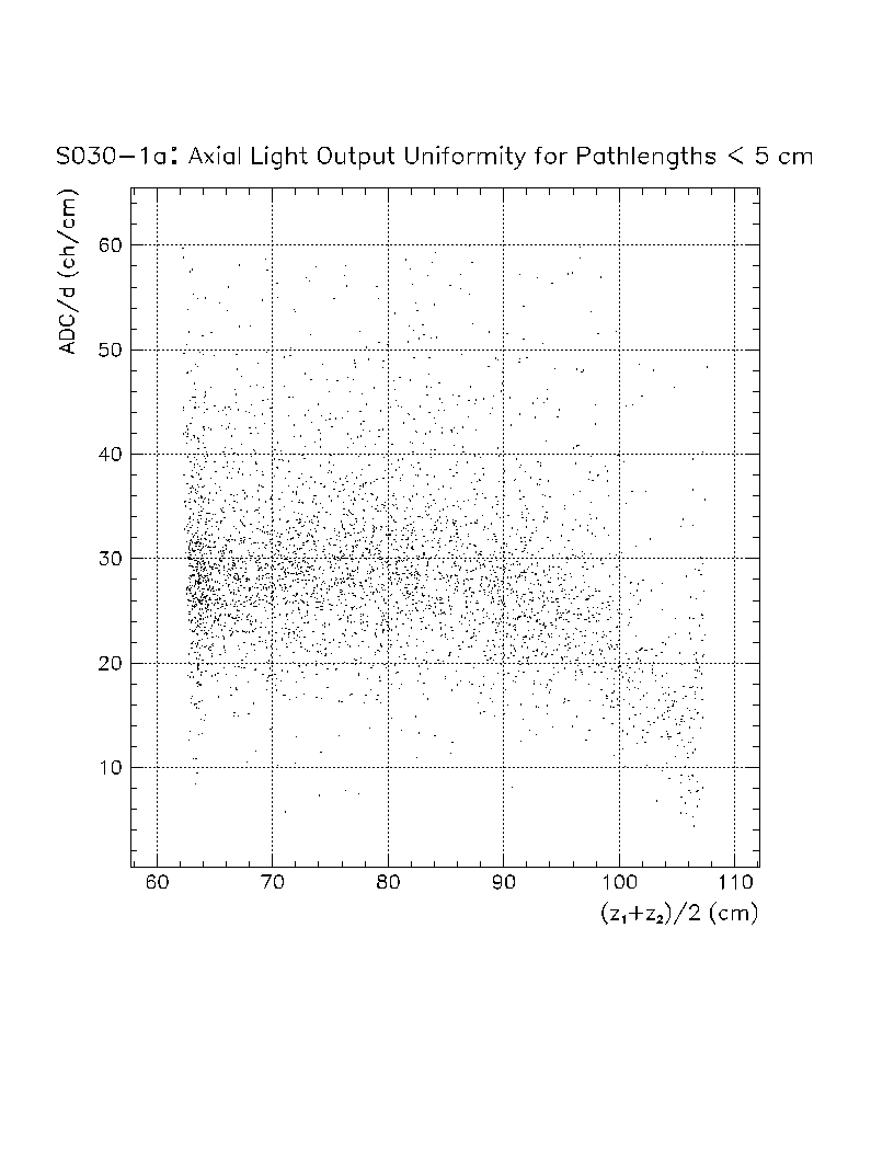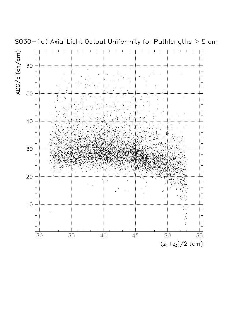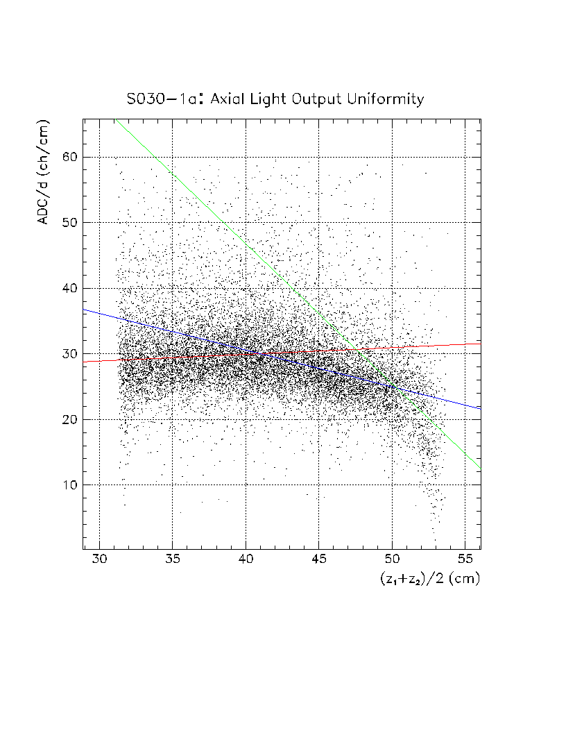 Light output per unit pathlength in the crystal (s/d) is plotted as a function of z-position in the crystal. The front face of the crystal corresponds to z=0 cm, while the back of the crystal is z=22 cm. The nonuniformity constant is equal to the slope of this scatter plot, divided by the average value of s/d in the region of interest. Using this definition, a negative axial nonuniformity corresponds to a decreasing value of s/d from z=0 to s=22 cm.
