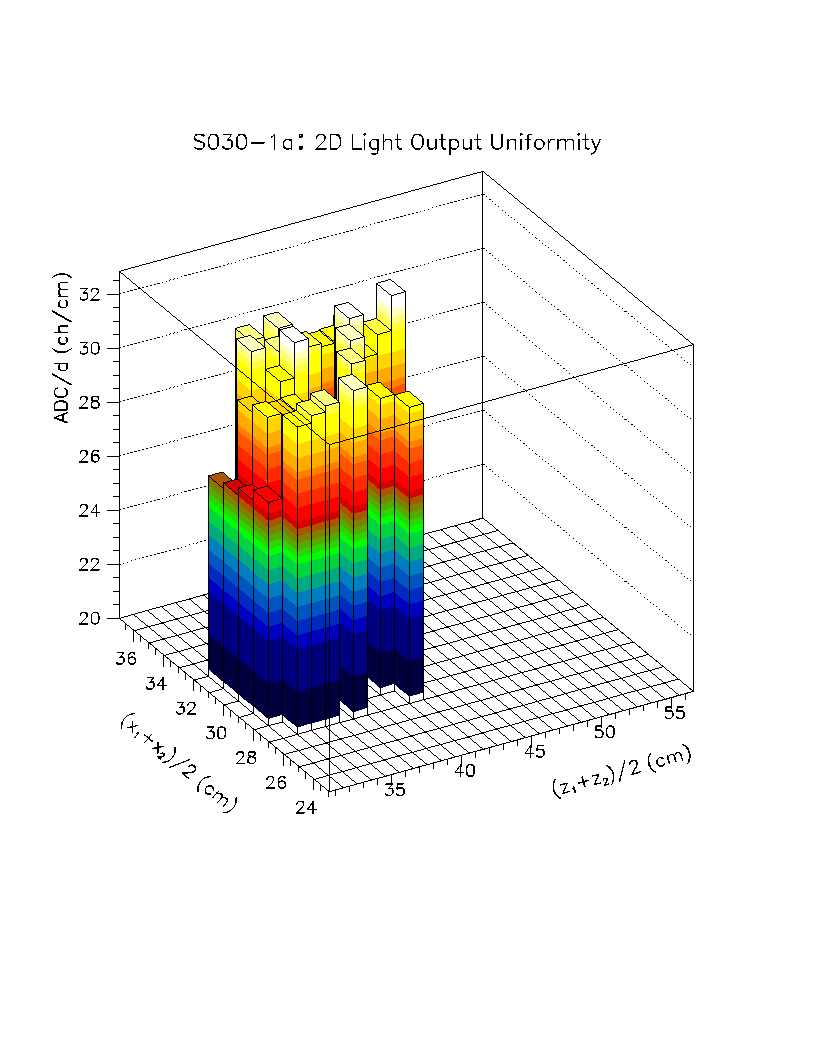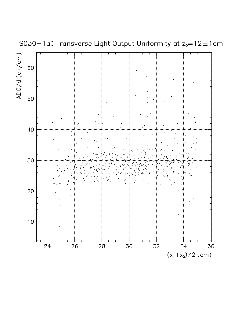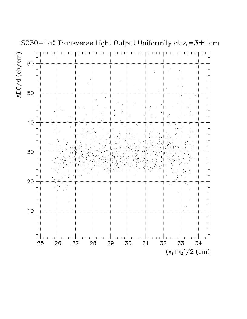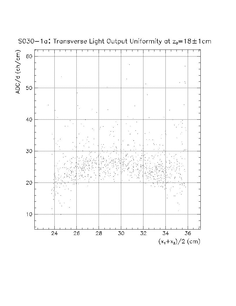 Light output per unit pathlength in the crystal (s/d) is plotted as a function of z-position in the crystal. The front face of the crystal corresponds to z=0 cm, while the back of the crystal is z=22 cm. The nonuniformity constant is equal to the slope of this scatter plot, divided by the average value of s/d in the region of interest. Using this definition, a negative axial nonuniformity corresponds to a decreasing value of s/d from z=0 to s=22 cm.
