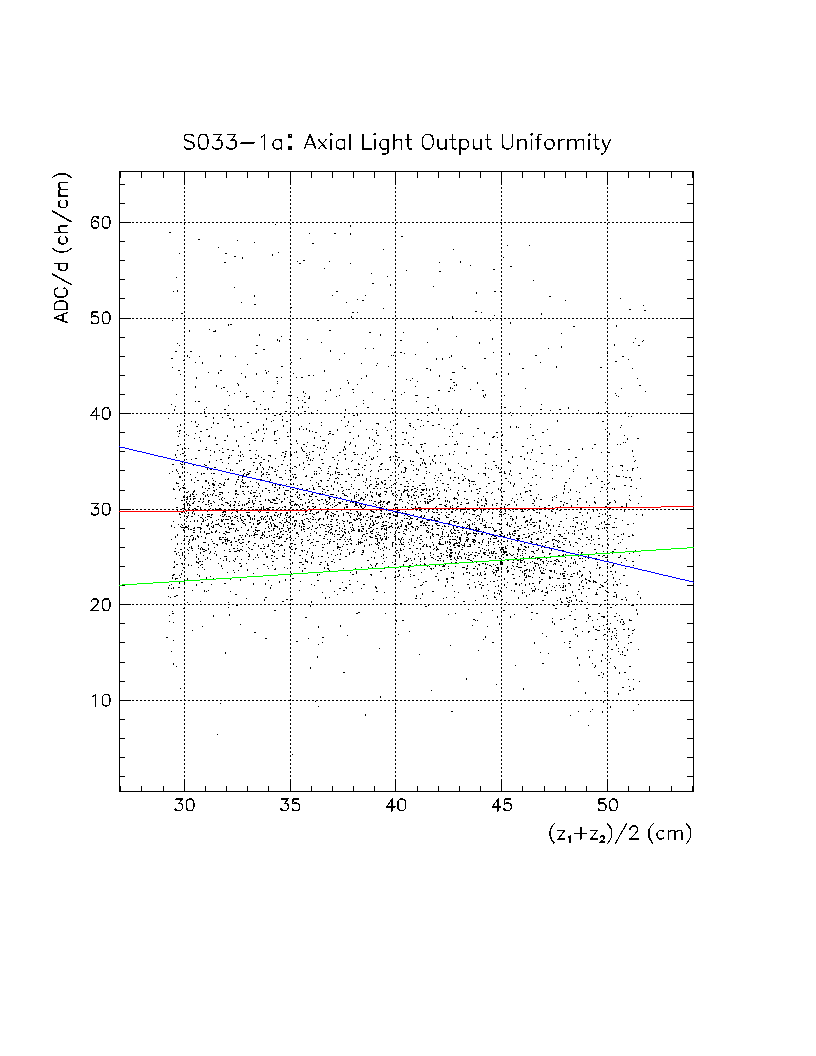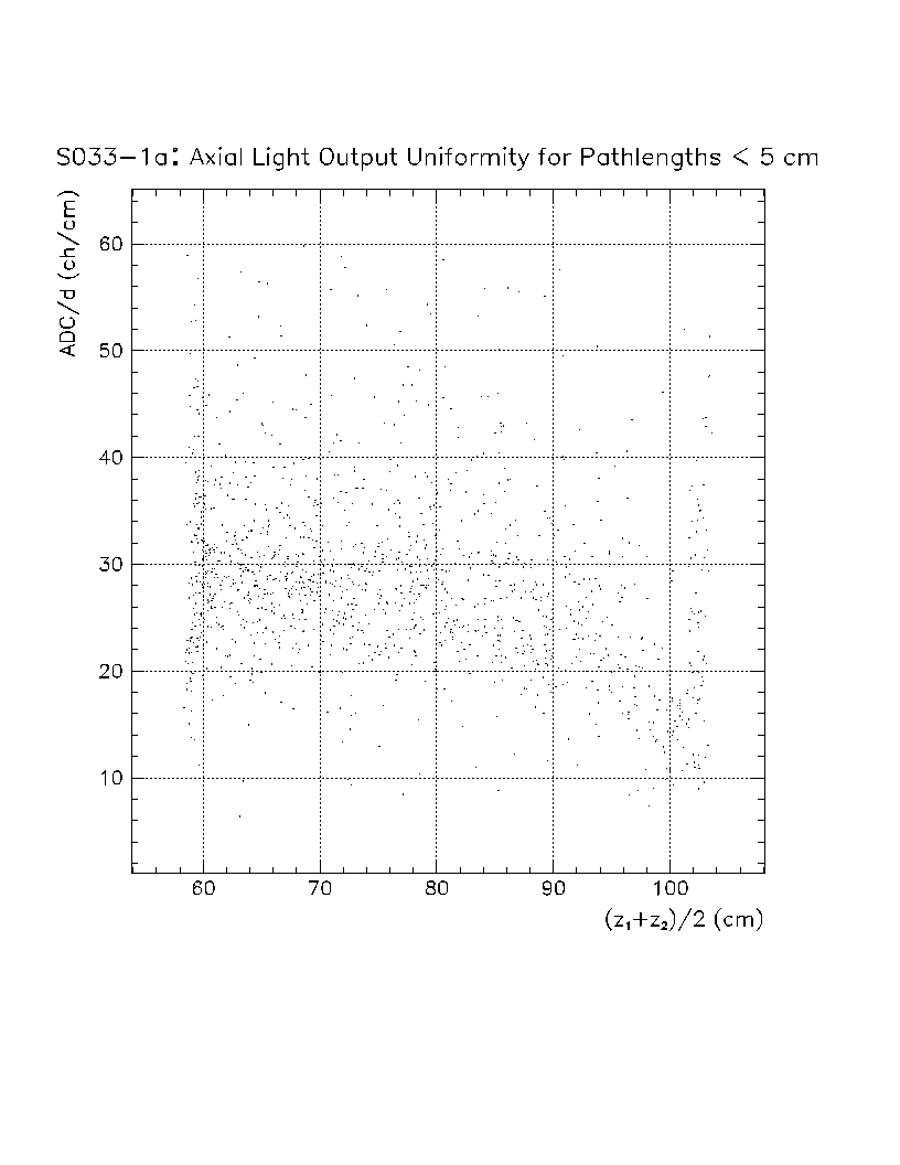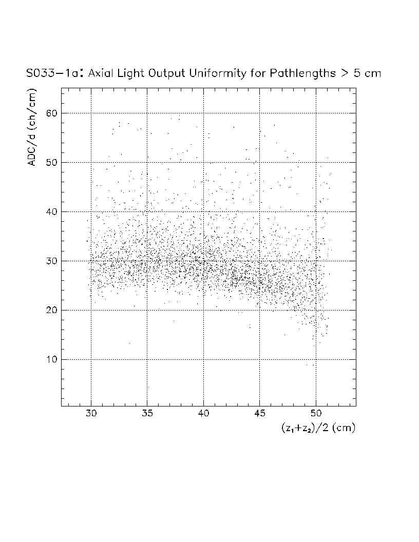 Light output per unit pathlength in the crystal (s/d) is plotted as a function of z-position in the crystal. The front face of the crystal corresponds to z=0 cm, while the back of the crystal is z=22 cm. The nonuniformity constant is equal to the slope of this scatter plot, divided by the average value of s/d in the region of interest. Using this definition, a negative axial nonuniformity corresponds to a decreasing value of s/d from z=0 to s=22 cm.
