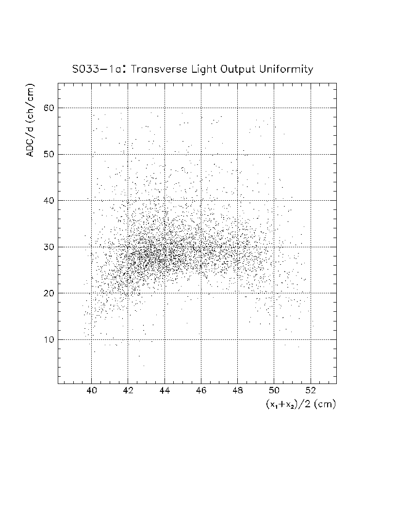 "s/d" is plotted as a function of x-position in the crystal. Looking at the back face of the crystal, the positive x-axis points to the right. The nonuniformity constant is equal to the slope of the scatter plot, divided by the average value of s/d in the region of interest. A negative transverse nonuniformity on the right side of the crystal corresponds to a decreasing value of s/d from the center to the edge of the crystal, while a positive transverse nonuniformity on the left side of the crystal means that s/d increases toward the center.
