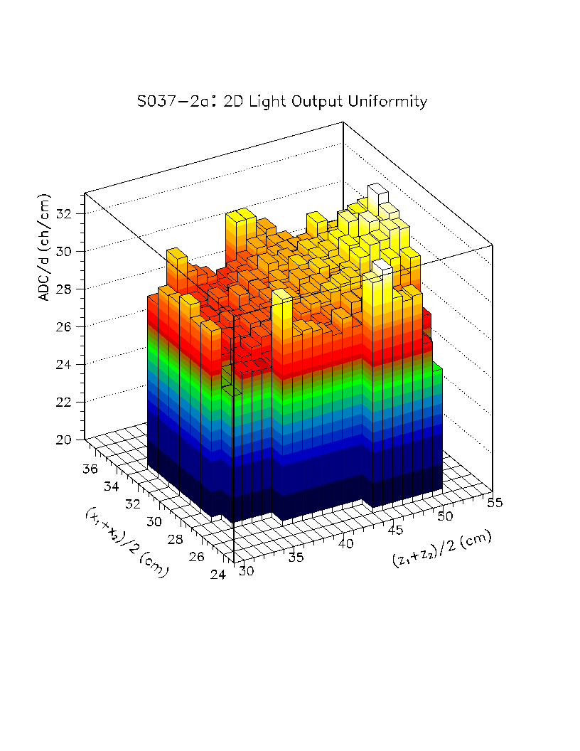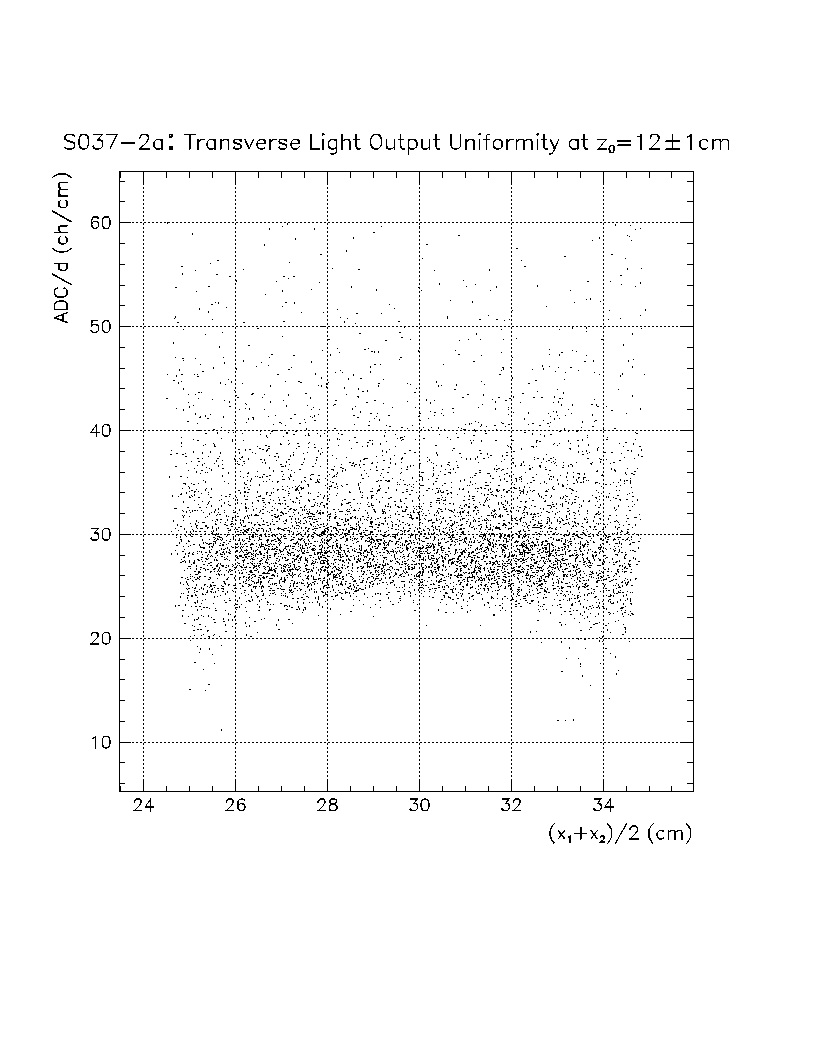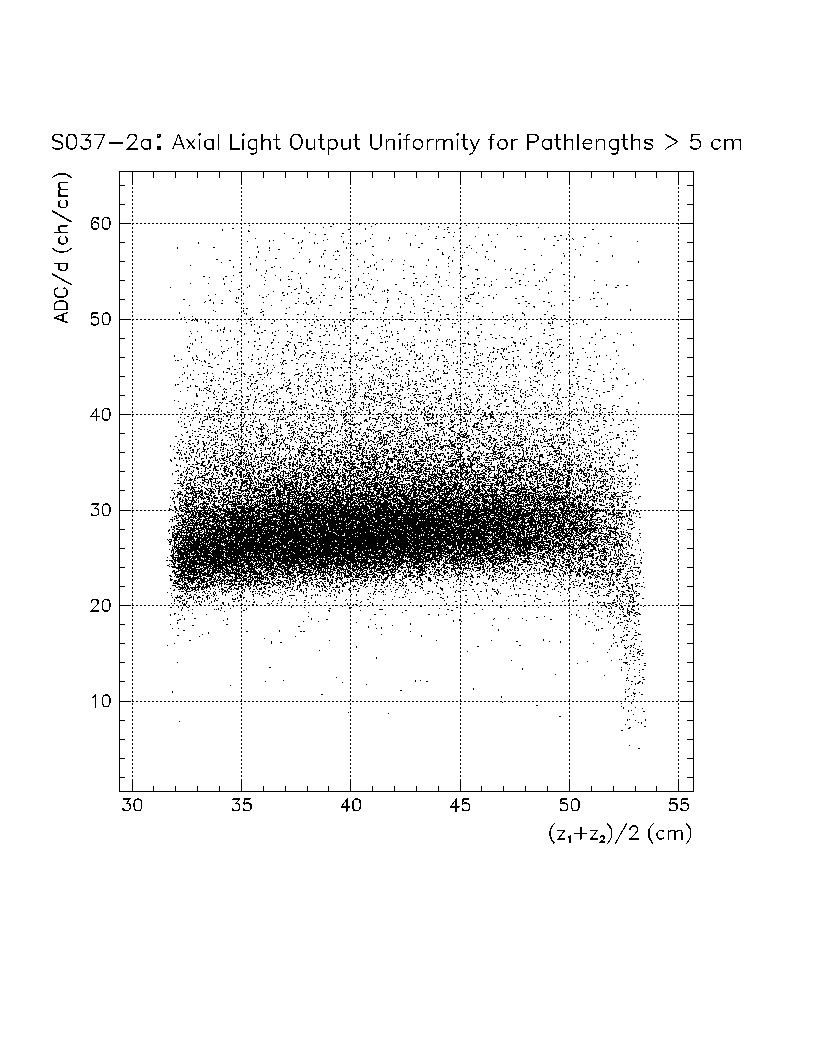 Light output per unit pathlength in the crystal (s/d) is plotted as a function of z-position in the crystal. The front face of the crystal corresponds to z=0 cm, while the back of the crystal is z=22 cm. The nonuniformity constant is equal to the slope of this scatter plot, divided by the average value of s/d in the region of interest. Using this definition, a negative axial nonuniformity corresponds to a decreasing value of s/d from z=0 to s=22 cm.