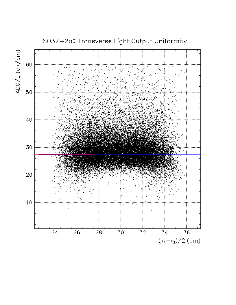 "s/d" is plotted as a function of x-position in the crystal. Looking at the back face of the crystal, the positive x-axis points to the right. The nonuniformity constant is equal to the slope of the scatter plot, divided by the average value of s/d in the region of interest. A negative transverse nonuniformity on the right side of the crystal corresponds to a decreasing value of s/d from the center to the edge of the crystal, while a positive transverse nonuniformity on the left side of the crystal means that s/d increases toward the center.