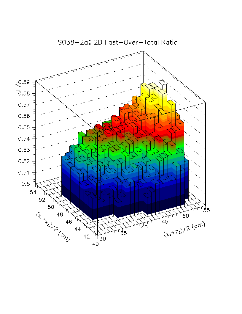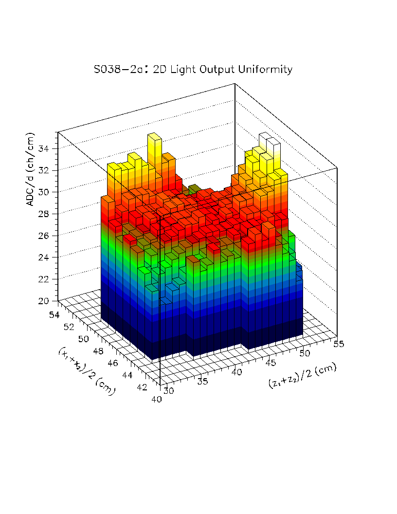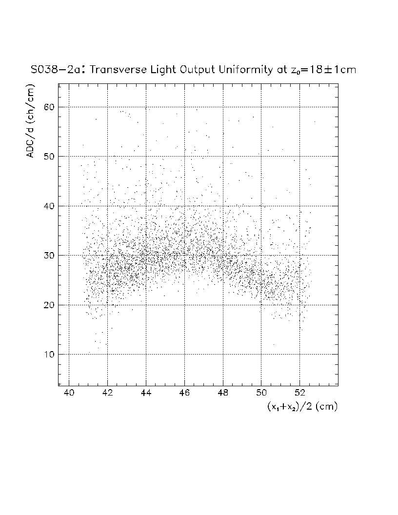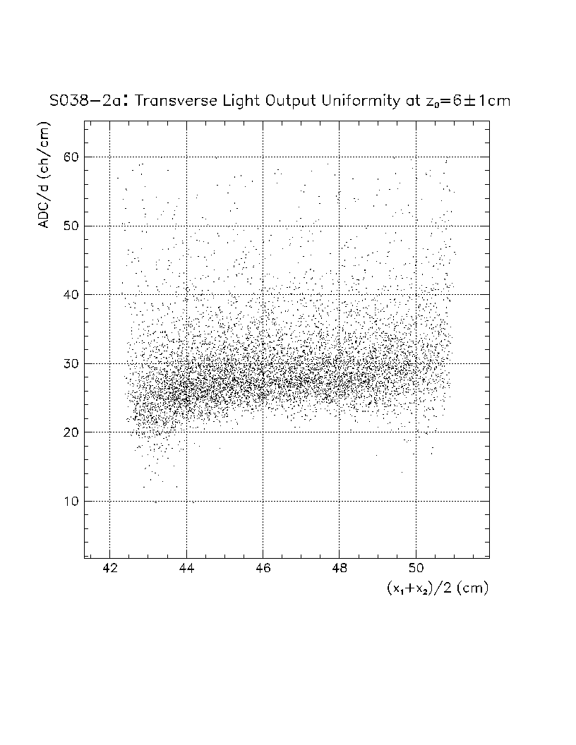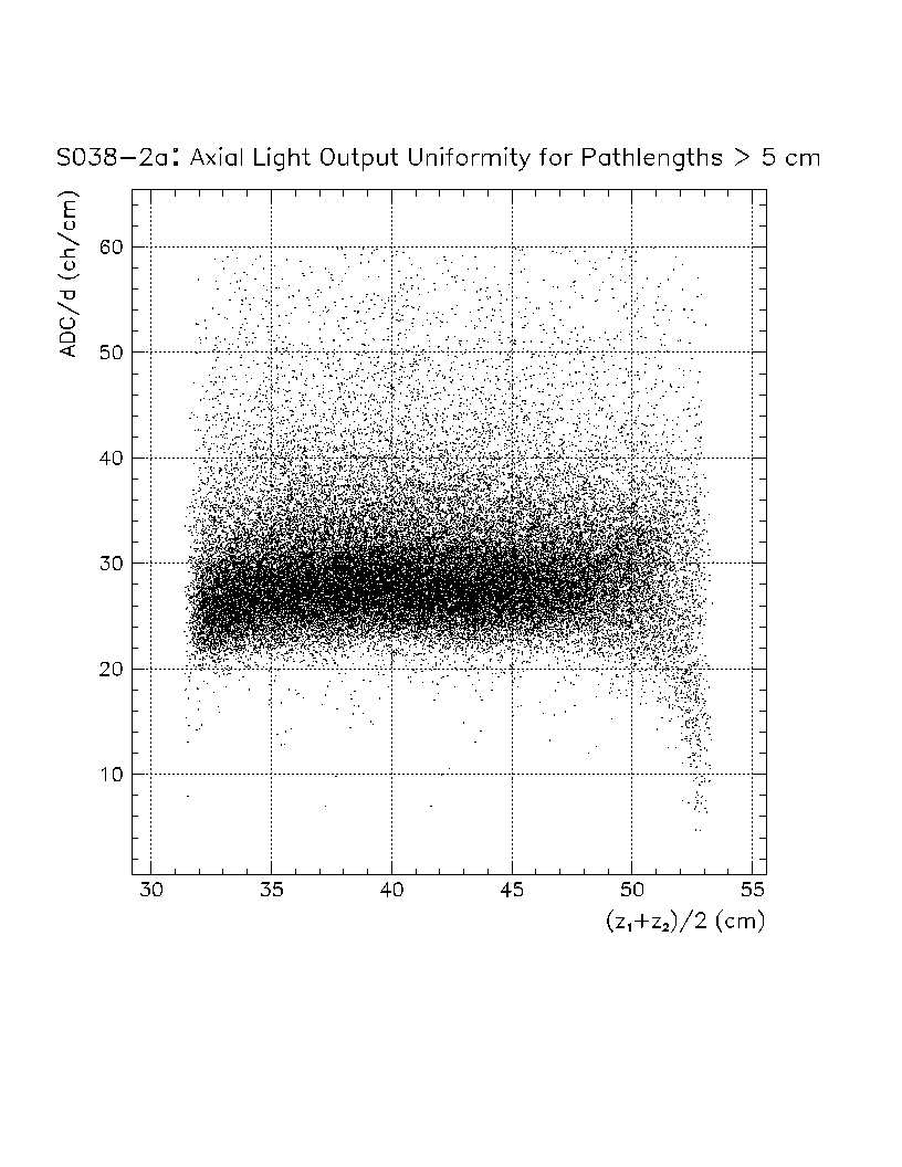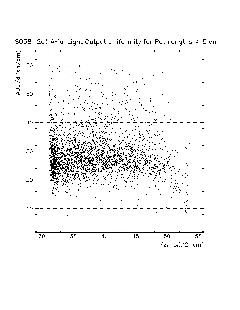 Light output per unit pathlength in the crystal (s/d) is plotted as a function of z-position in the crystal. The front face of the crystal corresponds to z=0 cm, while the back of the crystal is z=22 cm. The nonuniformity constant is equal to the slope of this scatter plot, divided by the average value of s/d in the region of interest. Using this definition, a negative axial nonuniformity corresponds to a decreasing value of s/d from z=0 to s=22 cm.