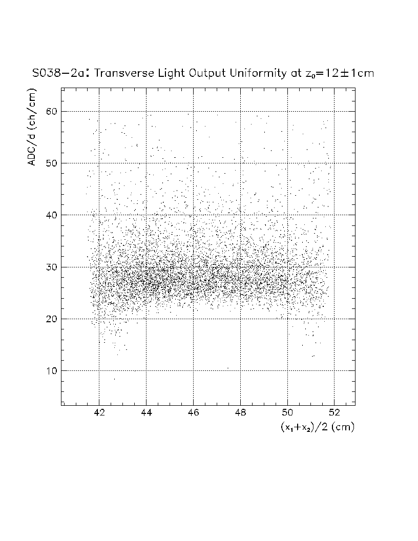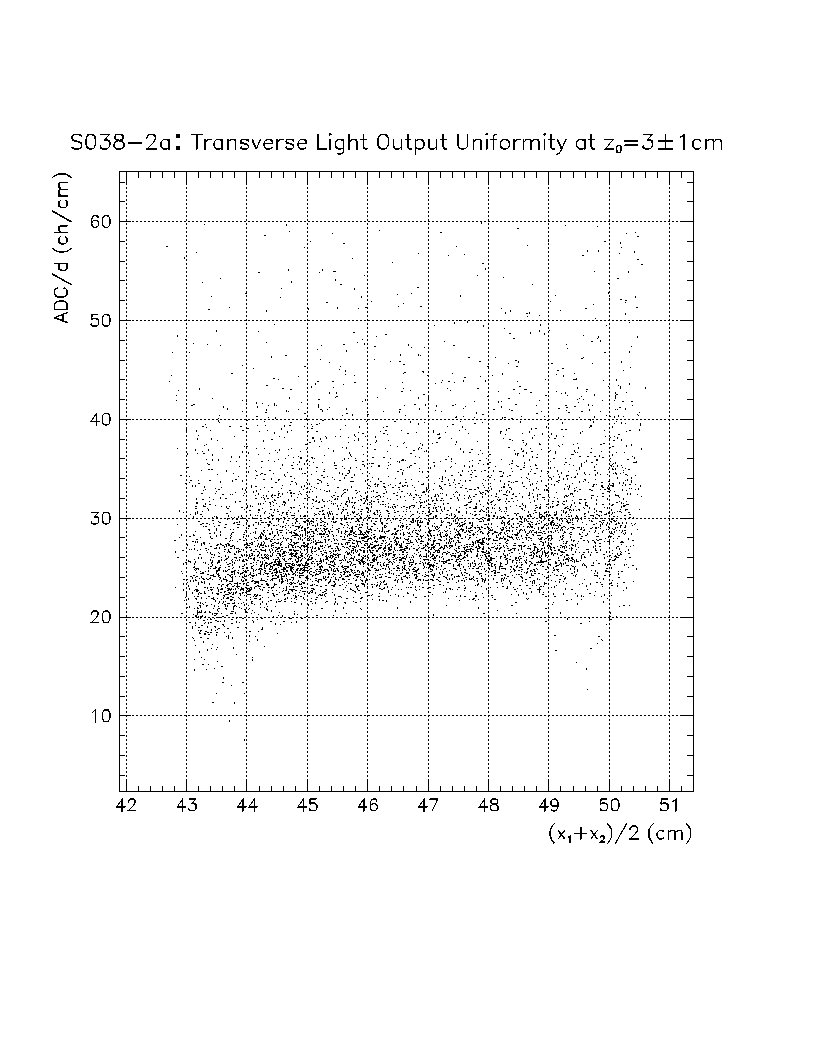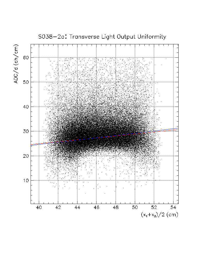 "s/d" is plotted as a function of x-position in the crystal. Looking at the back face of the crystal, the positive x-axis points to the right. The nonuniformity constant is equal to the slope of the scatter plot, divided by the average value of s/d in the region of interest. A negative transverse nonuniformity on the right side of the crystal corresponds to a decreasing value of s/d from the center to the edge of the crystal, while a positive transverse nonuniformity on the left side of the crystal means that s/d increases toward the center.