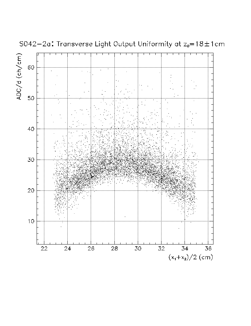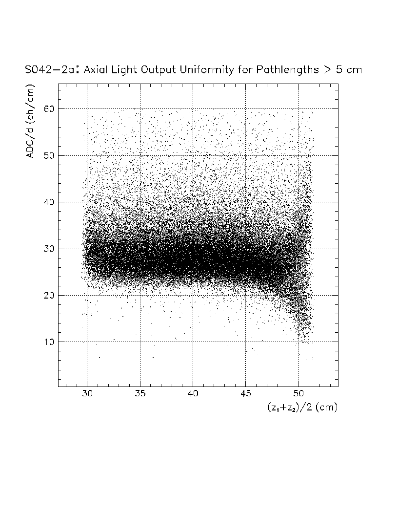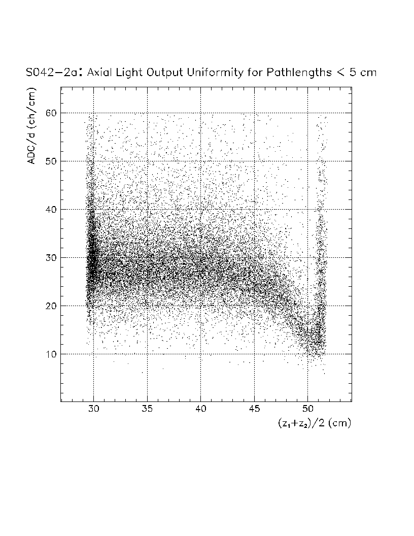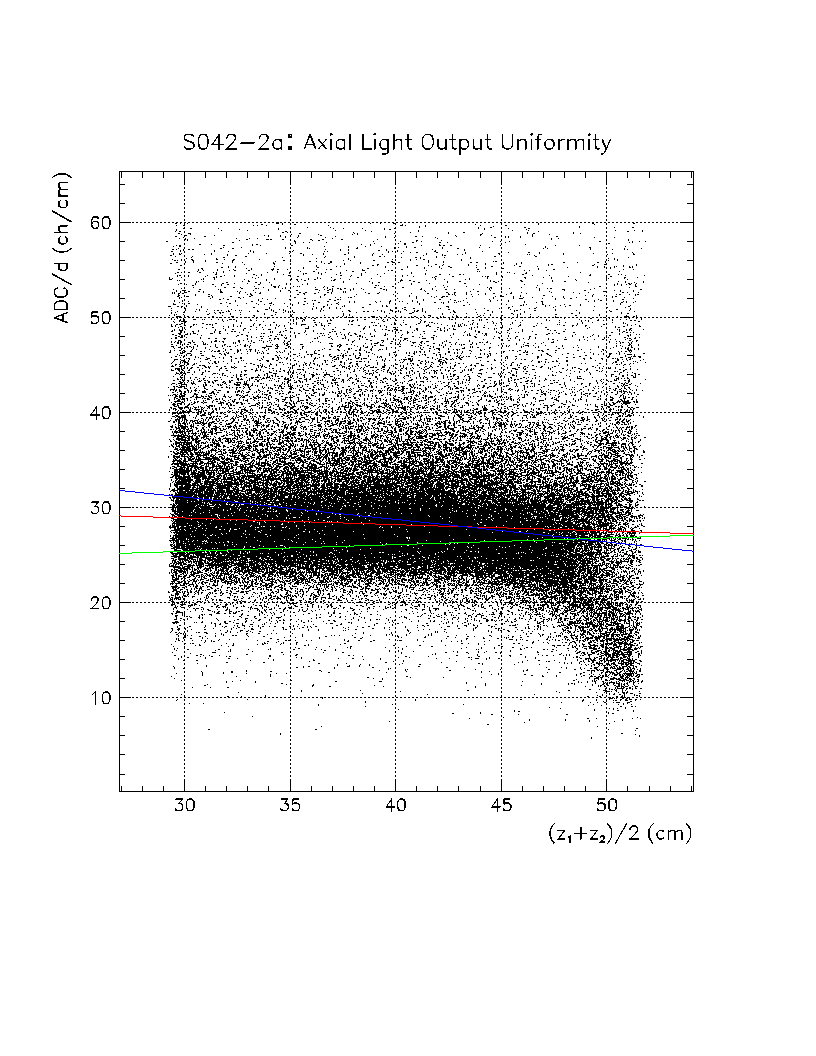Light output per unit pathlength in the crystal (s/d) is plotted as a function of z-position in the crystal. The front face of the crystal corresponds to z=0 cm, while the back of the crystal is z=22 cm. The nonuniformity constant is equal to the slope of this scatter plot, divided by the average value of s/d in the region of interest. Using this definition, a negative axial nonuniformity corresponds to a decreasing value of s/d from z=0 to s=22 cm.