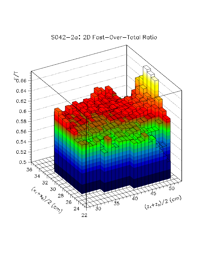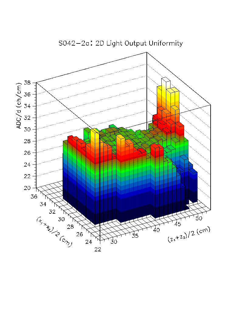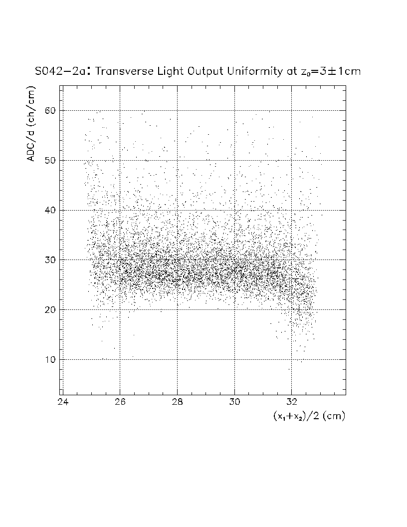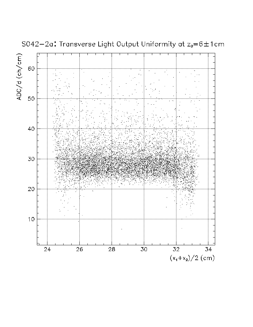 Light output per unit pathlength in the crystal (s/d) is plotted as a function of z-position in the crystal. The front face of the crystal corresponds to z=0 cm, while the back of the crystal is z=22 cm. The nonuniformity constant is equal to the slope of this scatter plot, divided by the average value of s/d in the region of interest. Using this definition, a negative axial nonuniformity corresponds to a decreasing value of s/d from z=0 to s=22 cm.