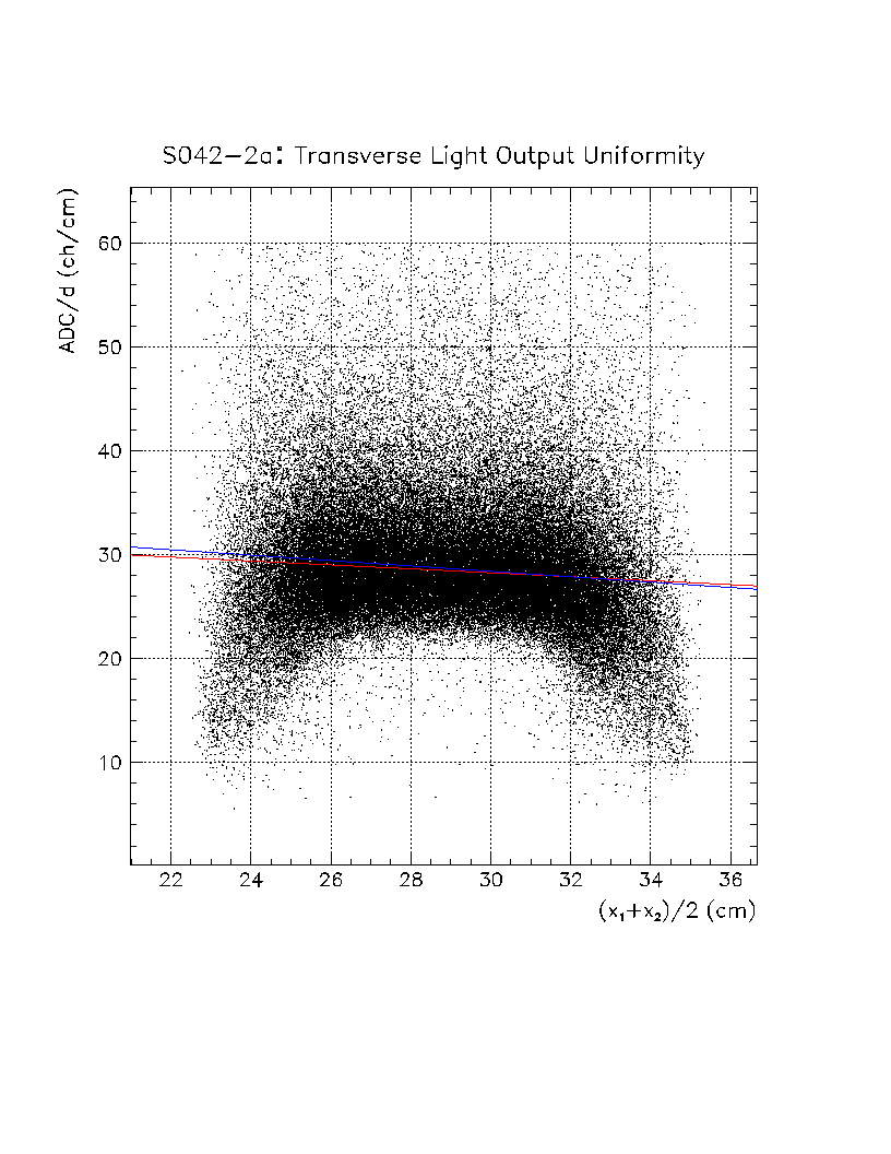 "s/d" is plotted as a function of x-position in the crystal. Looking at the back face of the crystal, the positive x-axis points to the right. The nonuniformity constant is equal to the slope of the scatter plot, divided by the average value of s/d in the region of interest. A negative transverse nonuniformity on the right side of the crystal corresponds to a decreasing value of s/d from the center to the edge of the crystal, while a positive transverse nonuniformity on the left side of the crystal means that s/d increases toward the center.