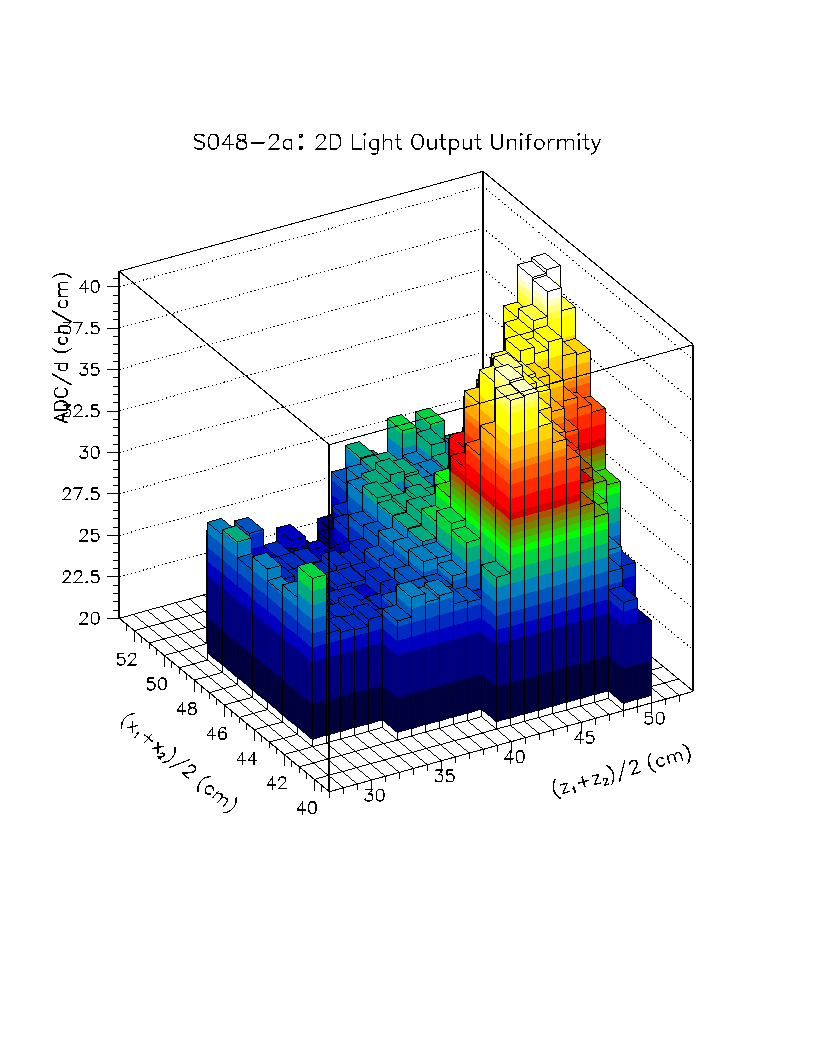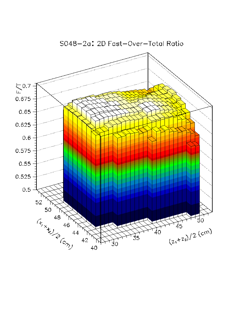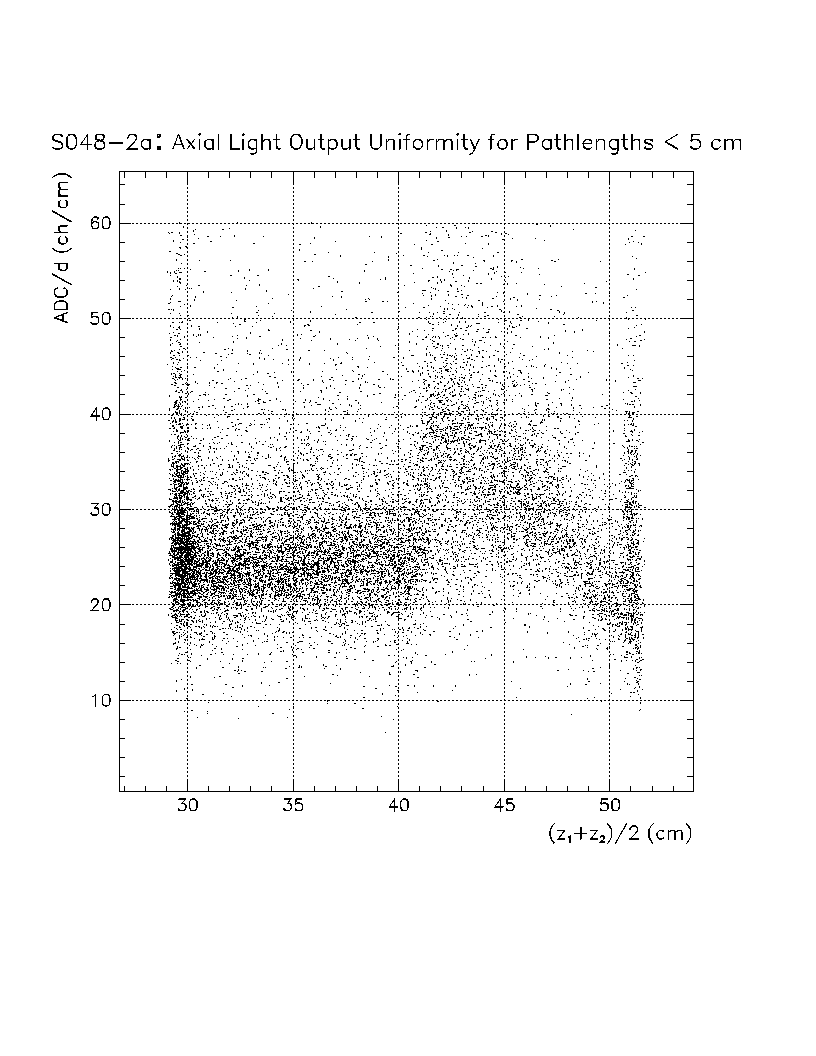 Light output per unit pathlength in the crystal (s/d) is plotted as a function of z-position in the crystal. The front face of the crystal corresponds to z=0 cm, while the back of the crystal is z=22 cm. The nonuniformity constant is equal to the slope of this scatter plot, divided by the average value of s/d in the region of interest. Using this definition, a negative axial nonuniformity corresponds to a decreasing value of s/d from z=0 to s=22 cm.