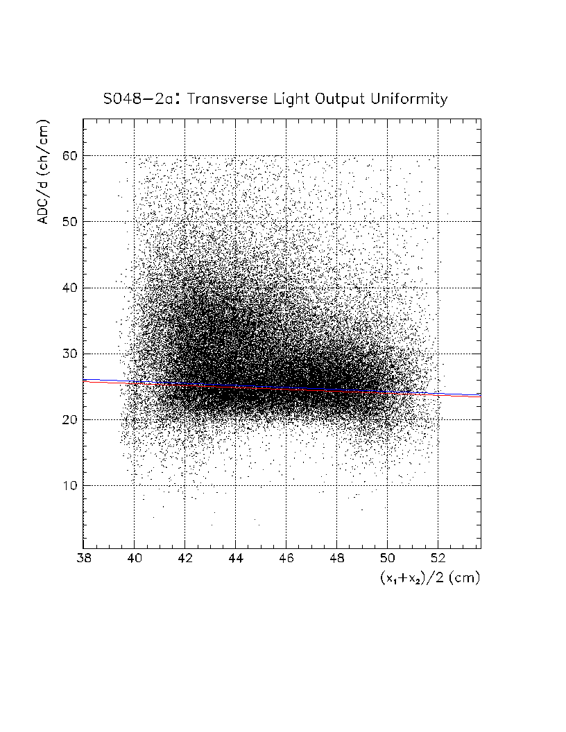 "s/d" is plotted as a function of x-position in the crystal. Looking at the back face of the crystal, the positive x-axis points to the right. The nonuniformity constant is equal to the slope of the scatter plot, divided by the average value of s/d in the region of interest. A negative transverse nonuniformity on the right side of the crystal corresponds to a decreasing value of s/d from the center to the edge of the crystal, while a positive transverse nonuniformity on the left side of the crystal means that s/d increases toward the center.