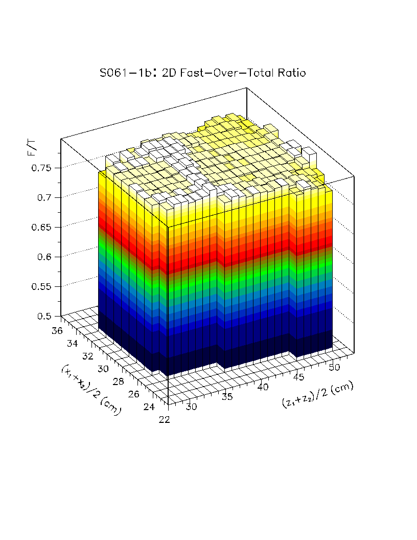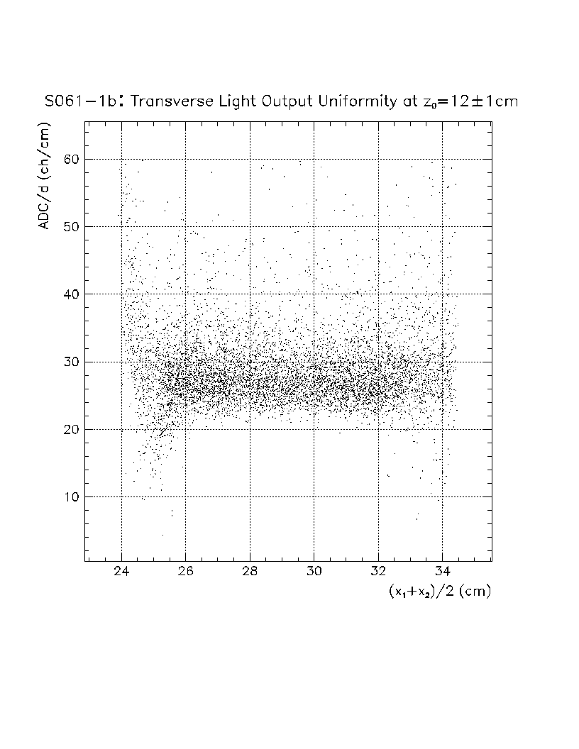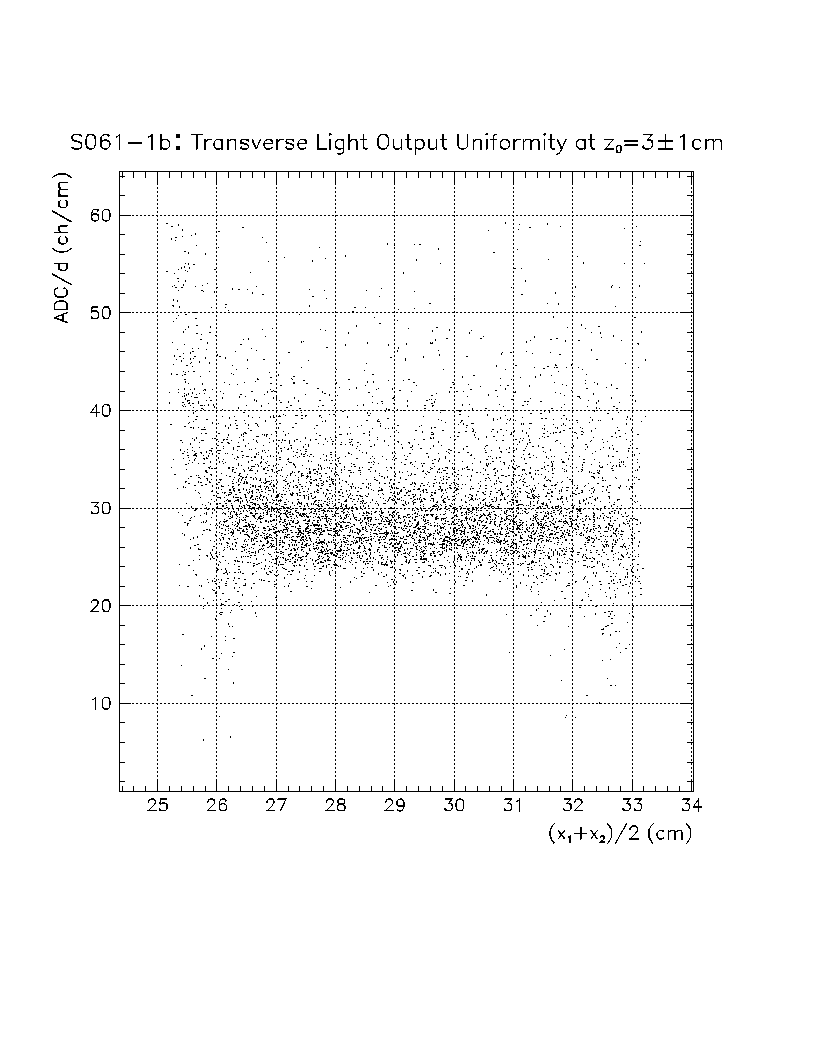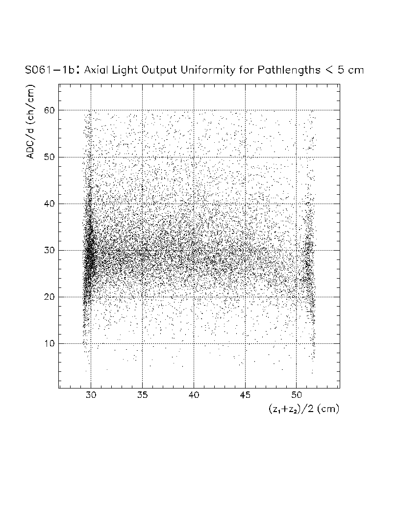 Light output per unit pathlength in the crystal (s/d) is plotted as a function of z-position in the crystal. The front face of the crystal corresponds to z=0 cm, while the back of the crystal is z=22 cm. The nonuniformity constant is equal to the slope of this scatter plot, divided by the average value of s/d in the region of interest. Using this definition, a negative axial nonuniformity corresponds to a decreasing value of s/d from z=0 to s=22 cm.