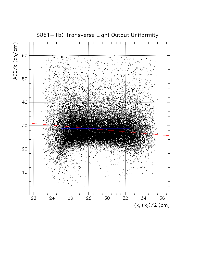 "s/d" is plotted as a function of x-position in the crystal. Looking at the back face of the crystal, the positive x-axis points to the right. The nonuniformity constant is equal to the slope of the scatter plot, divided by the average value of s/d in the region of interest. A negative transverse nonuniformity on the right side of the crystal corresponds to a decreasing value of s/d from the center to the edge of the crystal, while a positive transverse nonuniformity on the left side of the crystal means that s/d increases toward the center.