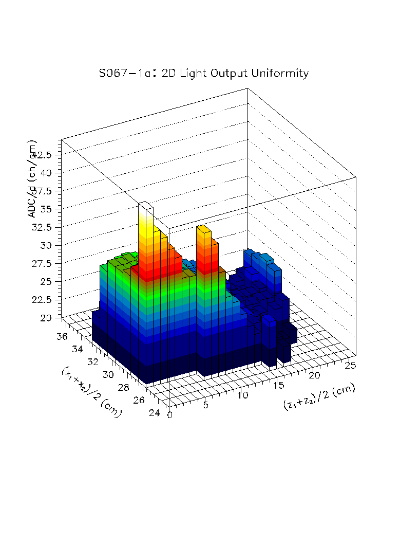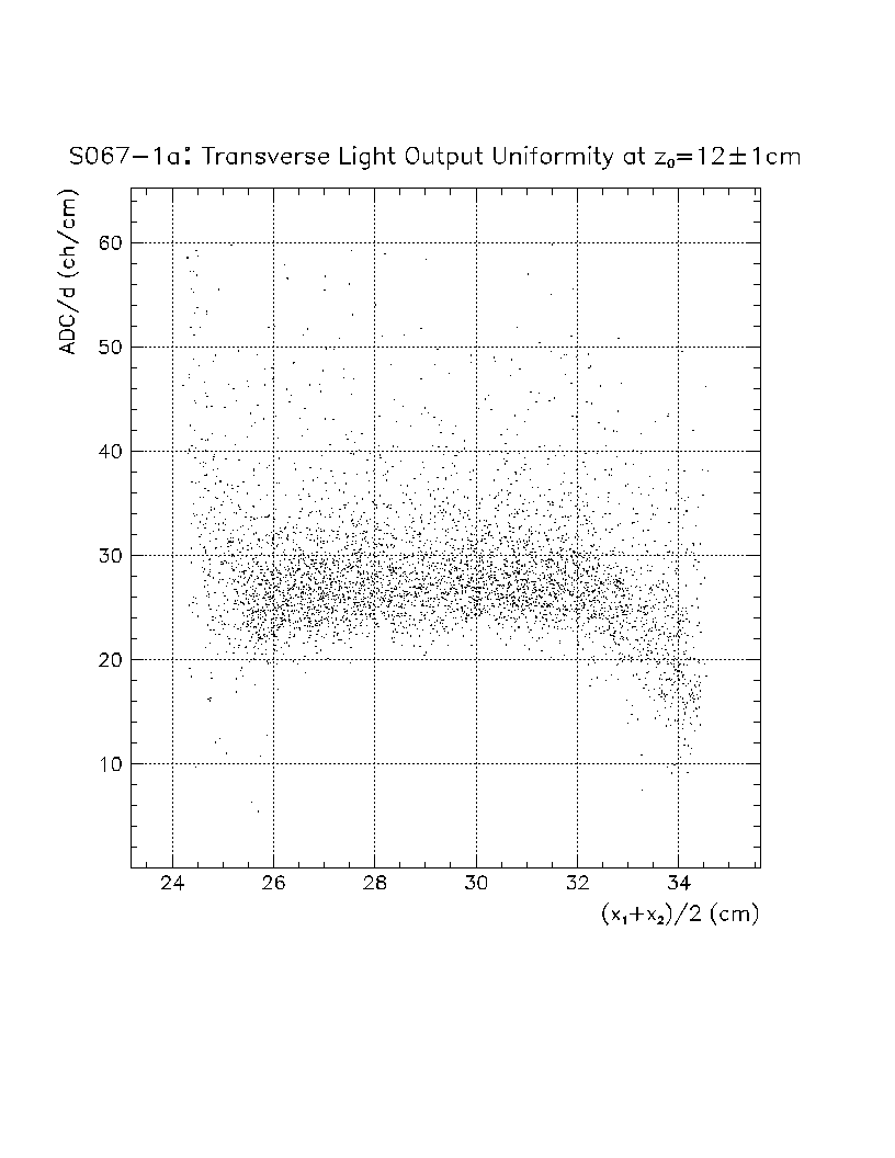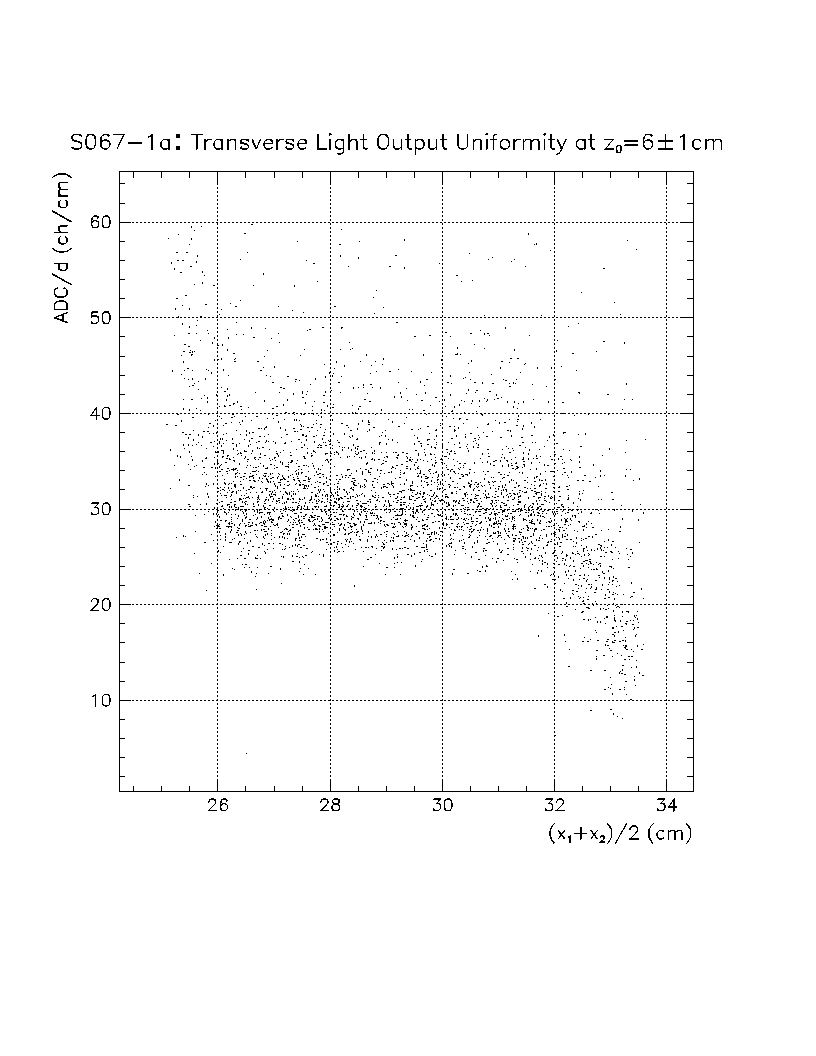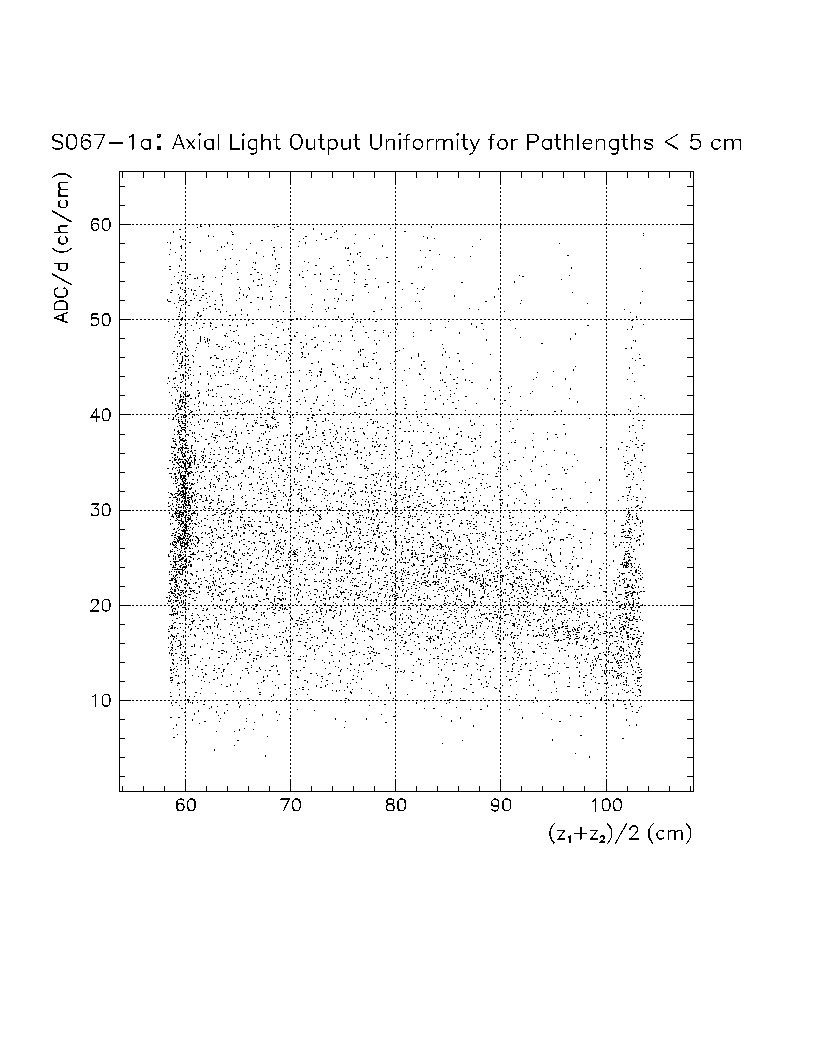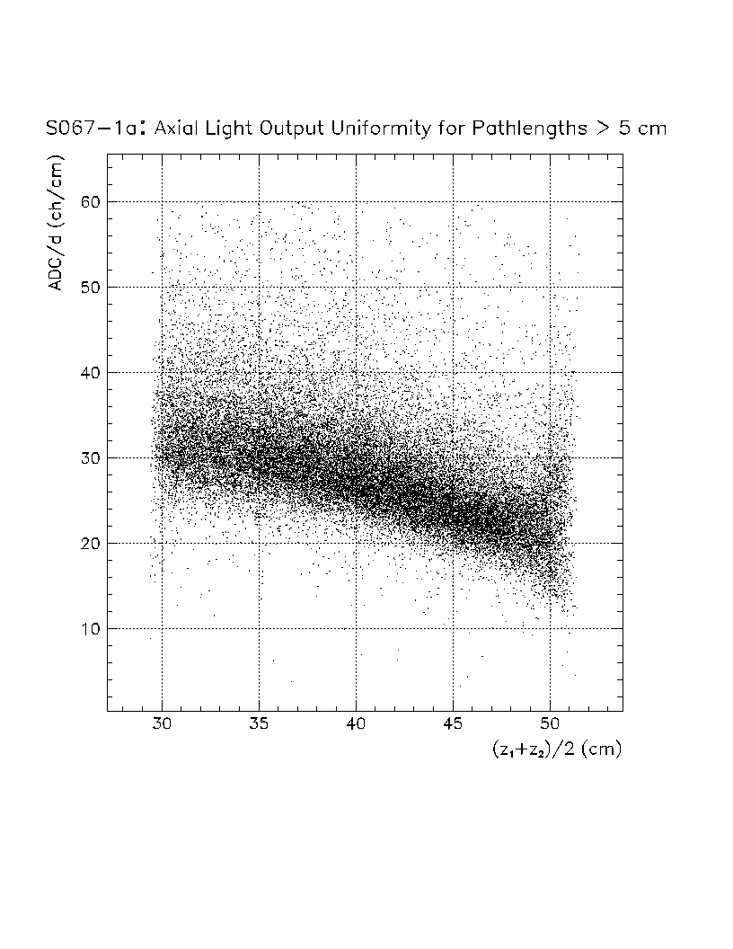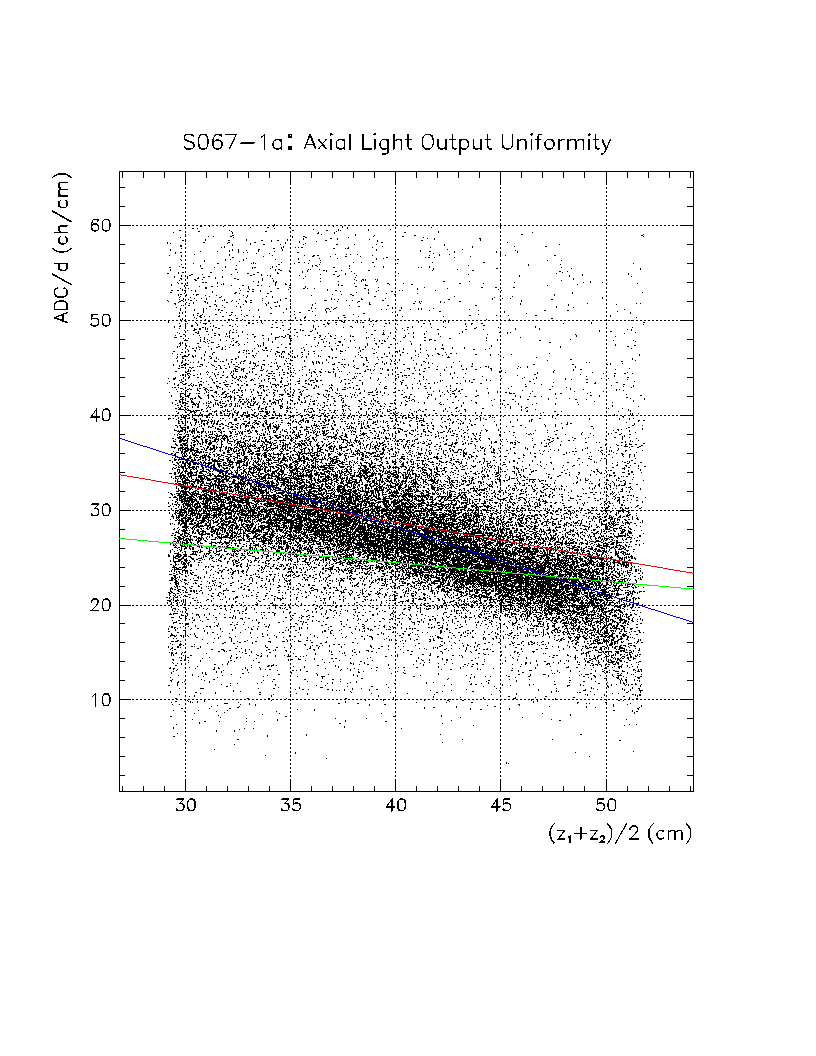 Light output per unit pathlength in the crystal (s/d) is plotted as a function of z-position in the crystal. The front face of the crystal corresponds to z=0 cm, while the back of the crystal is z=22 cm. The nonuniformity constant is equal to the slope of this scatter plot, divided by the average value of s/d in the region of interest. Using this definition, a negative axial nonuniformity corresponds to a decreasing value of s/d from z=0 to s=22 cm.