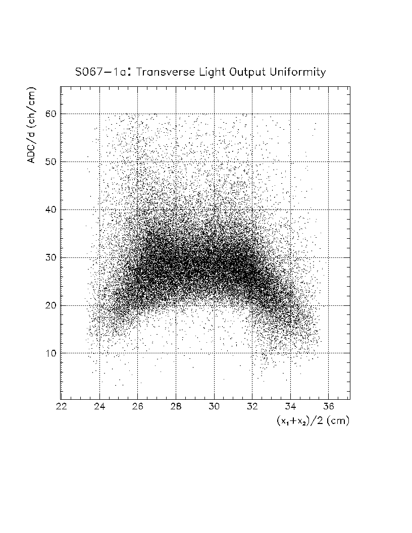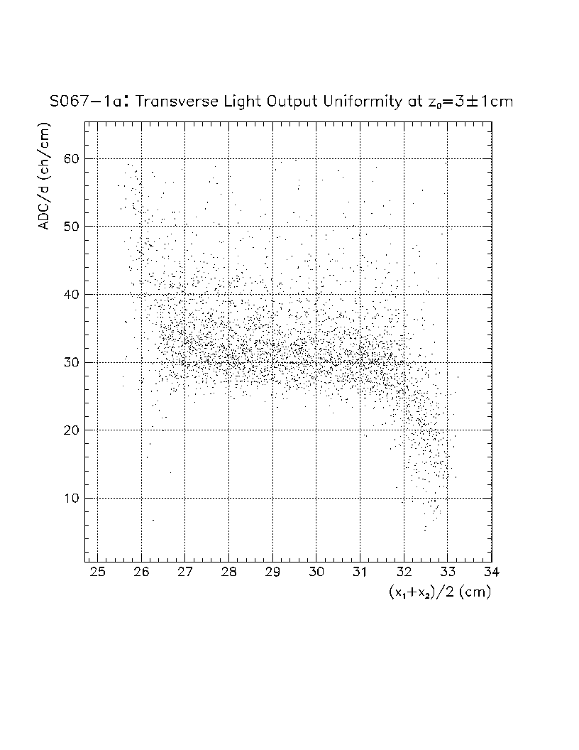 "s/d" is plotted as a function of x-position in the crystal. Looking at the back face of the crystal, the positive x-axis points to the right. The nonuniformity constant is equal to the slope of the scatter plot, divided by the average value of s/d in the region of interest. A negative transverse nonuniformity on the right side of the crystal corresponds to a decreasing value of s/d from the center to the edge of the crystal, while a positive transverse nonuniformity on the left side of the crystal means that s/d increases toward the center.
