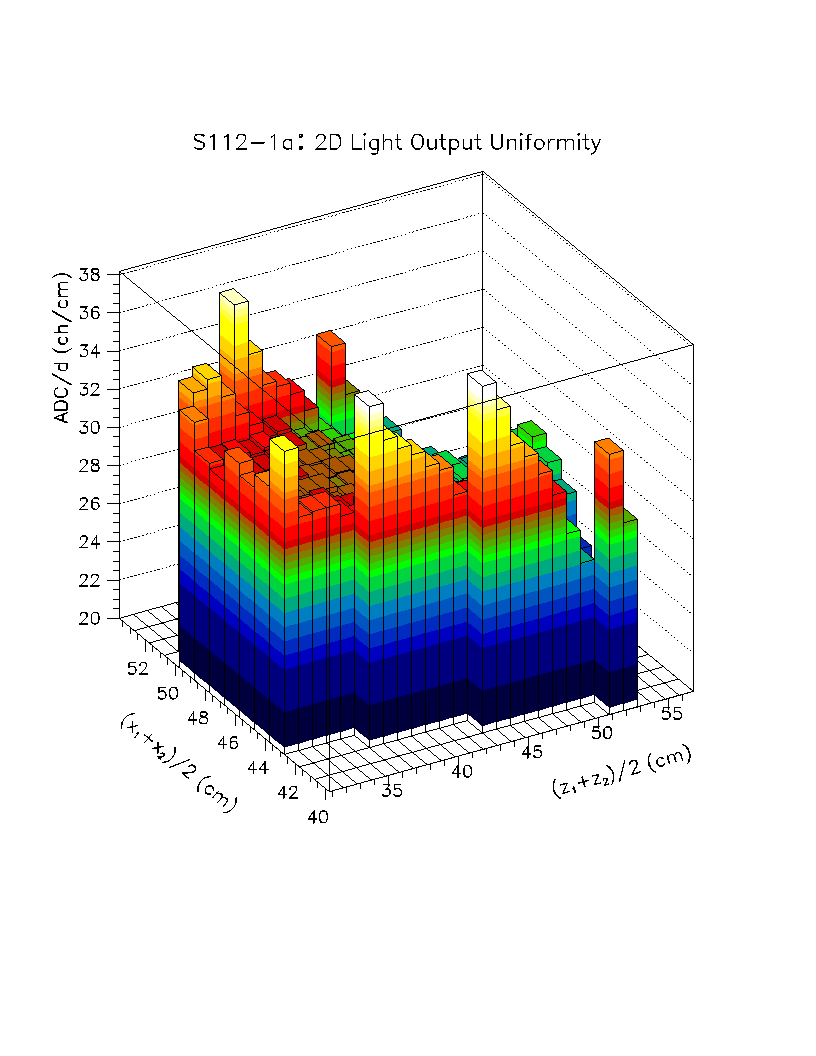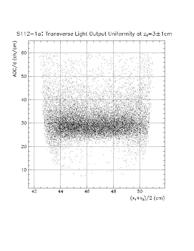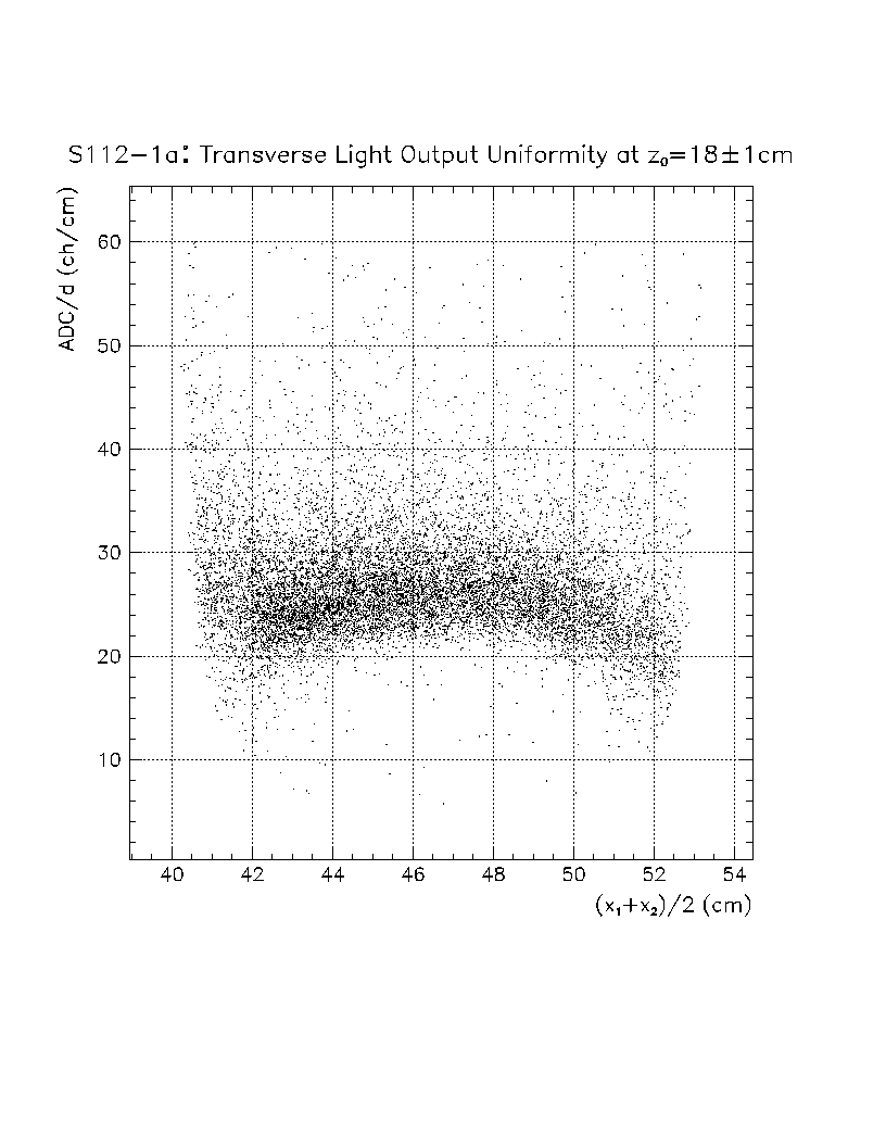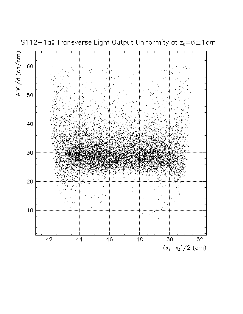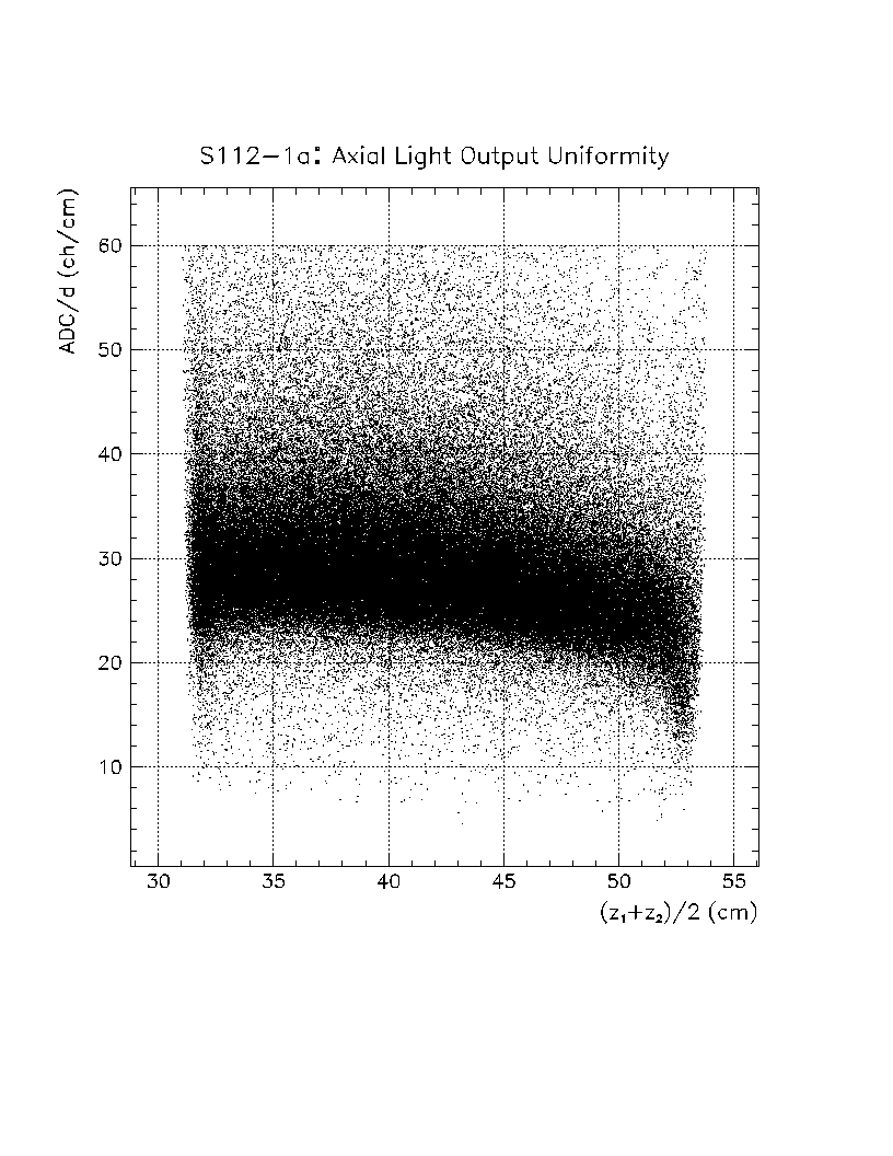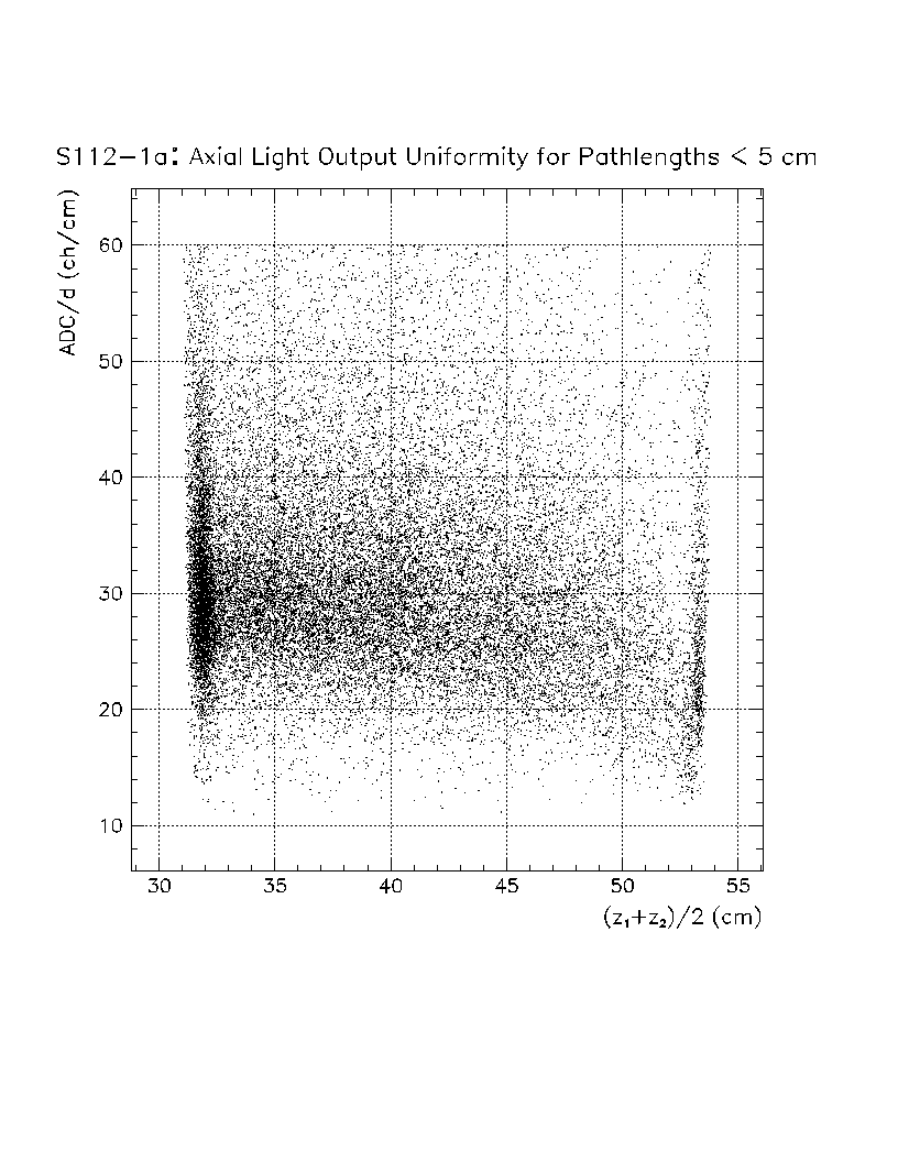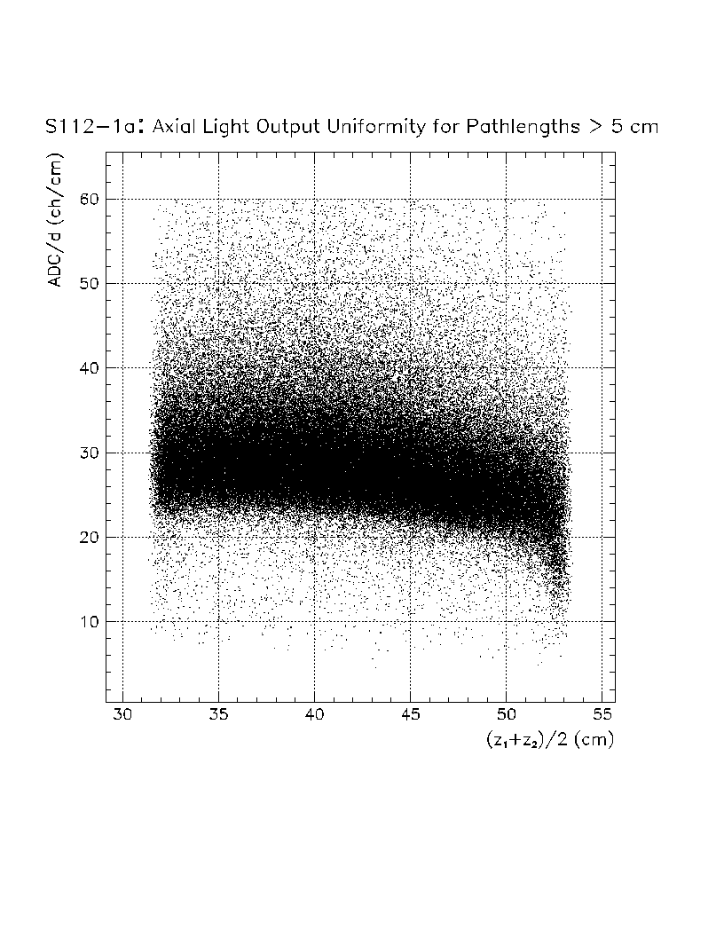 Light output per unit pathlength in the crystal (s/d) is plotted as a function of z-position in the crystal. The front face of the crystal corresponds to z=0 cm, while the back of the crystal is z=22 cm. The nonuniformity constant is equal to the slope of this scatter plot, divided by the average value of s/d in the region of interest. Using this definition, a negative axial nonuniformity corresponds to a decreasing value of s/d from z=0 to s=22 cm.