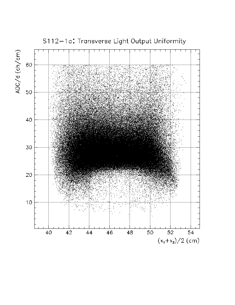 "s/d" is plotted as a function of x-position in the crystal. Looking at the back face of the crystal, the positive x-axis points to the right. The nonuniformity constant is equal to the slope of the scatter plot, divided by the average value of s/d in the region of interest. A negative transverse nonuniformity on the right side of the crystal corresponds to a decreasing value of s/d from the center to the edge of the crystal, while a positive transverse nonuniformity on the left side of the crystal means that s/d increases toward the center.