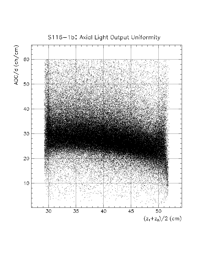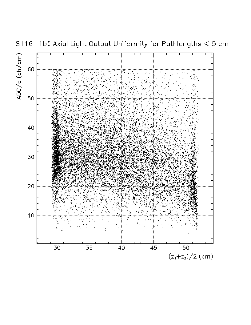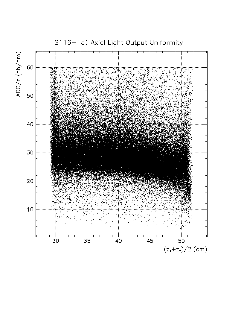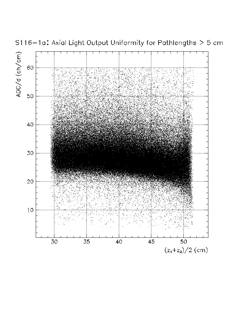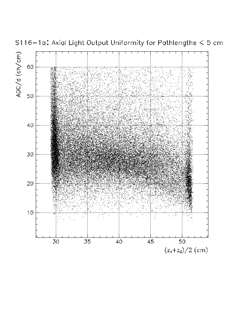 Light output per unit pathlength in the crystal (s/d) is plotted as a function of z-position in the crystal. The front face of the crystal corresponds to z=0 cm, while the back of the crystal is z=22 cm. The nonuniformity constant is equal to the slope of this scatter plot, divided by the average value of s/d in the region of interest. Using this definition, a negative axial nonuniformity corresponds to a decreasing value of s/d from z=0 to s=22 cm.