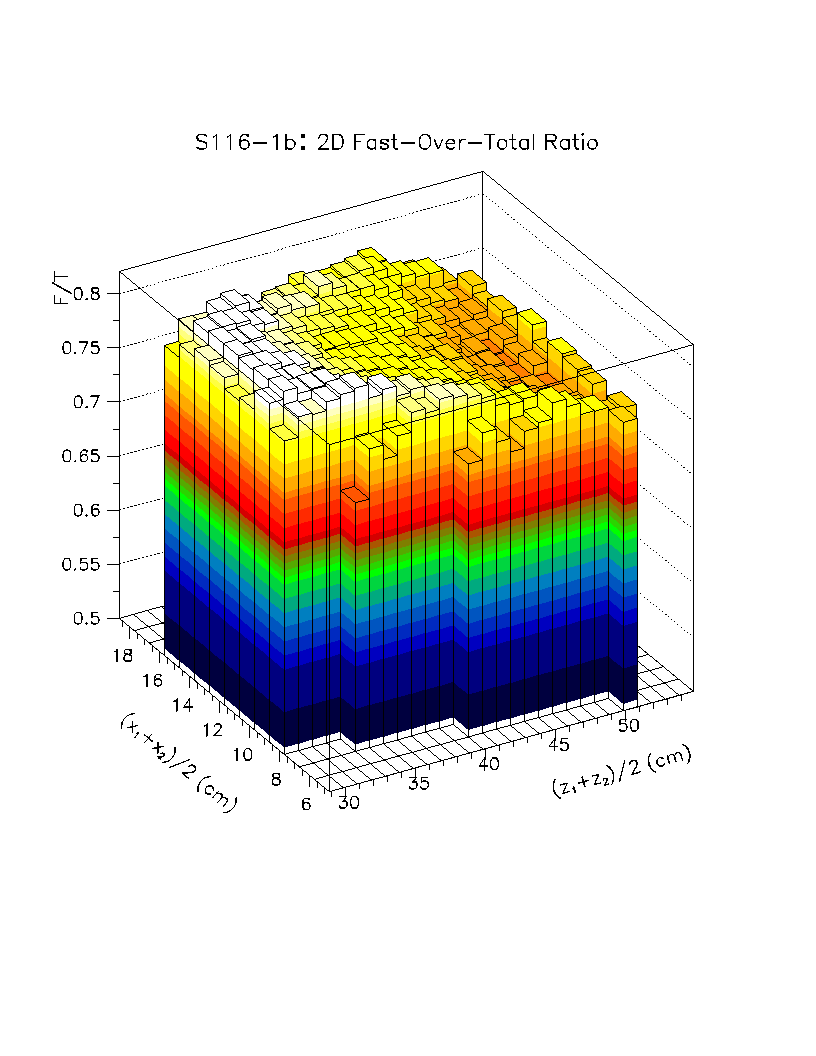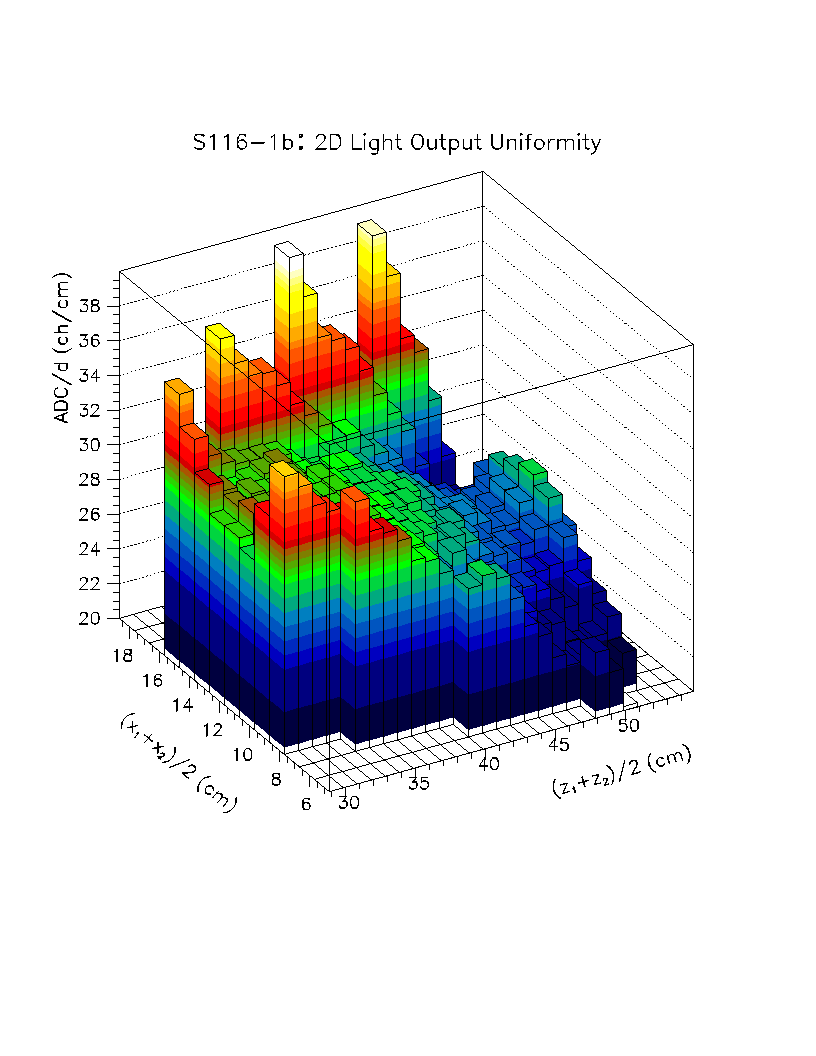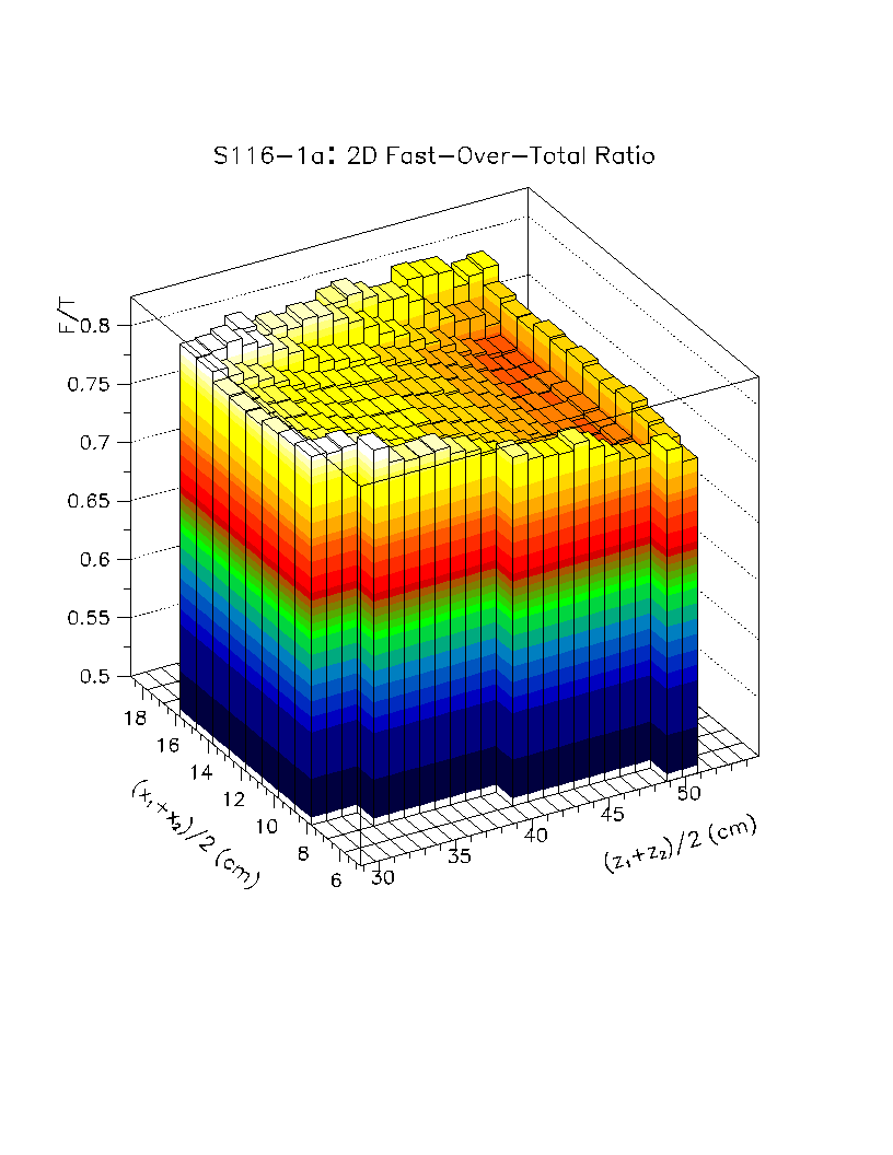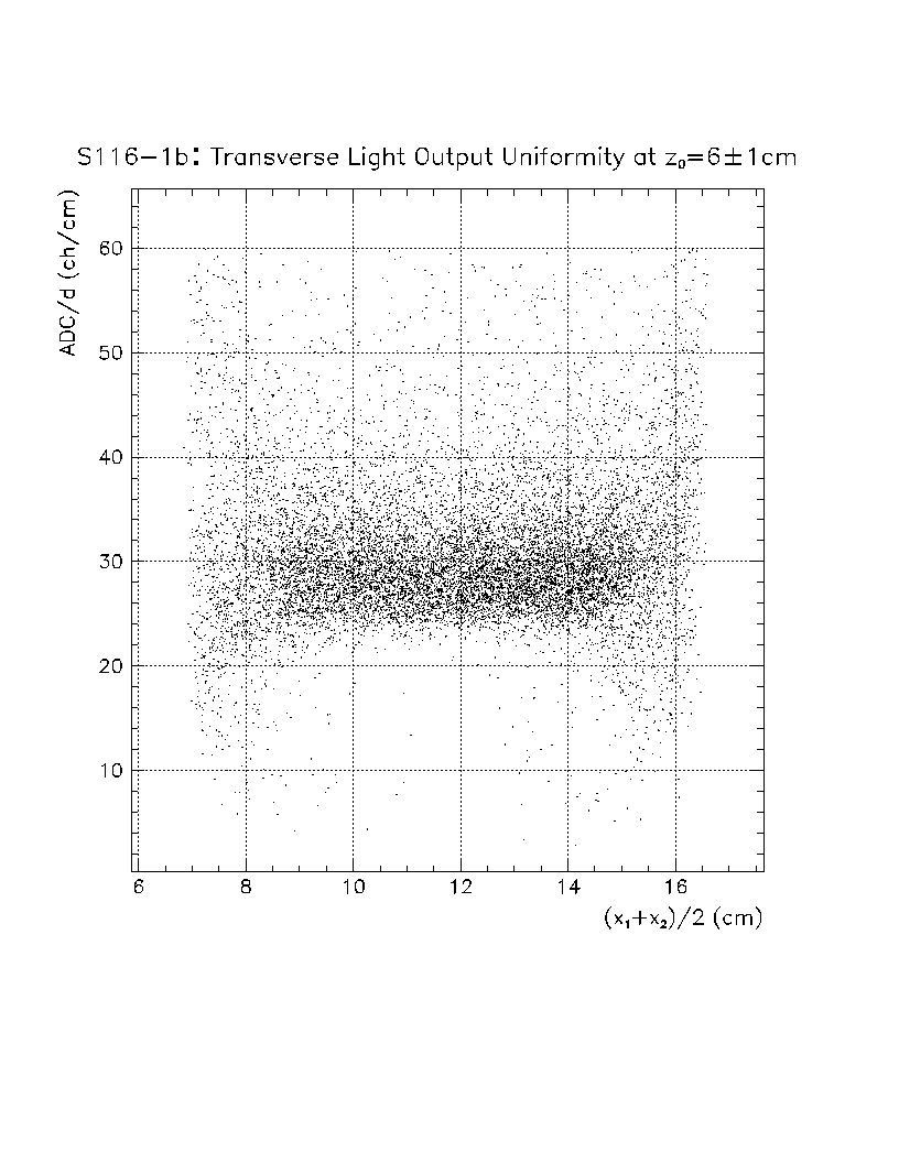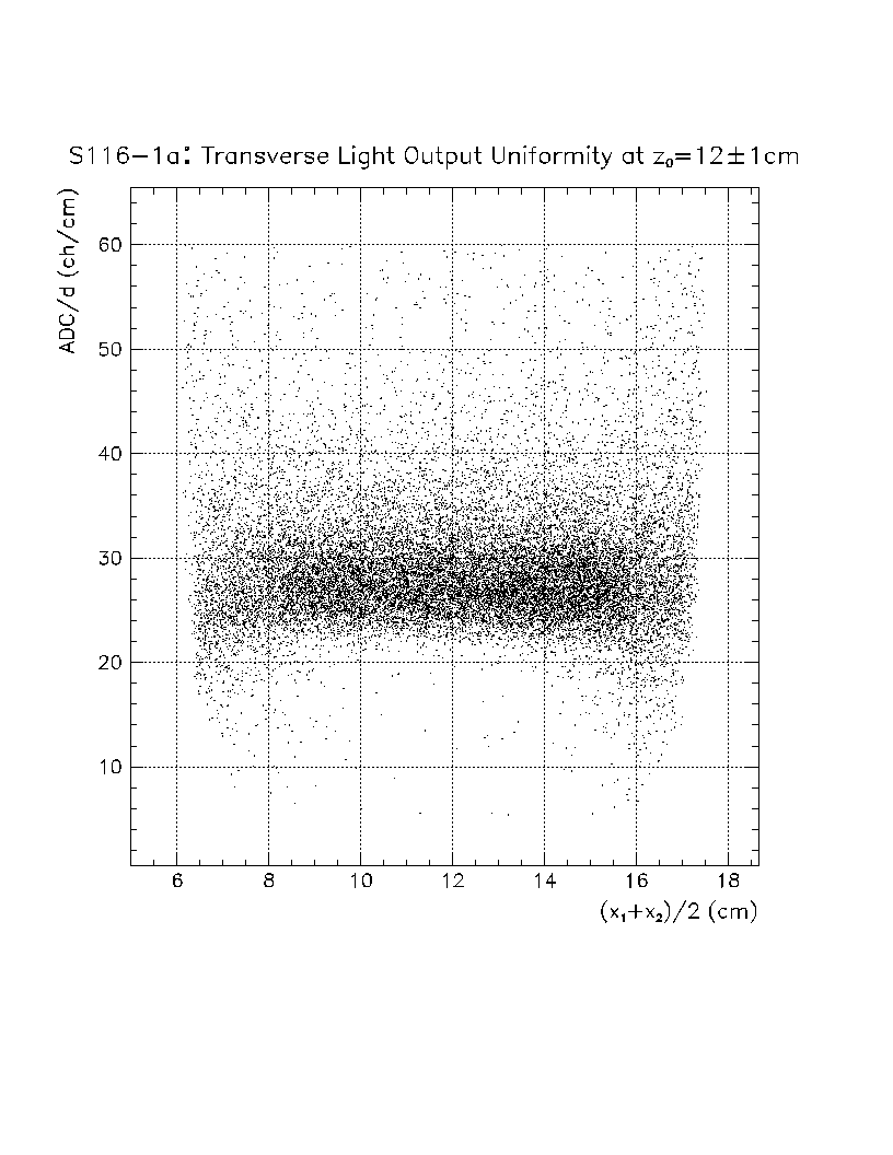 Light output per unit pathlength in the crystal (s/d) is plotted as a function of z-position in the crystal. The front face of the crystal corresponds to z=0 cm, while the back of the crystal is z=22 cm. The nonuniformity constant is equal to the slope of this scatter plot, divided by the average value of s/d in the region of interest. Using this definition, a negative axial nonuniformity corresponds to a decreasing value of s/d from z=0 to s=22 cm.