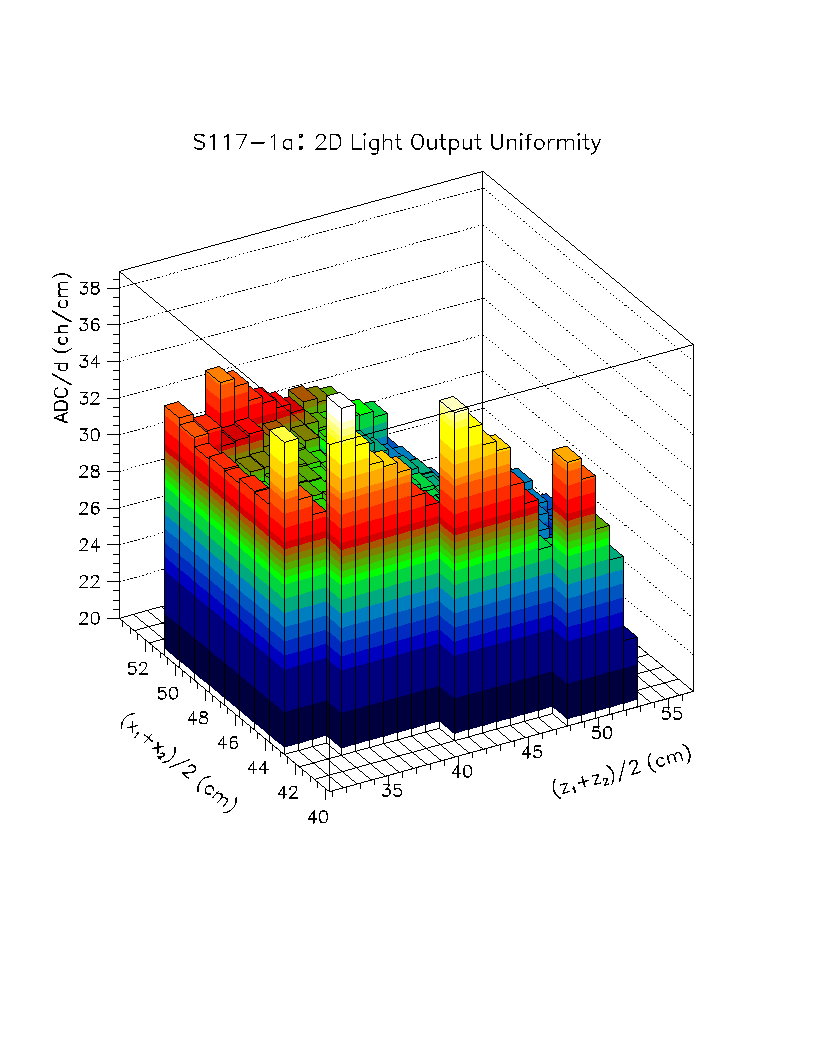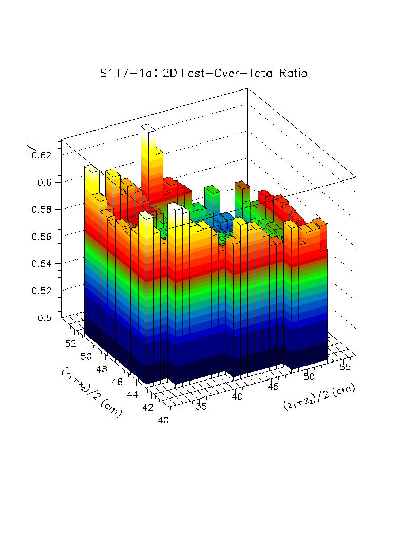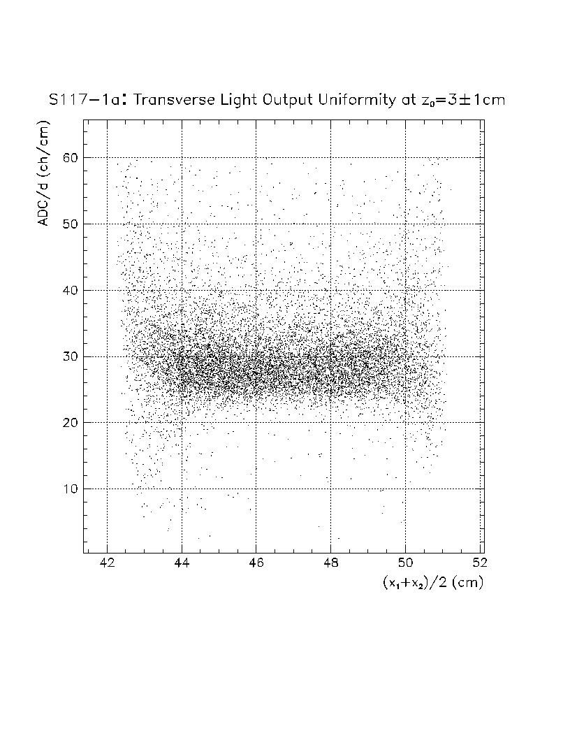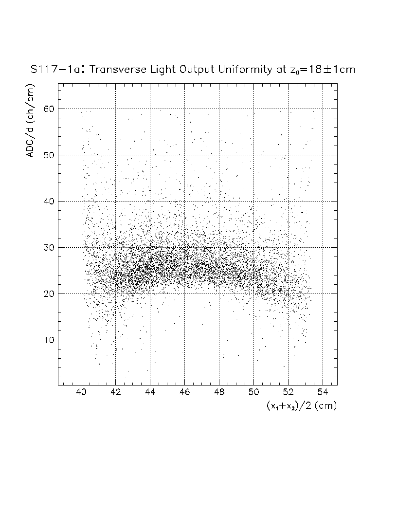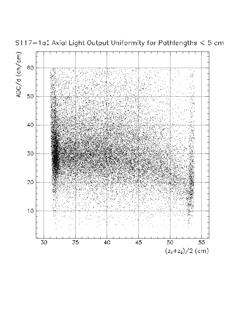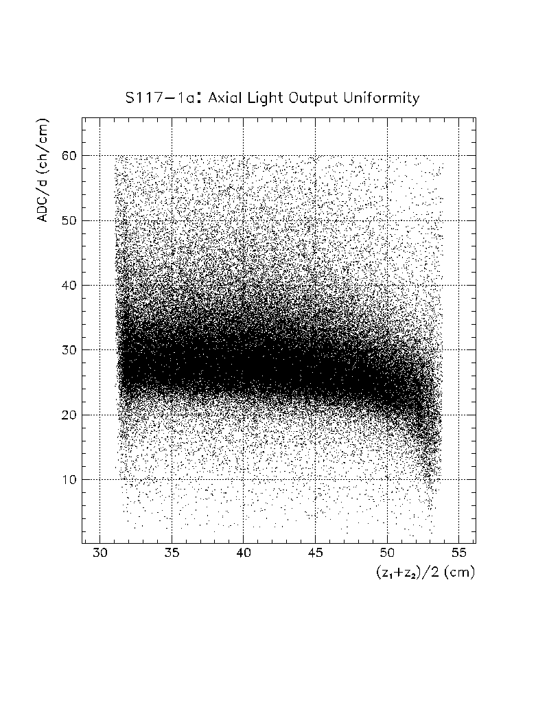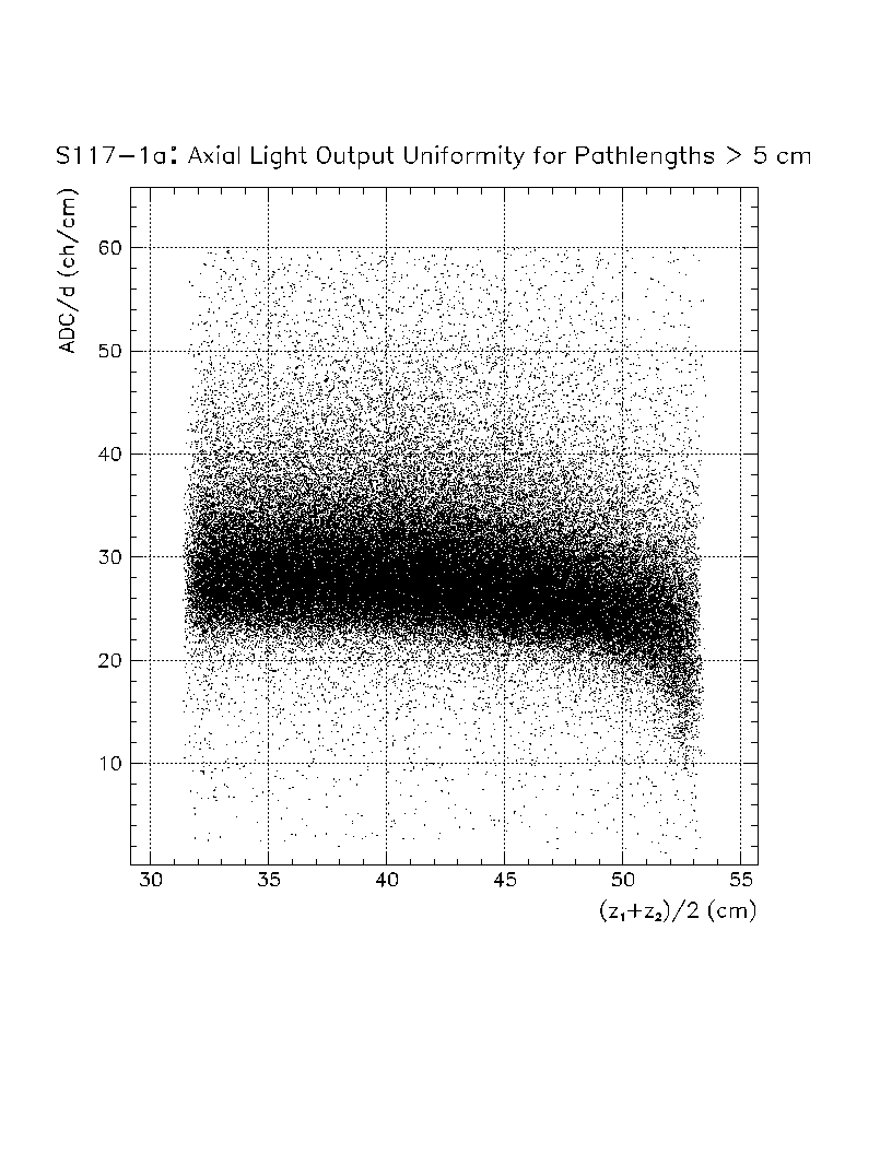Light output per unit pathlength in the crystal (s/d) is plotted as a function of z-position in the crystal. The front face of the crystal corresponds to z=0 cm, while the back of the crystal is z=22 cm. The nonuniformity constant is equal to the slope of this scatter plot, divided by the average value of s/d in the region of interest. Using this definition, a negative axial nonuniformity corresponds to a decreasing value of s/d from z=0 to s=22 cm.