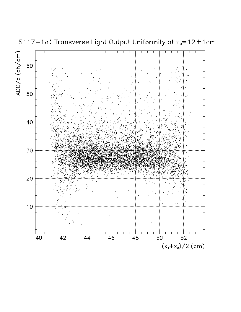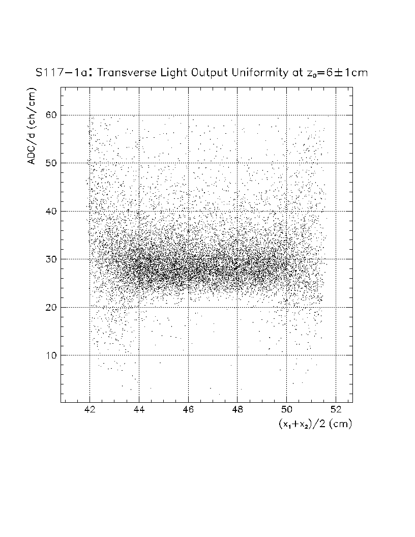"s/d" is plotted as a function of x-position in the crystal. Looking at the back face of the crystal, the positive x-axis points to the right. The nonuniformity constant is equal to the slope of the scatter plot, divided by the average value of s/d in the region of interest. A negative transverse nonuniformity on the right side of the crystal corresponds to a decreasing value of s/d from the center to the edge of the crystal, while a positive transverse nonuniformity on the left side of the crystal means that s/d increases toward the center.