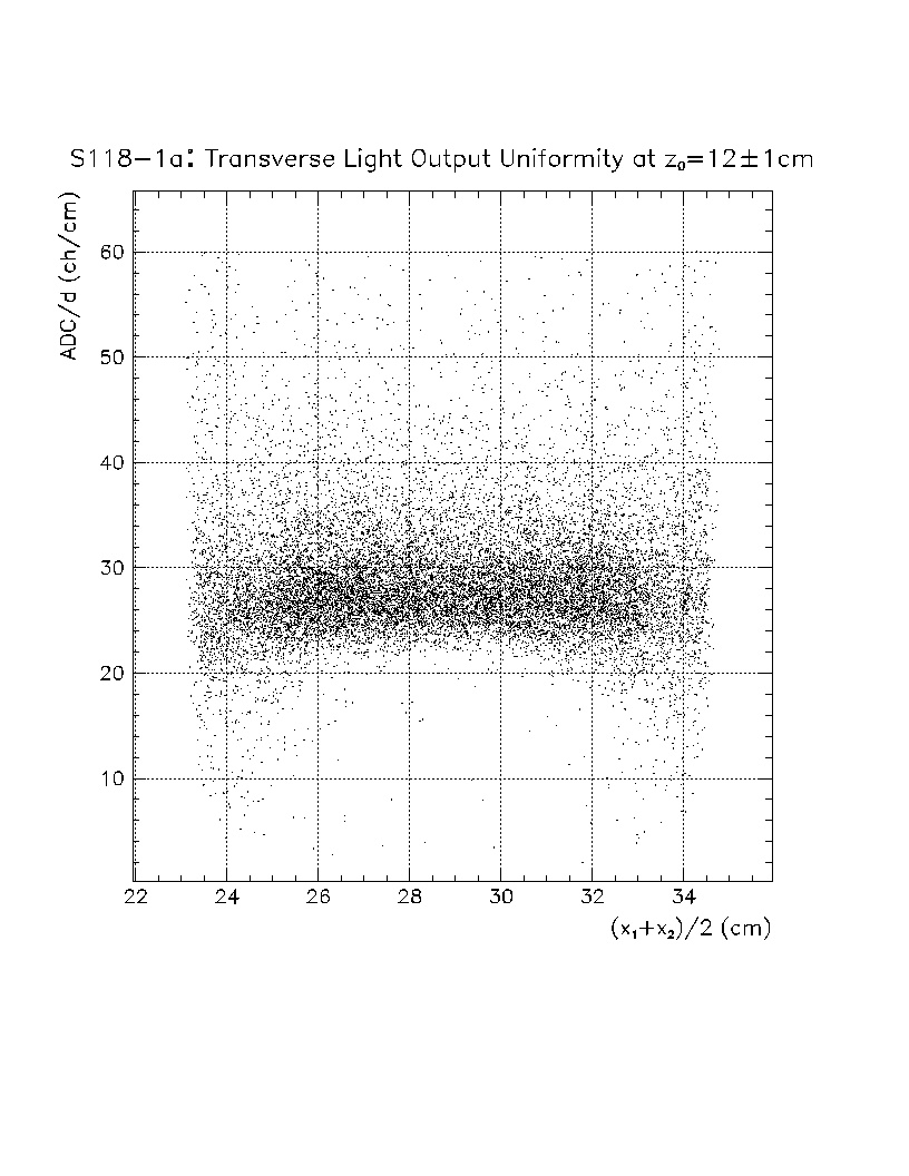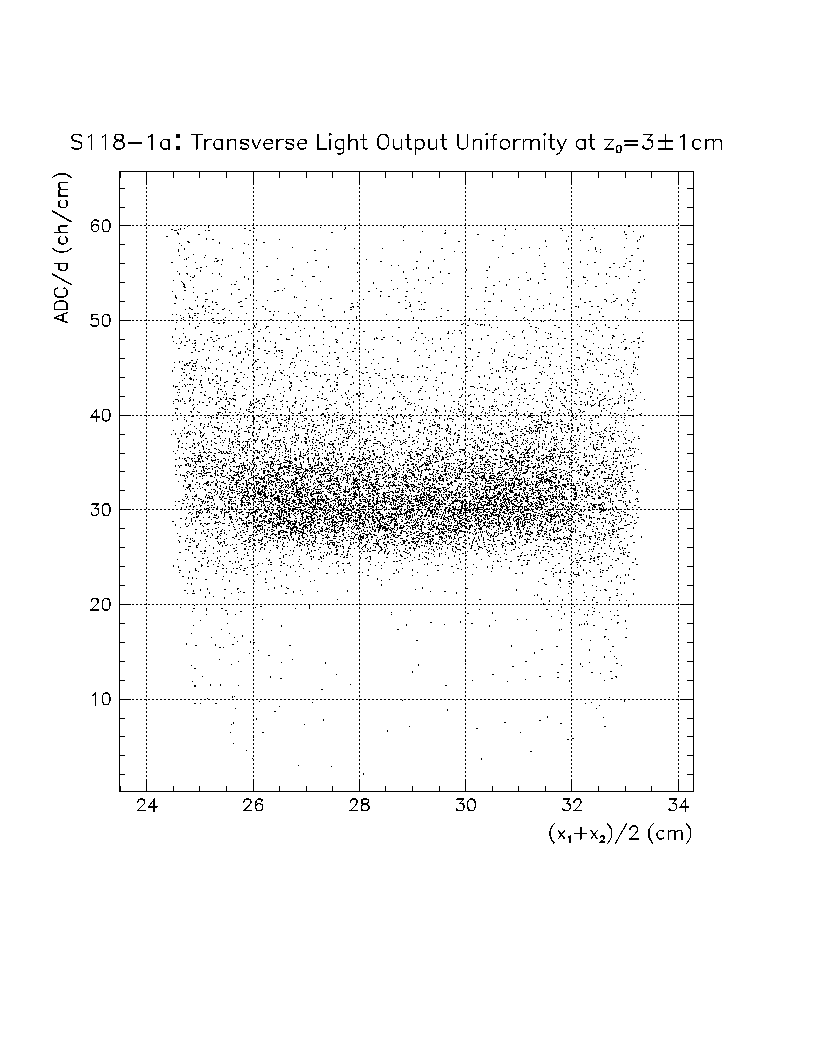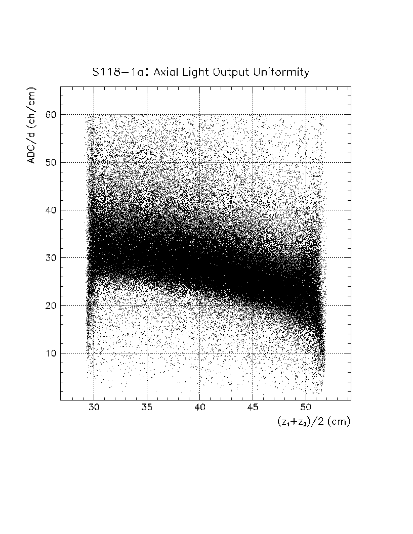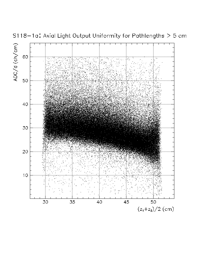 Light output per unit pathlength in the crystal (s/d) is plotted as a function of z-position in the crystal. The front face of the crystal corresponds to z=0 cm, while the back of the crystal is z=22 cm. The nonuniformity constant is equal to the slope of this scatter plot, divided by the average value of s/d in the region of interest. Using this definition, a negative axial nonuniformity corresponds to a decreasing value of s/d from z=0 to s=22 cm.