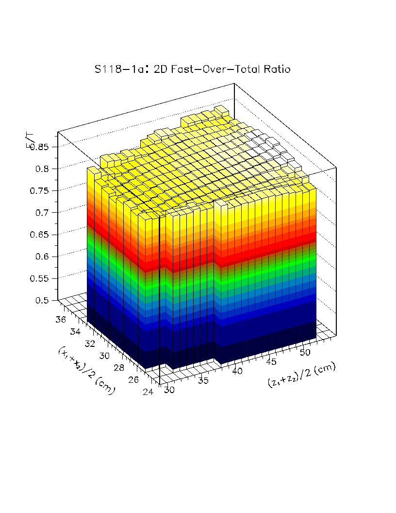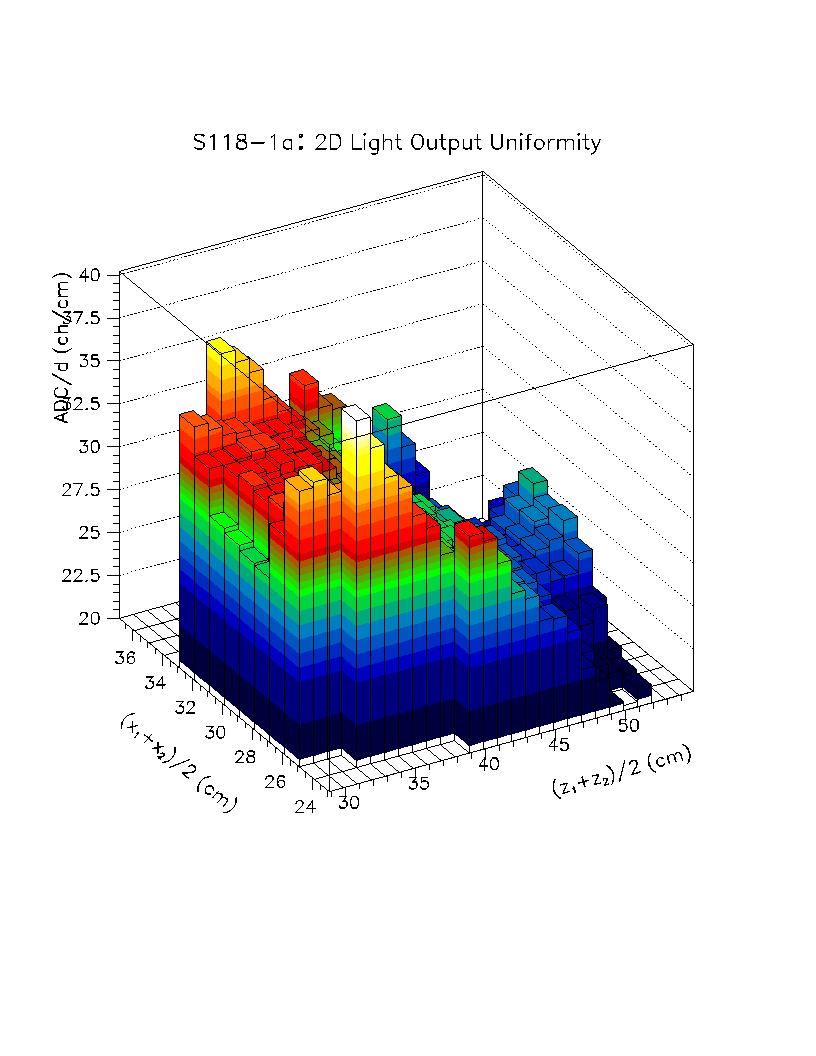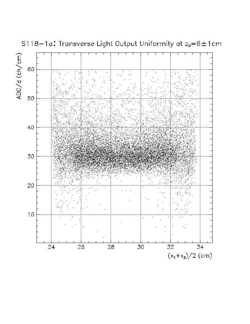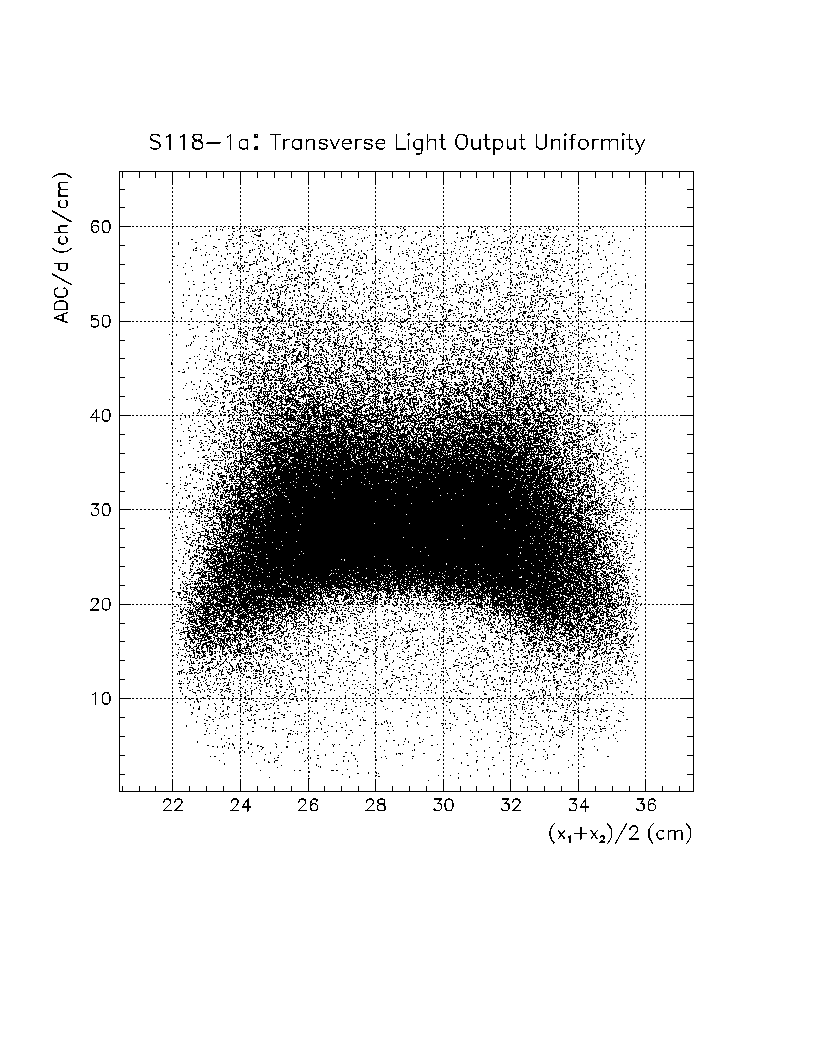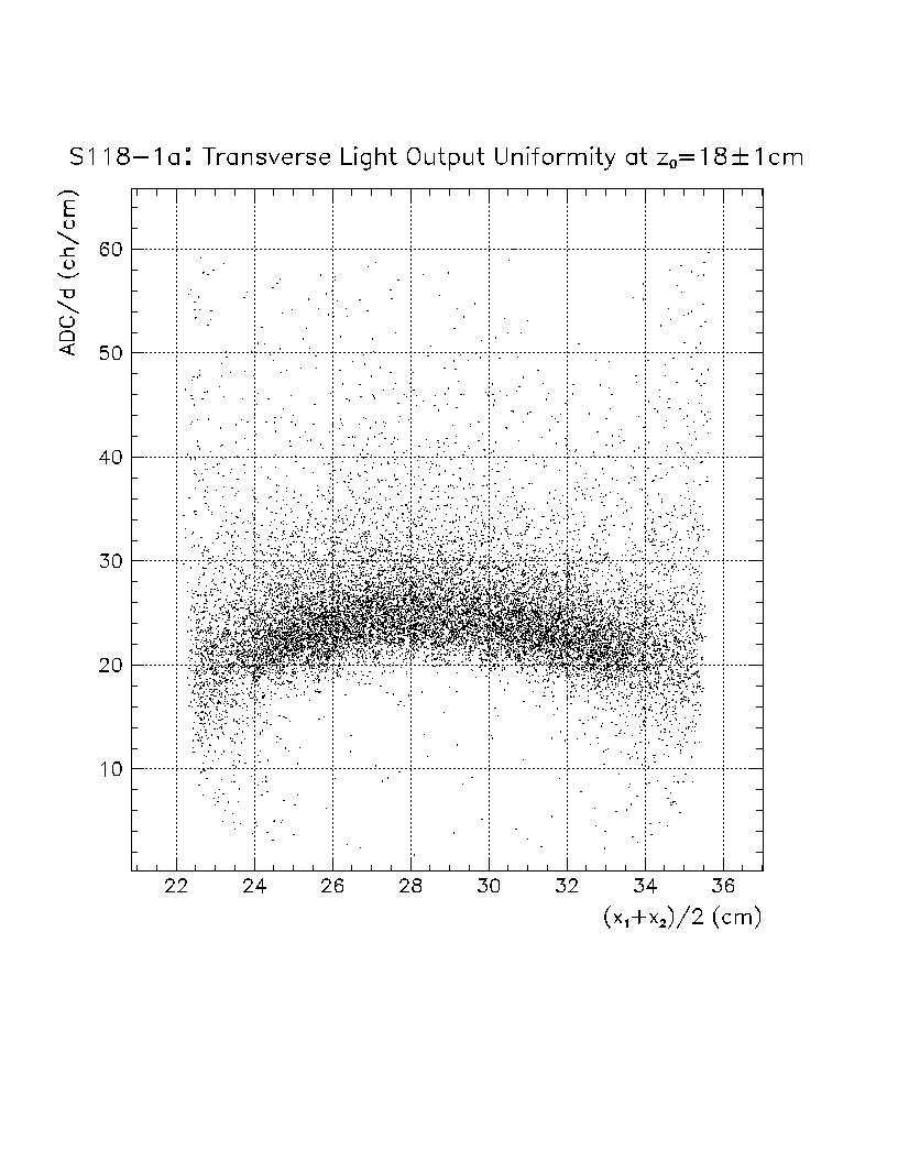 Light output per unit pathlength in the crystal (s/d) is plotted as a function of z-position in the crystal. The front face of the crystal corresponds to z=0 cm, while the back of the crystal is z=22 cm. The nonuniformity constant is equal to the slope of this scatter plot, divided by the average value of s/d in the region of interest. Using this definition, a negative axial nonuniformity corresponds to a decreasing value of s/d from z=0 to s=22 cm.