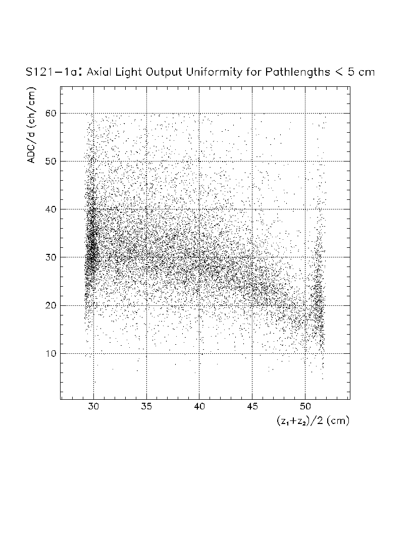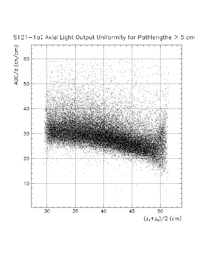 Light output per unit pathlength in the crystal (s/d) is plotted as a function of z-position in the crystal. The front face of the crystal corresponds to z=0 cm, while the back of the crystal is z=22 cm. The nonuniformity constant is equal to the slope of this scatter plot, divided by the average value of s/d in the region of interest. Using this definition, a negative axial nonuniformity corresponds to a decreasing value of s/d from z=0 to s=22 cm.