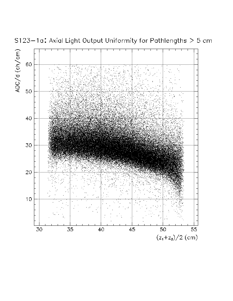 Light output per unit pathlength in the crystal (s/d) is plotted as a function of z-position in the crystal. The front face of the crystal corresponds to z=0 cm, while the back of the crystal is z=22 cm. The nonuniformity constant is equal to the slope of this scatter plot, divided by the average value of s/d in the region of interest. Using this definition, a negative axial nonuniformity corresponds to a decreasing value of s/d from z=0 to s=22 cm.
