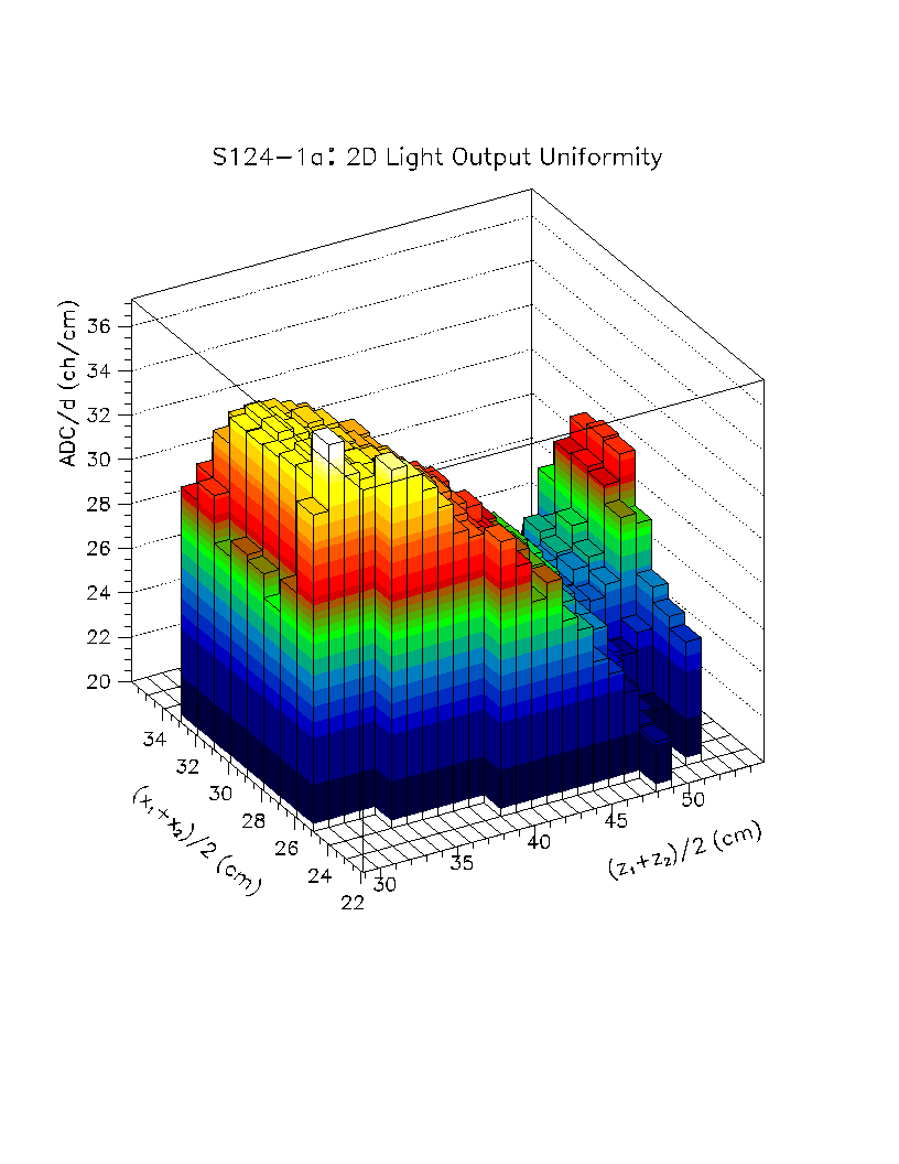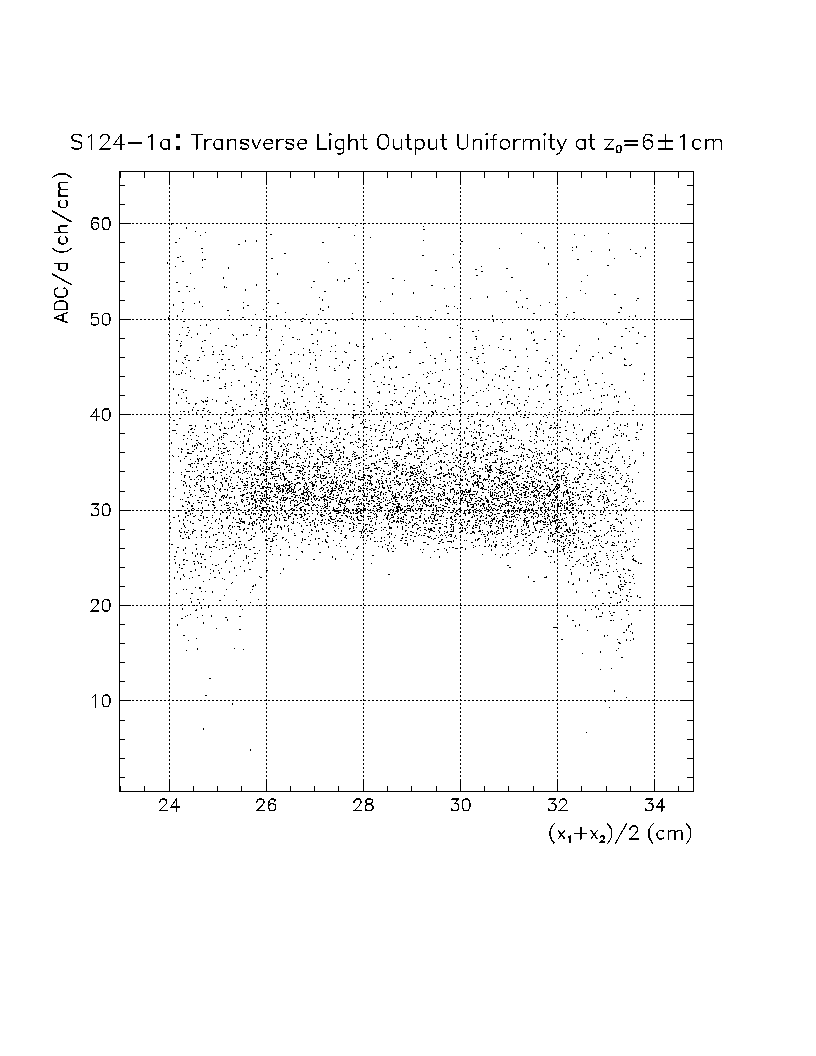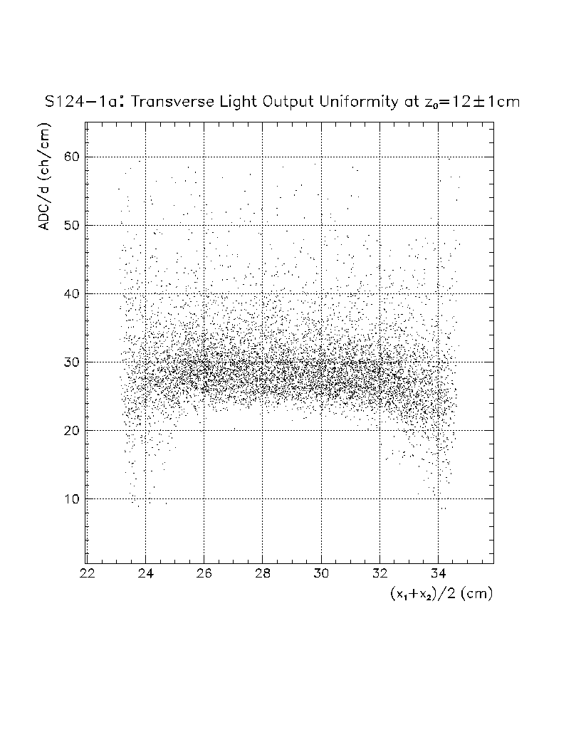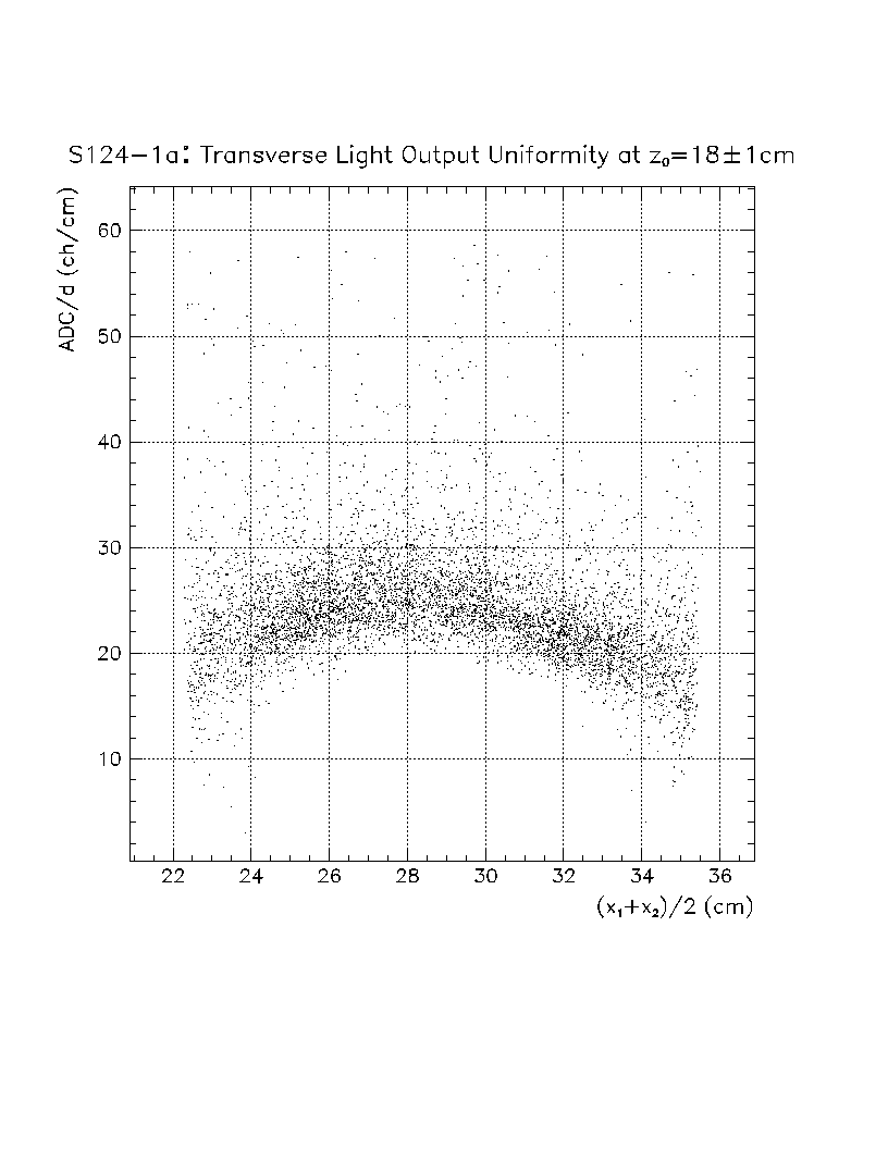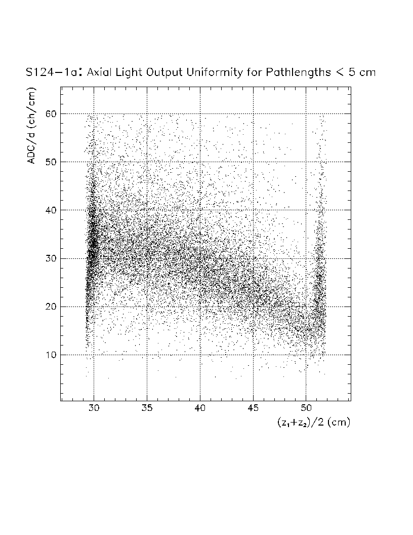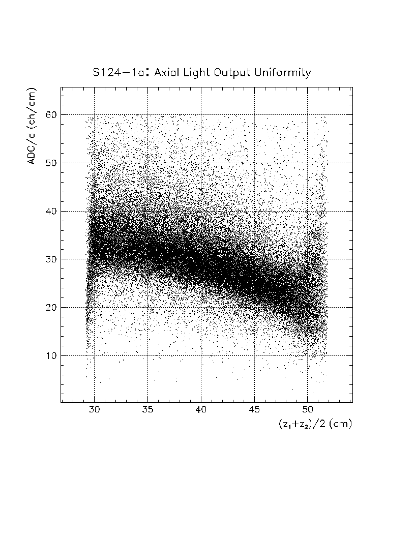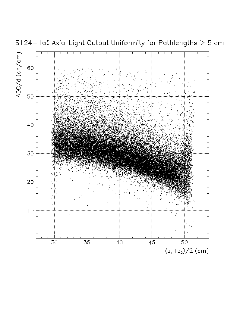 Light output per unit pathlength in the crystal (s/d) is plotted as a function of z-position in the crystal. The front face of the crystal corresponds to z=0 cm, while the back of the crystal is z=22 cm. The nonuniformity constant is equal to the slope of this scatter plot, divided by the average value of s/d in the region of interest. Using this definition, a negative axial nonuniformity corresponds to a decreasing value of s/d from z=0 to s=22 cm.