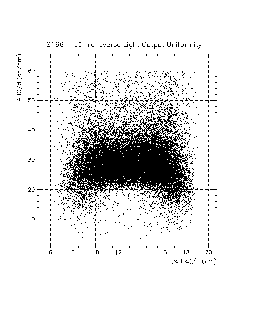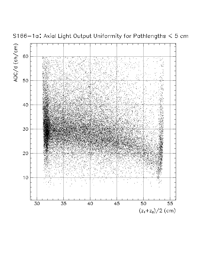 Light output per unit pathlength in the crystal (s/d) is plotted as a function of z-position in the crystal. The front face of the crystal corresponds to z=0 cm, while the back of the crystal is z=22 cm. The nonuniformity constant is equal to the slope of this scatter plot, divided by the average value of s/d in the region of interest. Using this definition, a negative axial nonuniformity corresponds to a decreasing value of s/d from z=0 to s=22 cm.
