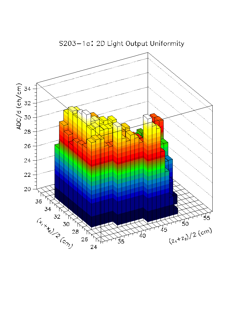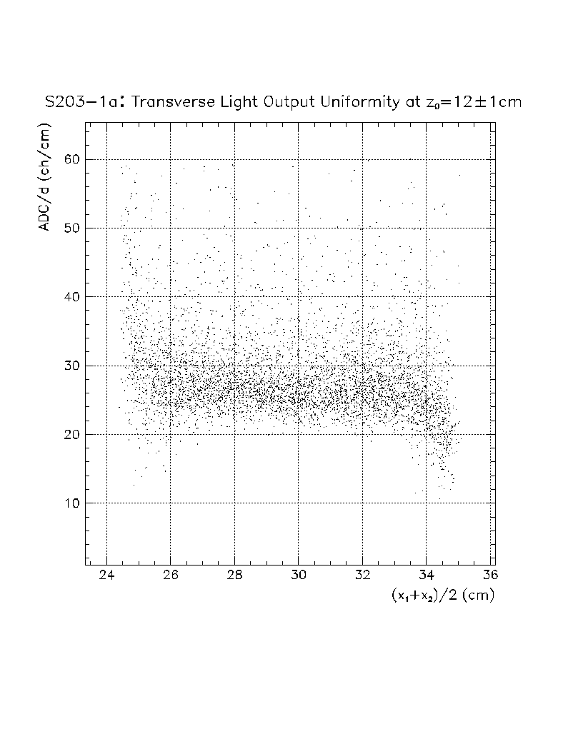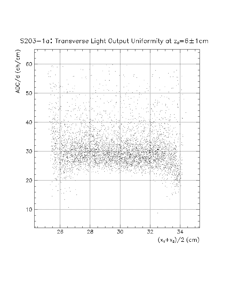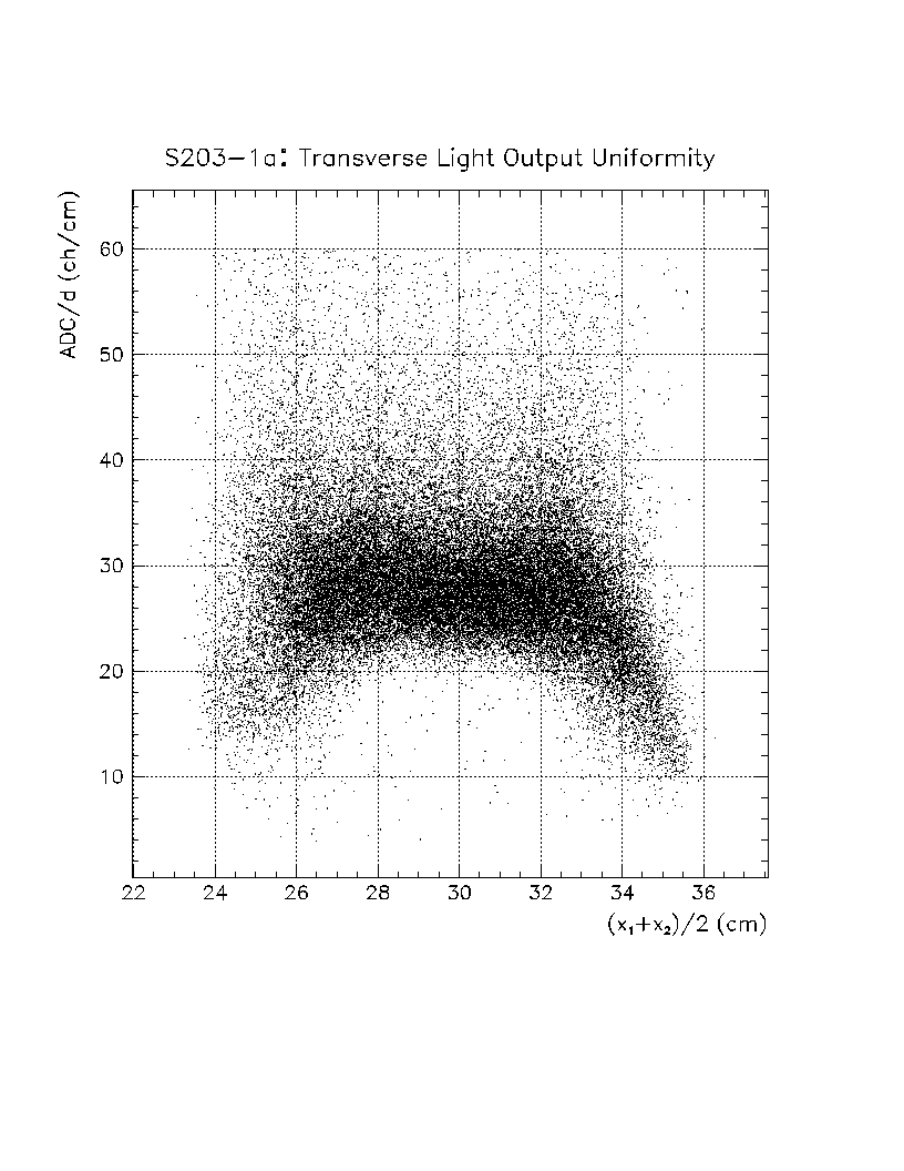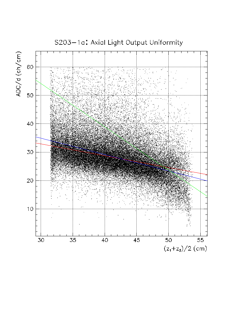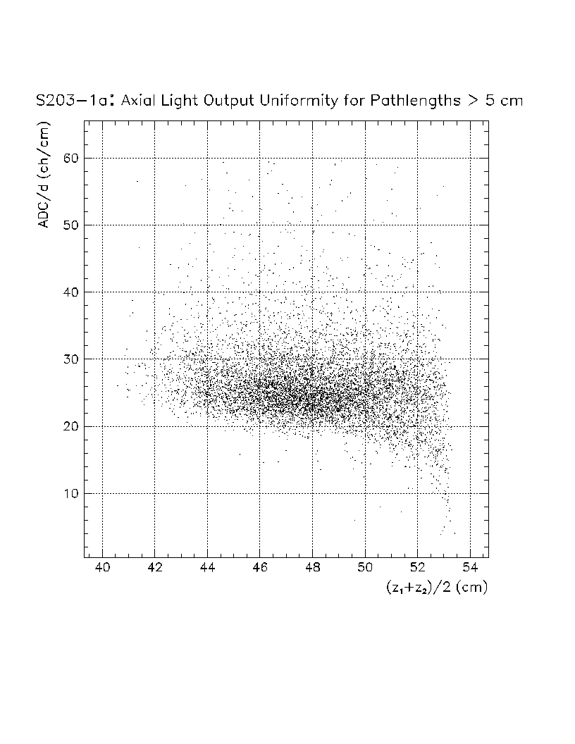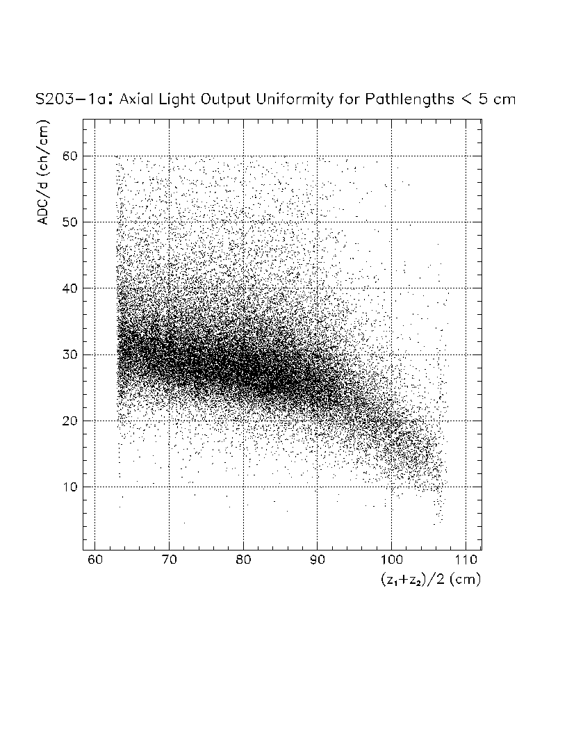 Light output per unit pathlength in the crystal (s/d) is plotted as a function of z-position in the crystal. The front face of the crystal corresponds to z=0 cm, while the back of the crystal is z=22 cm. The nonuniformity constant is equal to the slope of this scatter plot, divided by the average value of s/d in the region of interest. Using this definition, a negative axial nonuniformity corresponds to a decreasing value of s/d from z=0 to s=22 cm.