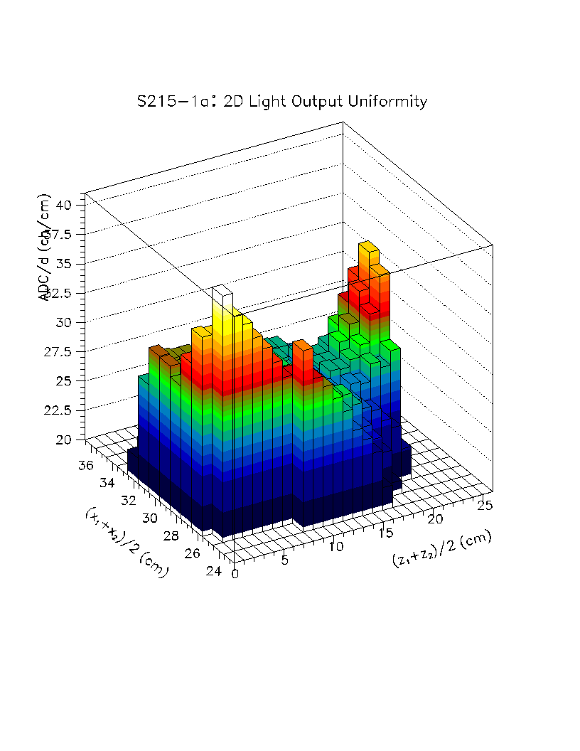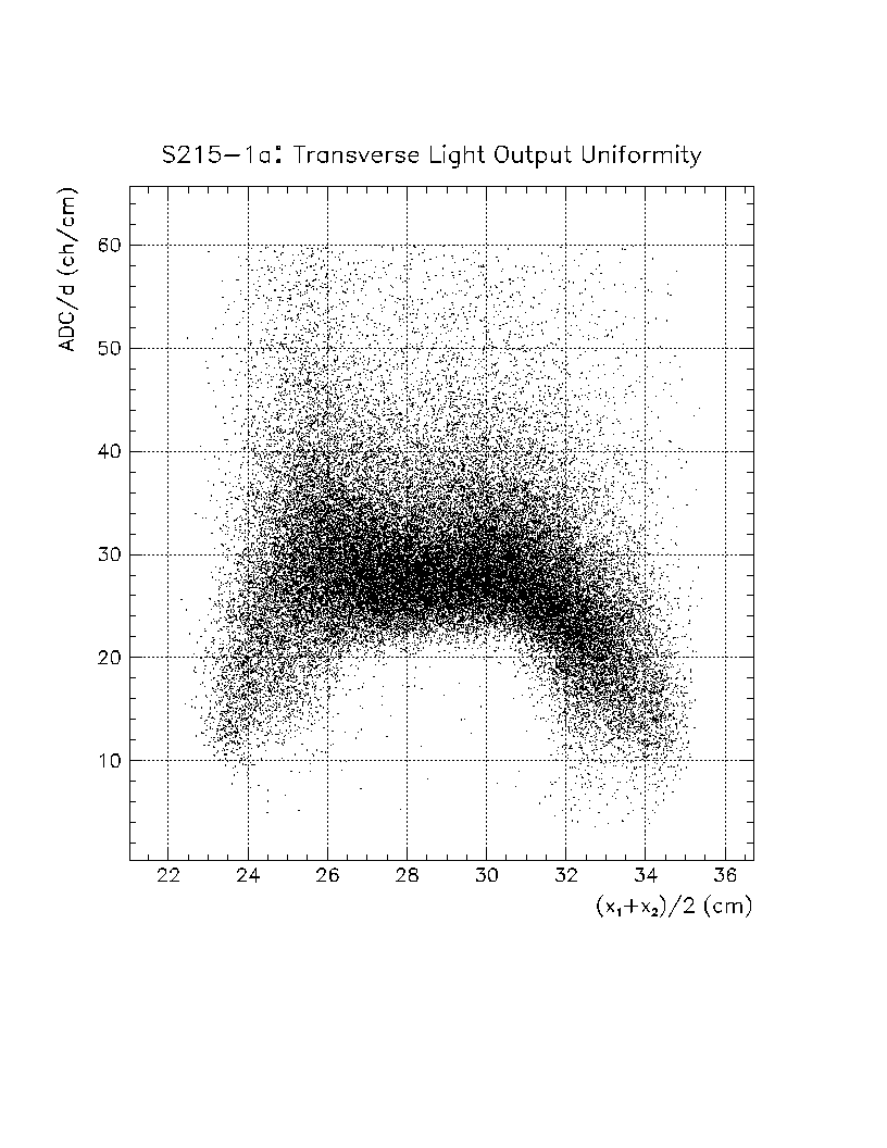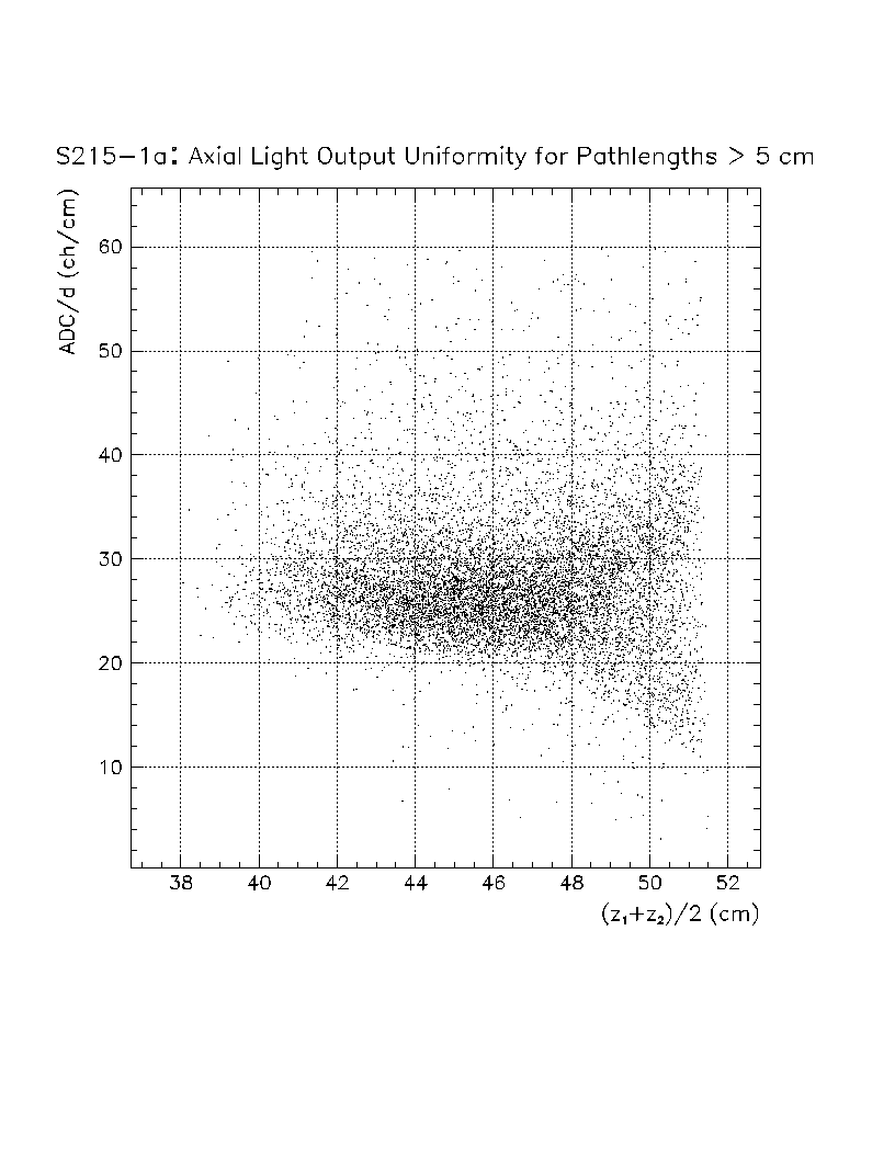 Light output per unit pathlength in the crystal (s/d) is plotted as a function of z-position in the crystal. The front face of the crystal corresponds to z=0 cm, while the back of the crystal is z=22 cm. The nonuniformity constant is equal to the slope of this scatter plot, divided by the average value of s/d in the region of interest. Using this definition, a negative axial nonuniformity corresponds to a decreasing value of s/d from z=0 to s=22 cm.