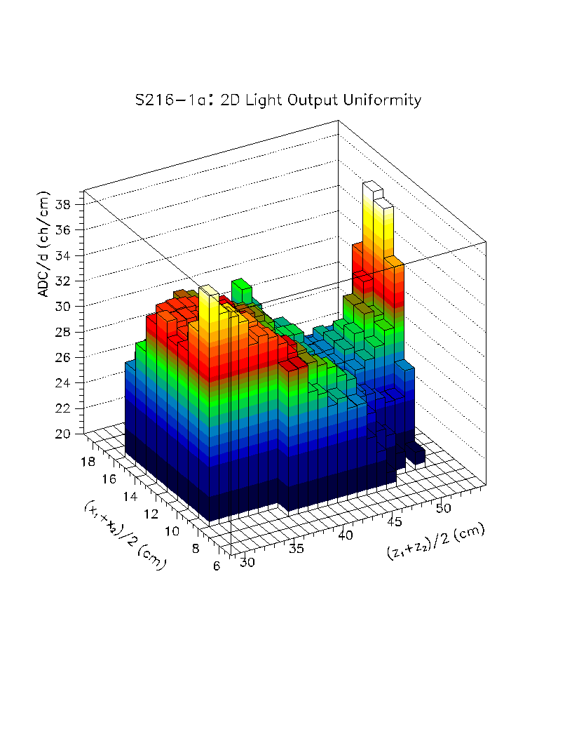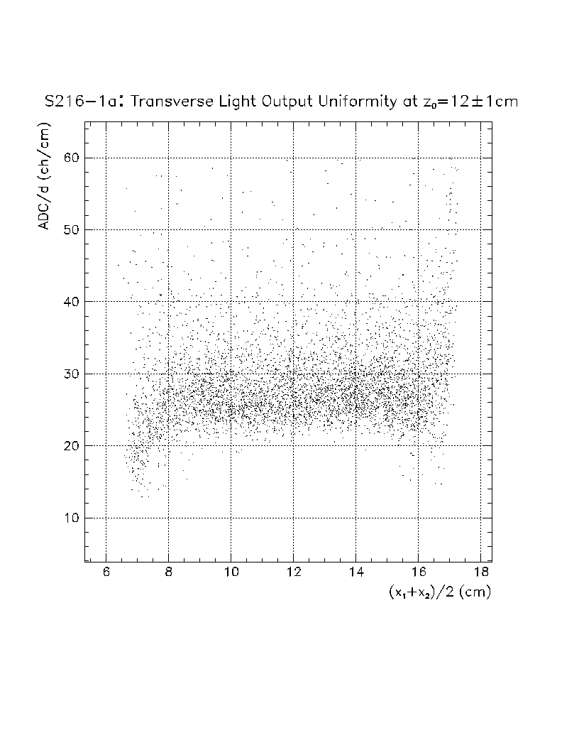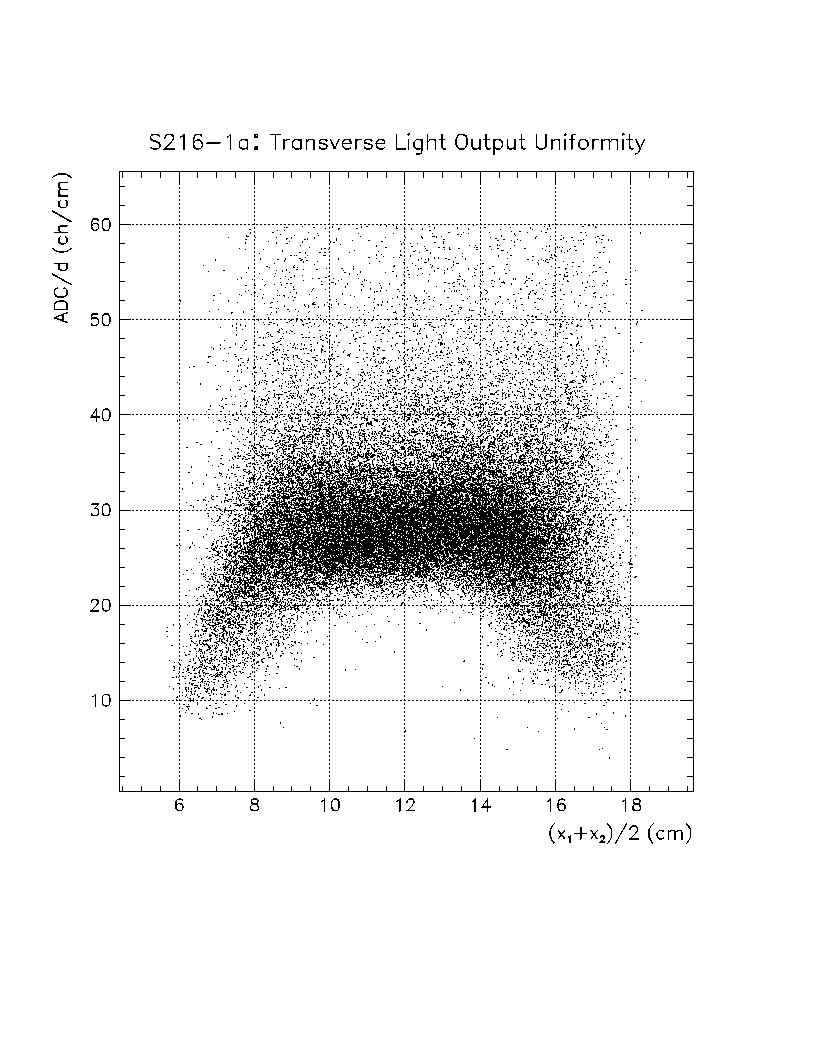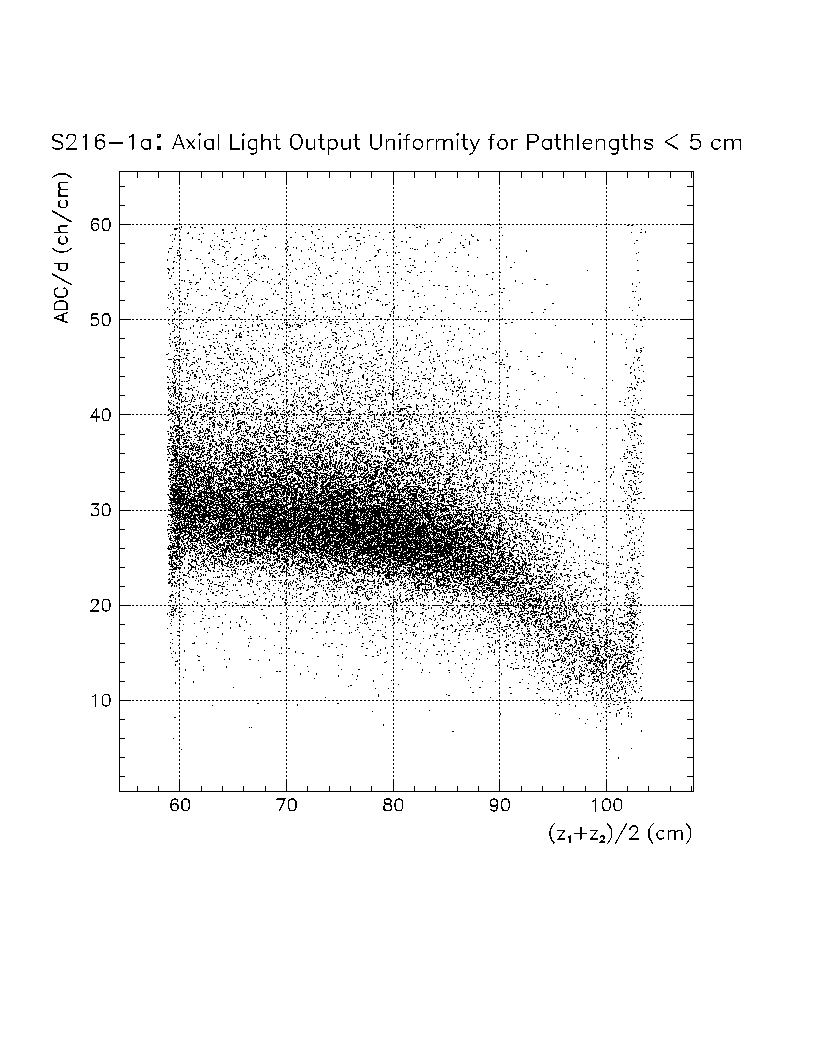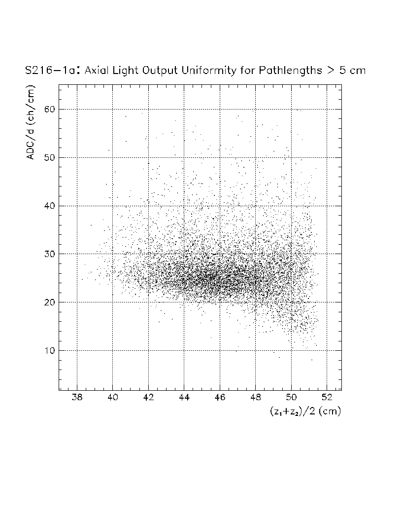 Light output per unit pathlength in the crystal (s/d) is plotted as a function of z-position in the crystal. The front face of the crystal corresponds to z=0 cm, while the back of the crystal is z=22 cm. The nonuniformity constant is equal to the slope of this scatter plot, divided by the average value of s/d in the region of interest. Using this definition, a negative axial nonuniformity corresponds to a decreasing value of s/d from z=0 to s=22 cm.