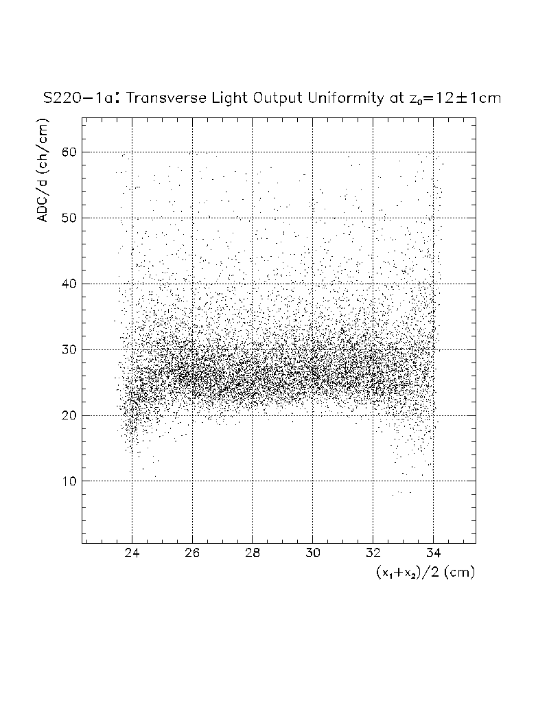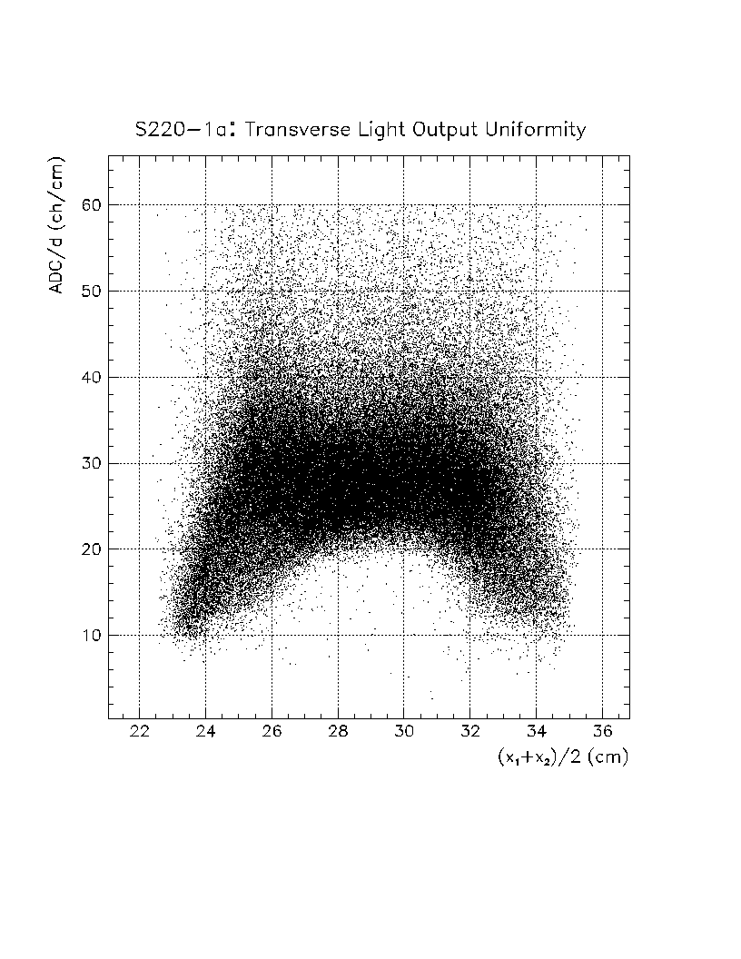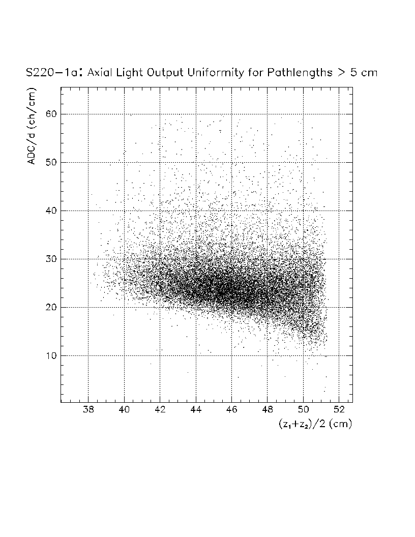 Light output per unit pathlength in the crystal (s/d) is plotted as a function of z-position in the crystal. The front face of the crystal corresponds to z=0 cm, while the back of the crystal is z=22 cm. The nonuniformity constant is equal to the slope of this scatter plot, divided by the average value of s/d in the region of interest. Using this definition, a negative axial nonuniformity corresponds to a decreasing value of s/d from z=0 to s=22 cm.