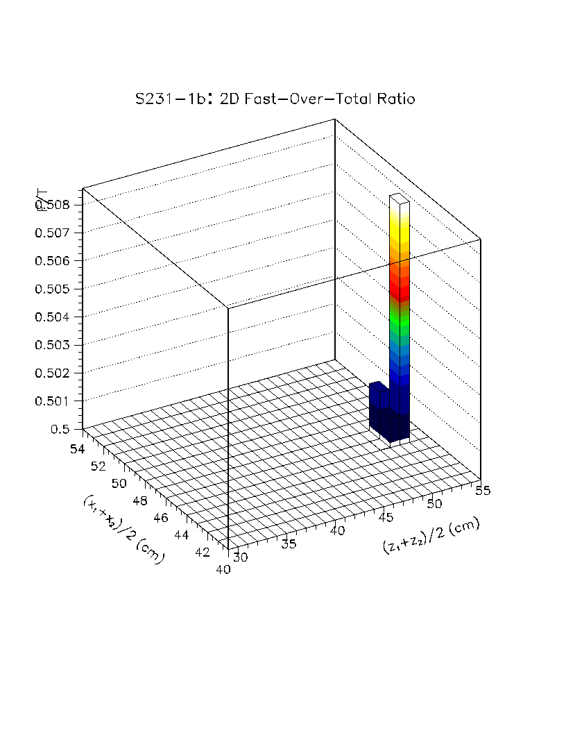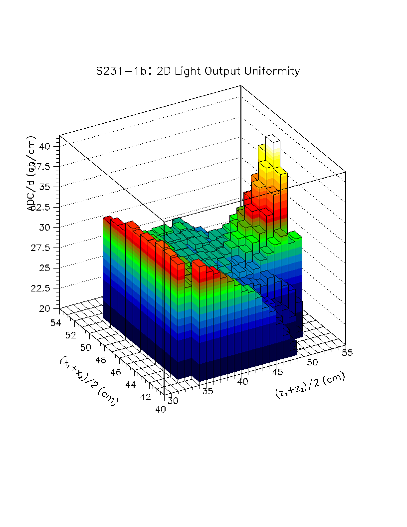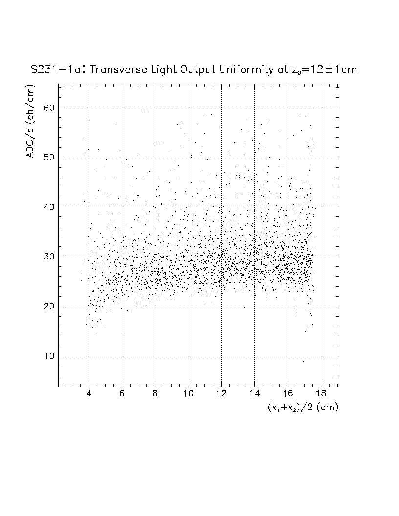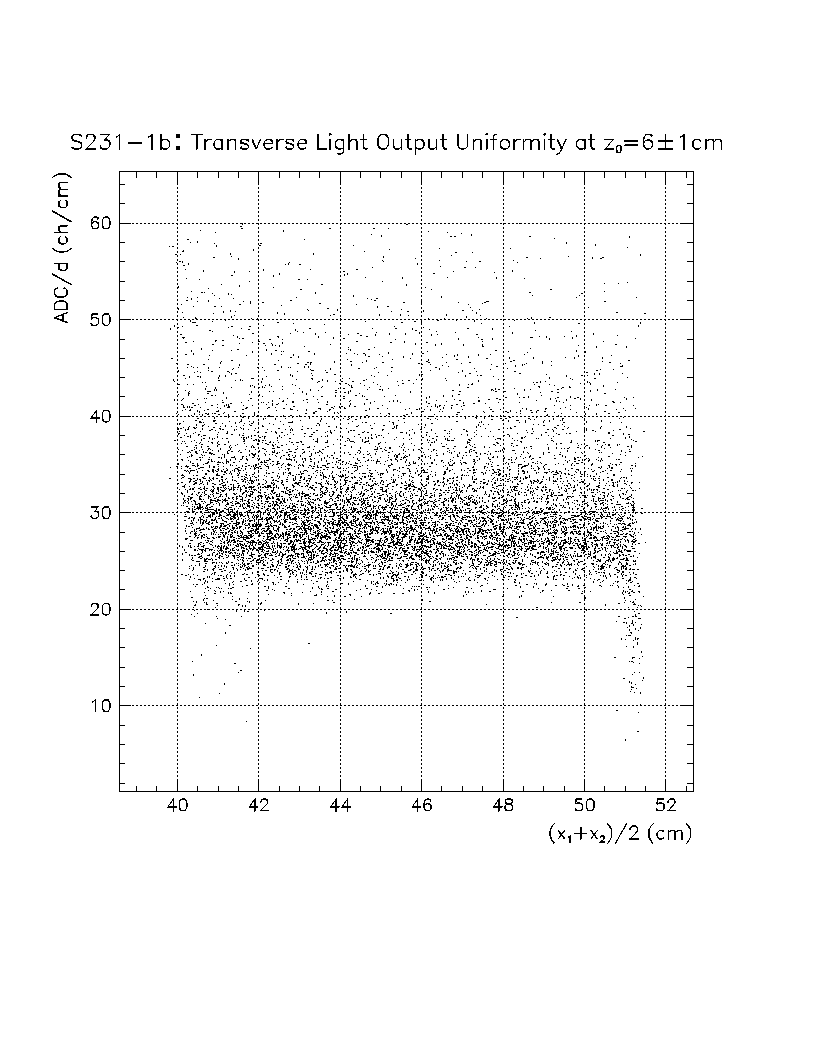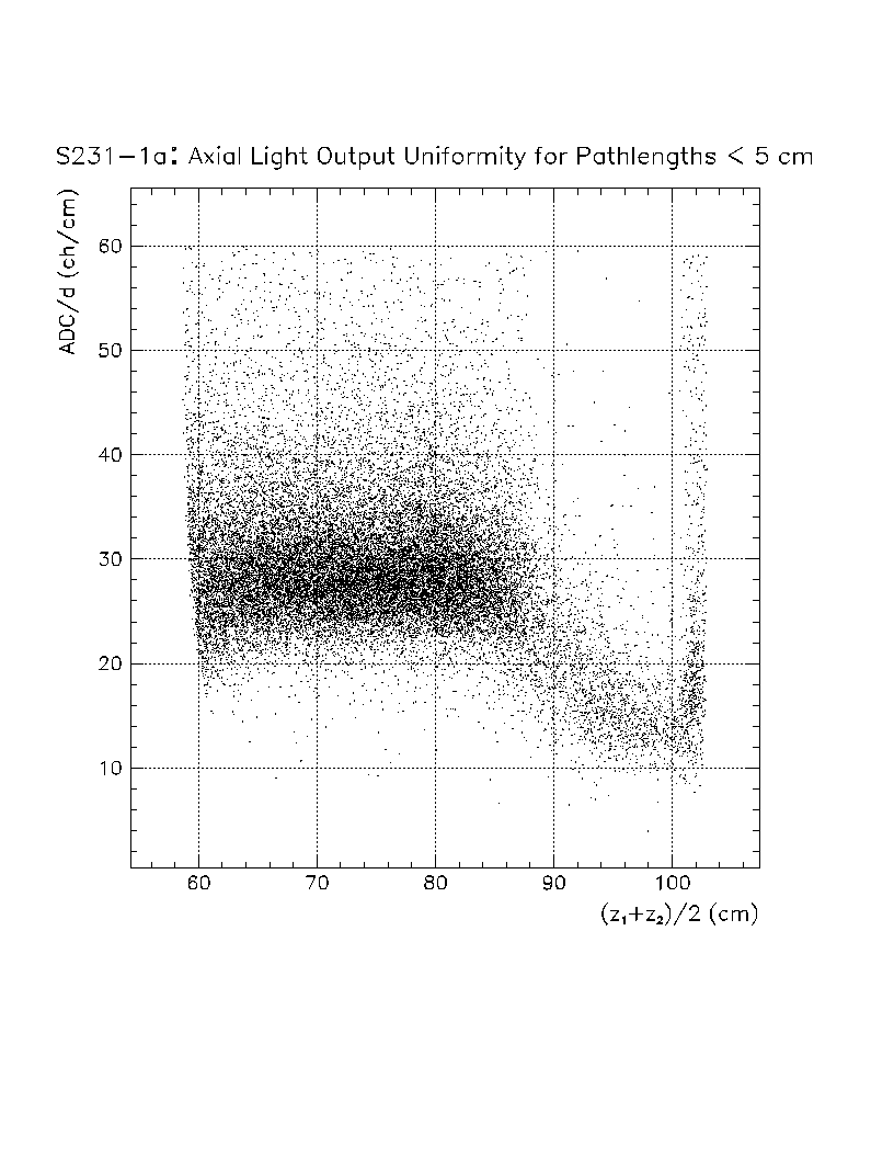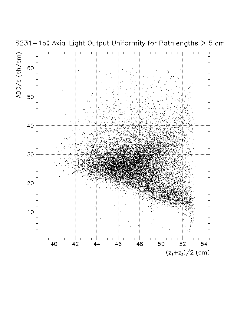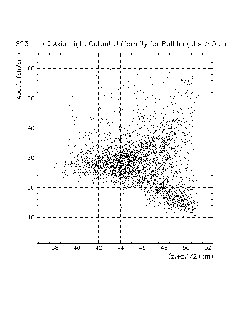 Light output per unit pathlength in the crystal (s/d) is plotted as a function of z-position in the crystal. The front face of the crystal corresponds to z=0 cm, while the back of the crystal is z=22 cm. The nonuniformity constant is equal to the slope of this scatter plot, divided by the average value of s/d in the region of interest. Using this definition, a negative axial nonuniformity corresponds to a decreasing value of s/d from z=0 to s=22 cm.