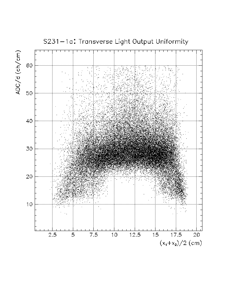 "s/d" is plotted as a function of x-position in the crystal. Looking at the back face of the crystal, the positive x-axis points to the right. The nonuniformity constant is equal to the slope of the scatter plot, divided by the average value of s/d in the region of interest. A negative transverse nonuniformity on the right side of the crystal corresponds to a decreasing value of s/d from the center to the edge of the crystal, while a positive transverse nonuniformity on the left side of the crystal means that s/d increases toward the center.