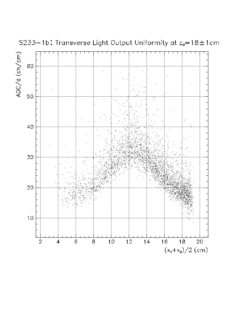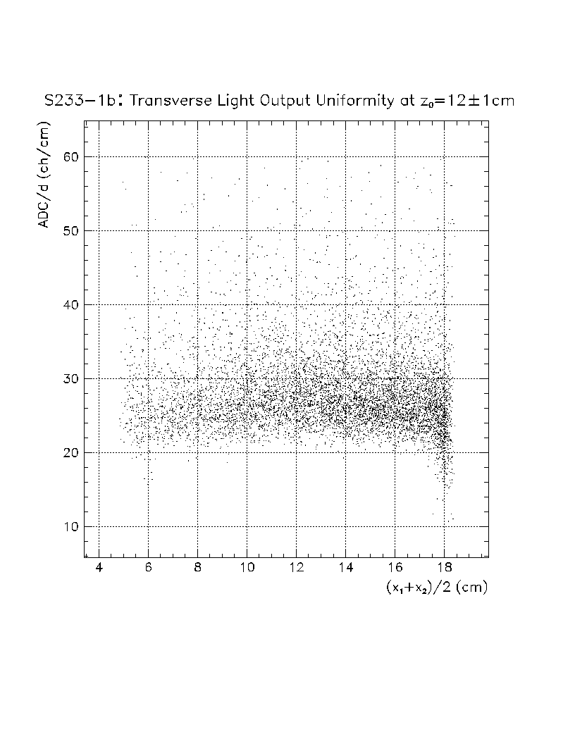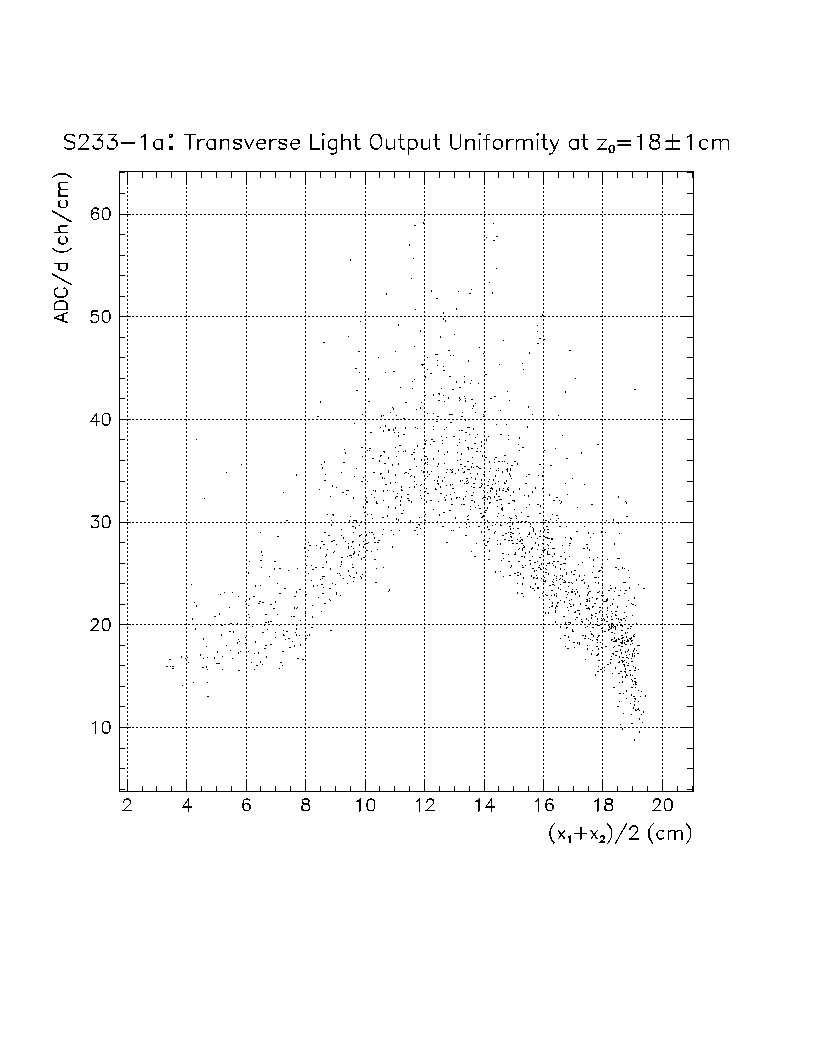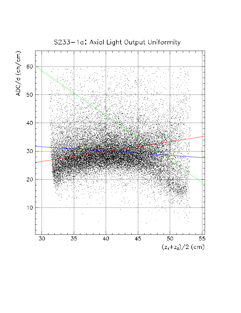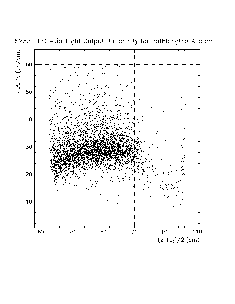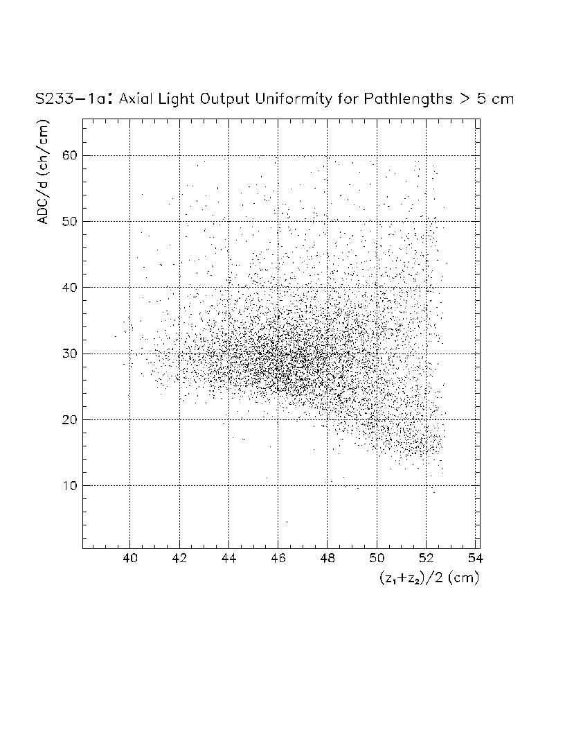 Light output per unit pathlength in the crystal (s/d) is plotted as a function of z-position in the crystal. The front face of the crystal corresponds to z=0 cm, while the back of the crystal is z=22 cm. The nonuniformity constant is equal to the slope of this scatter plot, divided by the average value of s/d in the region of interest. Using this definition, a negative axial nonuniformity corresponds to a decreasing value of s/d from z=0 to s=22 cm.