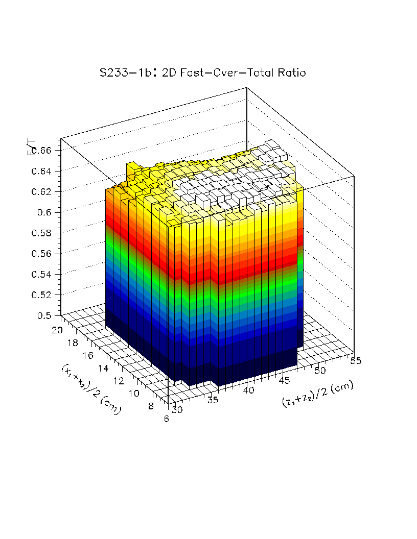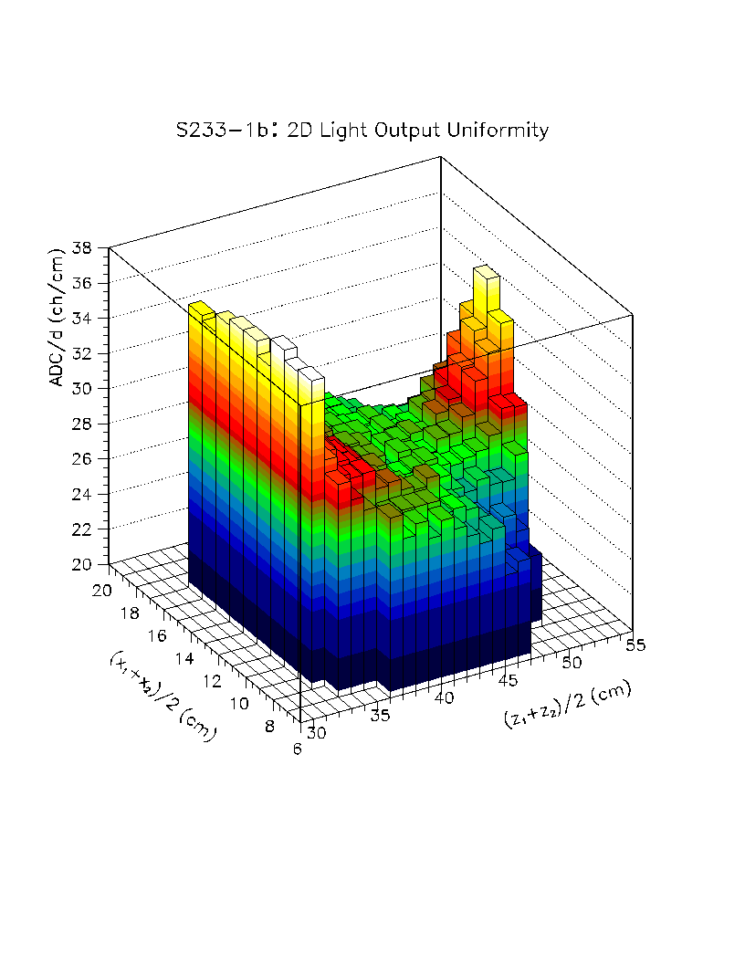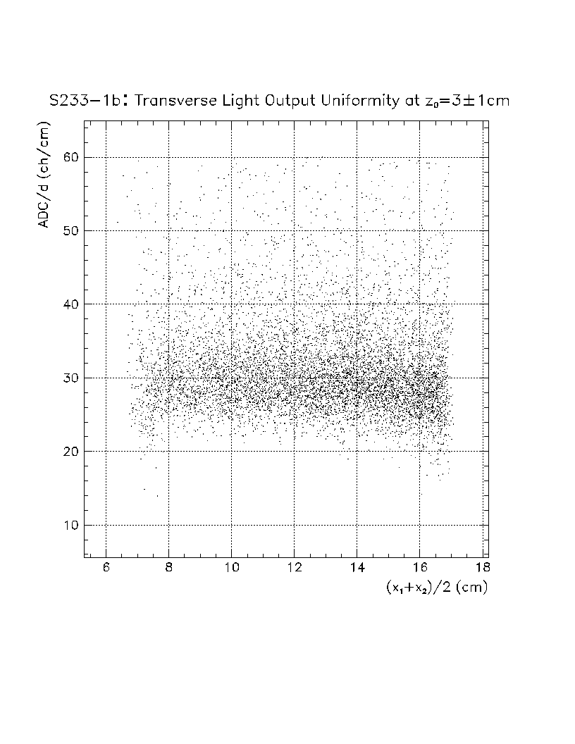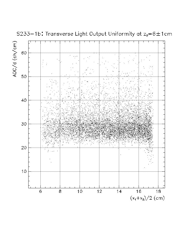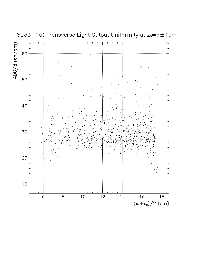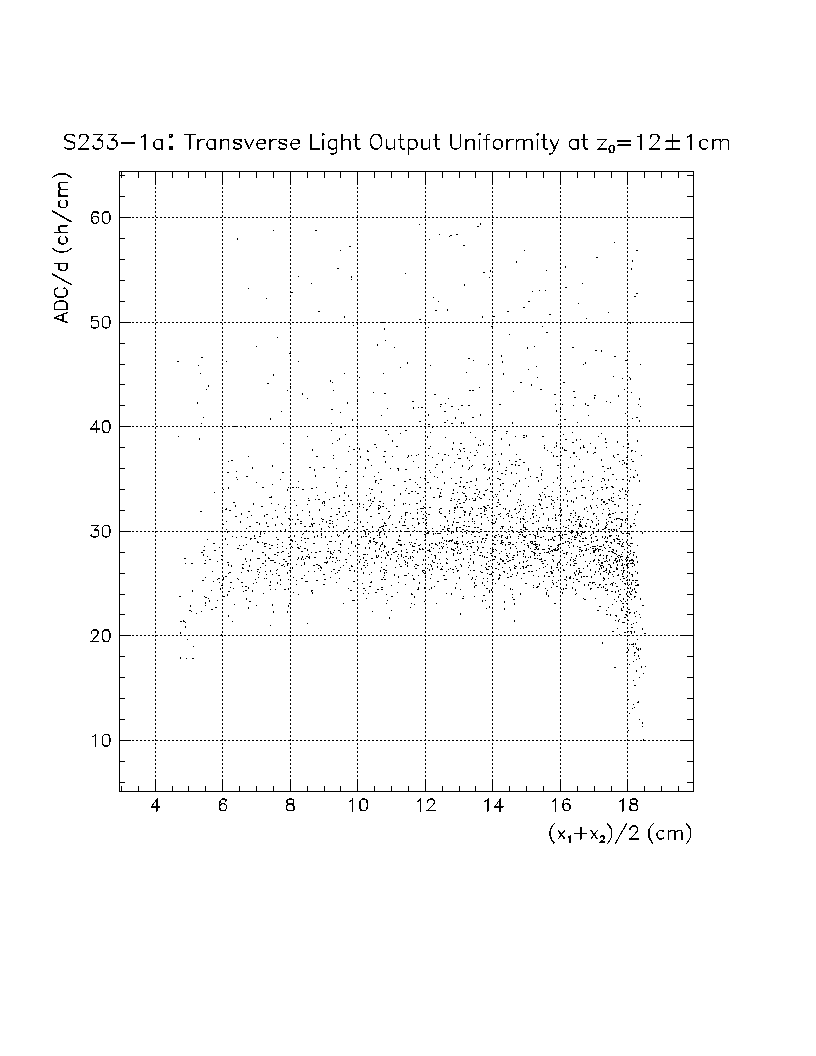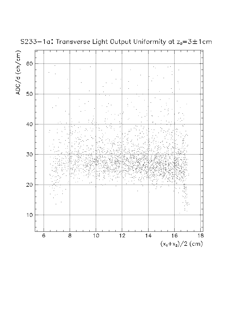 Light output per unit pathlength in the crystal (s/d) is plotted as a function of z-position in the crystal. The front face of the crystal corresponds to z=0 cm, while the back of the crystal is z=22 cm. The nonuniformity constant is equal to the slope of this scatter plot, divided by the average value of s/d in the region of interest. Using this definition, a negative axial nonuniformity corresponds to a decreasing value of s/d from z=0 to s=22 cm.