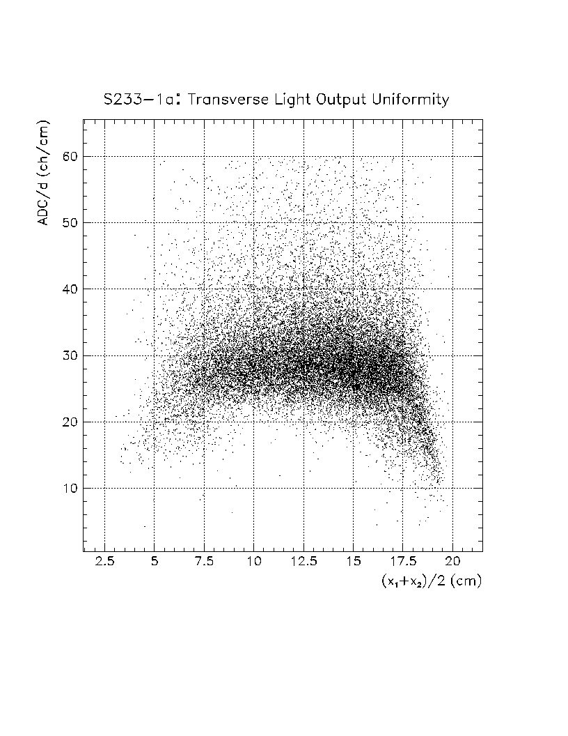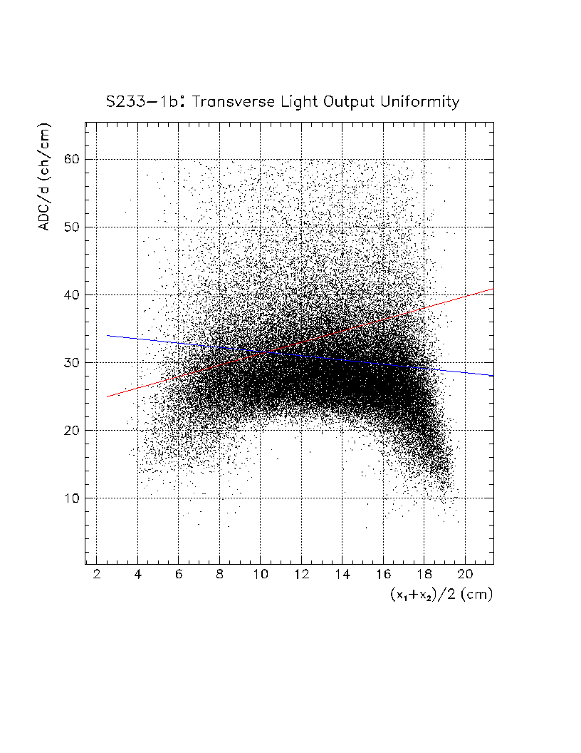 "s/d" is plotted as a function of x-position in the crystal. Looking at the back face of the crystal, the positive x-axis points to the right. The nonuniformity constant is equal to the slope of the scatter plot, divided by the average value of s/d in the region of interest. A negative transverse nonuniformity on the right side of the crystal corresponds to a decreasing value of s/d from the center to the edge of the crystal, while a positive transverse nonuniformity on the left side of the crystal means that s/d increases toward the center.